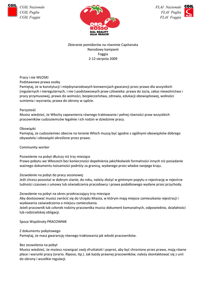 CGIL Nazionale CGIL Puglia CGIL Foggia FLAI Nazionale FLAI Puglia FLAI Foggia Zbieranie pomidorów na równinie Capitanata Narodowy kampanii Foggia 2‐12 sierpnia 2009 Pracy i nie WŁOSKI Podstawowe prawa osoby Pamiętaj, że w konstytucji i międzynarodowych konwencjach gwarancji przez prawo dla wszystkich (regularnych i nieregularnych, i nie‐) podstawowych praw człowieka: prawa do życia, zakaz niewolnictwa i pracy przymusowej, prawo do wolności, bezpieczeństwa, zdrowia, edukacji obowiązkowej, wolności sumienia i wyznania, prawa do obrony w sądzie. Parzystość Musisz wiedzieć, że Włochy zapewnienia równego traktowania i pełnej równości praw wszystkich pracowników cudzoziemców legalnie i ich rodzin w dziedzinie pracy. Obowiązki Pamiętaj, że cudzoziemiec obecne na terenie Włoch muszą być zgodne z ogólnymi obowiązków dobrego obywatela i obowiązki określone przez prawo. Community worker Pozwolenie na pobyt dłuższy niż trzy miesiące Prawo pobytu we Włoszech bez konieczności dopełnienia jakichkolwiek formalności innych niż posiadanie ważnego dokumentu tożsamości podróży za granicą, wydanego przez władze swojego kraju. Zezwolenie na pobyt do pracy sezonowej Jeśli chcesz pozostać w dobrym stanie, do roku, należy złożyć w gminnym popytu o rejestrację w rejestrze ludności czasowo z umowy lub oświadczenia pracodawcy i prawa podatkowego wydane przez przychody. Zezwolenie na pobyt na okres przekraczający trzy miesiące Aby dostosować musisz zwrócić się do Urzędu Miasta, w którym mają miejsce zamieszkania rejestracji i wydawania zaświadczenia o miejscu zamieszkania. Jeżeli pracownik lub członek rodziny pracownika musisz dokument komunalnych, odpowiednio, działalności lub rodzicielskiej obligacji. Spoza Wspólnoty PRACOWNIK Z dokumentu pobytowego Pamiętaj, że masz gwarancję równego traktowania jak włoski pracowników. Bez zezwolenia na pobyt Musisz wiedzieć, że możesz rozwiązać swój sfruttatoti i poproś, aby być chronione przez prawo, mają równe płace i warunki pracy (orario. Riposo, itp.). Jak każdy prawnej pracowników, należy skontaktować się z unii do obrony i wszelkie regulacji.