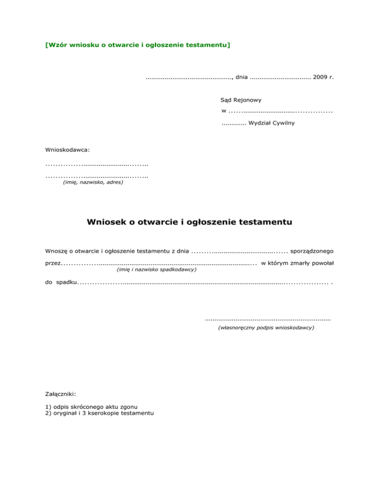 [Wzór wniosku o otwarcie i ogłoszenie testamentu] ............................................., dnia ................................ 2009 r. Sąd Rejonowy w ……...........................…………… ............. Wydział Cywilny Wnioskodawca: ……………........................…….. ……………........................…….. (imię, nazwisko, adres) Wniosek o otwarcie i ogłoszenie testamentu Wnoszę o otwarcie i ogłoszenie testamentu z dnia ………...............................…… sporządzonego przez……………...............................................................................… w którym zmarły powołał (imię i nazwisko spadkodawcy) do spadku………………....................................................................................……………… . .................................................................. (własnoręczny podpis wnioskodawcy) Załączniki: 1) odpis skróconego aktu zgonu 2) oryginał i 3 kserokopie testamentu