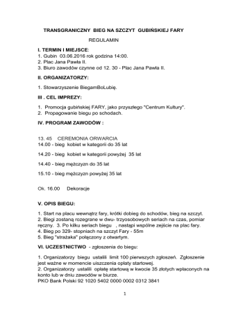 TRANSGRANICZNY BIEG NA SZCZYT GUBIŃSKIEJ FARY REGULAMIN I. TERMIN I MIEJSCE: 1. Gubin 03.06.2016 rok godzina 14:00. 2. Plac Jana Pawła II. 3. Biuro zawodów czynne od 12. 30 - Plac Jana Pawła II. II. ORGANIZATORZY: 1. Stowarzyszenie BiegamBoLubię. III . CEL IMPREZY: 1. Promocja gubińskiej FARY, jako przyszłego "Centrum Kultury". 2. Propagowanie biegu po schodach. IV. PROGRAM ZAWODÓW : 13. 45 CEREMONIA ORWARCIA 14.00 - bieg kobiet w kategorii do 35 lat 14.20 - bieg kobiet w kategorii powyżej 35 lat 14.40 - bieg mężczyzn do 35 lat 15.10 - bieg mężczyzn powyżej 35 lat Ok. 16.00 Dekoracje V. OPIS BIEGU: 1. Start na placu wewnątrz fary, krótki dobieg do schodów, bieg na szczyt. 2. Biegi zostaną rozegrane w dwu- trzyosobowych seriach na czas, pomiar ręczny. 3. Po kilku seriach biegu , nastąpi wspólne zejście na plac fary. 4. Bieg po 329- stopniach na szczyt Fary - 55m 5. Bieg "strażaka" połączony z otwartym. VI. UCZESTNICTWO - zgłoszenia do biegu: 1. Organizatorzy biegu ustalili limit 100 pierwszych zgłoszeń. Zgłoszenie jest ważne w momencie uiszczenia opłaty startowej. 2. Organizatorzy ustalili opłatę startową w kwocie 35 złotych wpłaconych na konto lub w dniu zawodów w biurze. PKO Bank Polski 92 1020 5402 0000 0002 0312 3841 1 3. W biegu prawo startu mają zawodnicy, którzy ukończyli 16 lat, zapisali się i dokonali opłaty startowej. 4. Numery startowe i pobieramy przy weryfikacji w biurze zawodów. 5. Każdy uczestnik biegu podpisuje deklarację (na karcie startowej) o braku przeciwwskazań lekarskich do brania udziału w biegach - (Rozp. Min. Eduk.Na.z dnia 12.09.2001r.Dz.Ust.Nr 101 pozycja 1). VII. NAGRODY i inne 1. Puchary i statuetki za miejsca 1-3 w kategoriach kobiet, mężczyzn i strażaków. 2. Każdy uczestnik biegu otrzyma medal uczestnictwa . 3. Organizator przewiduje puchar dla najstarszego uczestnika biegu. VIII . Postanowienia końcowe: 1. Organizatorzy zapewniają opiekę lekarską. 2. Uczestnicy biegu startują na własną odpowiedzialność, nie będą ubezpieczeni przez organizatora od nieszczęśliwych wypadków. 3. Pobranie numeru startowego jest równoznaczne z akceptacją regulaminu biegu. 4. Prawo interpretacji niniejszego regulaminu przysługuje organizatorom. XI. Kontakt: Adam Kaczmarek 696-239-735 Roman Kwapich 693-346-711 2