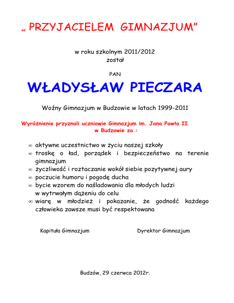 „ PRZYJACIELEM GIMNAZJUM” w roku szkolnym 2011/2012 został PAN WŁADYSŁAW PIECZARA Woźny Gimnazjum w Budzowie w latach 1999-2011 Wyróżnienie przyznali uczniowie Gimnazjum im. Jana Pawła II w Budzowie za : • aktywne uczestnictwo w życiu naszej szkoły • troskę o ład, porządek i bezpieczeństwo • • • • na terenie gimnazjum życzliwość i roztaczanie wokół siebie pozytywnej aury poczucie humoru i pogodę ducha bycie wzorem do naśladowania dla młodych ludzi w wytrwałym dążeniu do celu wiarę w młodzież i pokazanie, że godność każdego człowieka zawsze musi być respektowana Kapituła Gimnazjum Dyrektor Gimnazjum Budzów, 29 czerwca 2012r.