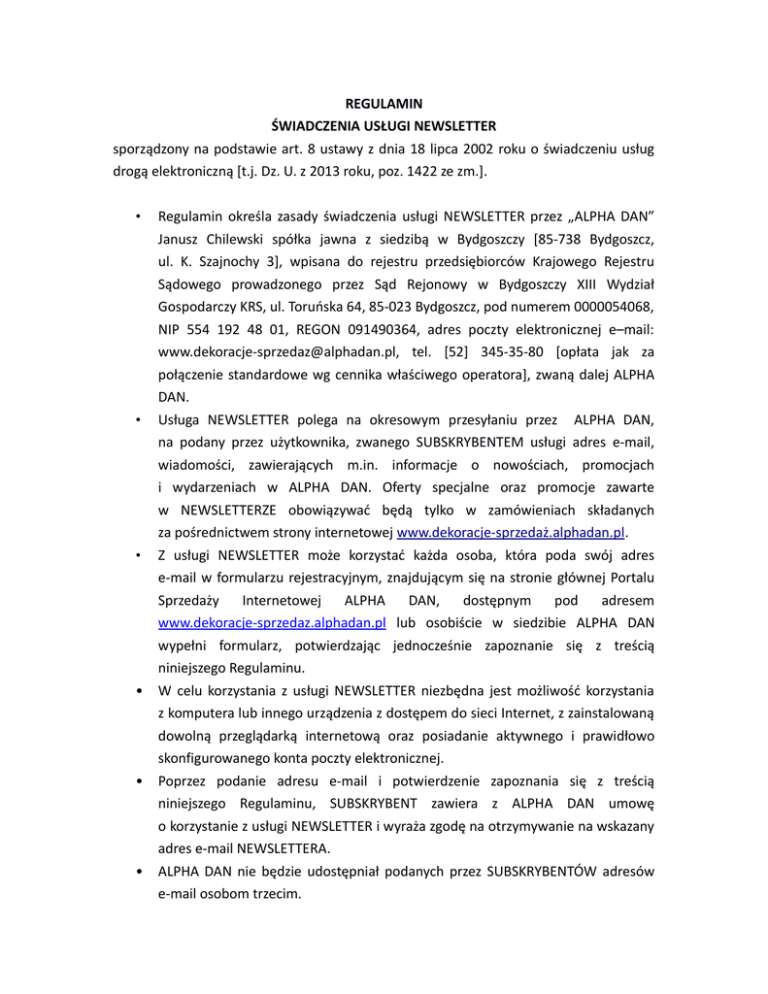 REGULAMIN ŚWIADCZENIA USŁUGI NEWSLETTER sporządzony na podstawie art. 8 ustawy z dnia 18 lipca 2002 roku o świadczeniu usług drogą elektroniczną [t.j. Dz. U. z 2013 roku, poz. 1422 ze zm.]. • • • • • • Regulamin określa zasady świadczenia usługi NEWSLETTER przez „ALPHA DAN” Janusz Chilewski spółka jawna z siedzibą w Bydgoszczy [85-738 Bydgoszcz, ul. K. Szajnochy 3], wpisana do rejestru przedsiębiorców Krajowego Rejestru Sądowego prowadzonego przez Sąd Rejonowy w Bydgoszczy XIII Wydział Gospodarczy KRS, ul. Toruńska 64, 85-023 Bydgoszcz, pod numerem 0000054068, NIP 554 192 48 01, REGON 091490364, adres poczty elektronicznej e–mail: [email protected], tel. [52] 345-35-80 [opłata jak za połączenie standardowe wg cennika właściwego operatora], zwaną dalej ALPHA DAN. Usługa NEWSLETTER polega na okresowym przesyłaniu przez ALPHA DAN, na podany przez użytkownika, zwanego SUBSKRYBENTEM usługi adres e-mail, wiadomości, zawierających m.in. informacje o nowościach, promocjach i wydarzeniach w ALPHA DAN. Oferty specjalne oraz promocje zawarte w NEWSLETTERZE obowiązywać będą tylko w zamówieniach składanych za pośrednictwem strony internetowej www.dekoracje-sprzedaż.alphadan.pl. Z usługi NEWSLETTER może korzystać każda osoba, która poda swój adres e-mail w formularzu rejestracyjnym, znajdującym się na stronie głównej Portalu Sprzedaży Internetowej ALPHA DAN, dostępnym pod adresem www.dekoracje-sprzedaz.alphadan.pl lub osobiście w siedzibie ALPHA DAN wypełni formularz, potwierdzając jednocześnie zapoznanie się z treścią niniejszego Regulaminu. W celu korzystania z usługi NEWSLETTER niezbędna jest możliwość korzystania z komputera lub innego urządzenia z dostępem do sieci Internet, z zainstalowaną dowolną przeglądarką internetową oraz posiadanie aktywnego i prawidłowo skonfigurowanego konta poczty elektronicznej. Poprzez podanie adresu e-mail i potwierdzenie zapoznania się z treścią niniejszego Regulaminu, SUBSKRYBENT zawiera z ALPHA DAN umowę o korzystanie z usługi NEWSLETTER i wyraża zgodę na otrzymywanie na wskazany adres e-mail NEWSLETTERA. ALPHA DAN nie będzie udostępniał podanych przez SUBSKRYBENTÓW adresów e-mail osobom trzecim. • • • • • • • • • • Usługa NEWSLETTER jest bezpłatna. Umowa o świadczenie usługi NEWSLETTER zostaje zawarta na czas nieokreślony. Rozpoczęcie świadczenia usługi NEWSLETTER nastąpi niezwłocznie po zawarciu umowy. Każda ze stron ma prawo wypowiedzieć umowę o świadczenie usługi NEWSLETTER, ze skutkiem natychmiastowym. SUBSKRYBENT może zrezygnować z usługi NEWSLETTER poprzez: • kliknięcie przycisku "Zapisz/Wypisz" na stronie www.dekoracje-sprzedaz.alphadan.pl; • kliknięcie w link "możesz się wypisać" zamieszczony w każdej wiadomości otrzymanej od ALPHA DAN; • skierowanie oświadczenia na adres e-mail: [email protected]; • złożenie pisemnego oświadczenia w siedzibie ALPHA DAN. Wszelkie reklamacje związane z usługą NEWSLETTER należy składać: • na adres e-mail: [email protected]; • telefonicznie, od poniedziałku do piątku w godzinach od 8.00 do 16.00 pod numerem telefonu 519 690 161; • pisemnie na adres ALPHA DAN podany w niniejszym Regulaminie. Zgłoszenie reklamacyjne powinno zawierać w szczególności: • opis nieprawidłowości w usłudze NEWSLETTER świadczonej przez ALPHA DAN; • adres e-mail podany podczas rejestracji • dane niezbędne do przesłania informacji o wyniku rozpatrzenia reklamacji np. adres e-mail, numer telefonu lub adres korespondencyjny. Reklamacja zostanie rozpatrzona w ciągu 14 dni od dnia jej otrzymania. W trakcie korzystania z usługi NEWSLETTER zabronione jest dostarczanie, zarówno przez ALPHA DAN jaki i przez SUBSKRYBENTA, w szczególności w korespondencji z ALPHA DAN lub w formularzu rejestracyjnym, treści o charakterze bezprawnym. Regulamin wchodzi w życie z dniem 1 maja 2016 roku. Zmiana regulaminu może być dokonana w każdym czasie. Zmiana staje się skuteczna w terminie wskazanym przez ALPHA DAN, nie krótszym niż czternaście dni, od momentu udostępnienia na stronie portalu sprzedaży internetowej zmienionego regulaminu.