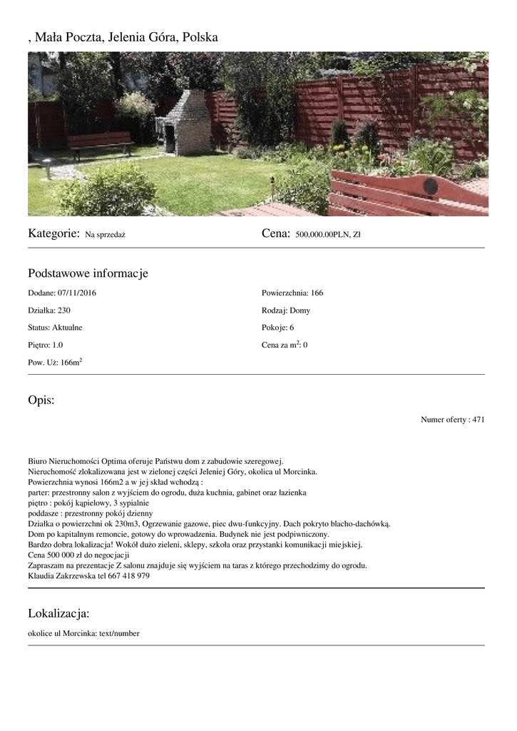 , Mała Poczta, Jelenia Góra, Polska Kategorie: Na sprzedaż Cena: 500,000.00PLN, Zł Podstawowe informacje Dodane: 07/11/2016 Powierzchnia: 166 Działka: 230 Rodzaj: Domy Status: Aktualne Pokoje: 6 Piętro: 1.0 Cena za m²: 0 Pow. Uż: 166m² Opis: Numer oferty : 471 Biuro Nieruchomości Optima oferuje Państwu dom z zabudowie szeregowej. Nieruchomość zlokalizowana jest w zielonej części Jeleniej Góry, okolica ul Morcinka. Powierzchnia wynosi 166m2 a w jej skład wchodzą : parter: przestronny salon z wyjściem do ogrodu, duża kuchnia, gabinet oraz łazienka piętro : pokój kąpielowy, 3 sypialnie poddasze : przestronny pokój dzienny Działka o powierzchni ok 230m3, Ogrzewanie gazowe, piec dwu-funkcyjny. Dach pokryto blacho-dachówką. Dom po kapitalnym remoncie, gotowy do wprowadzenia. Budynek nie jest podpiwniczony. Bardzo dobra lokalizacja! Wokół dużo zieleni, sklepy, szkoła oraz przystanki komunikacji miejskiej. Cena 500 000 zł do negocjacji Zapraszam na prezentacje Z salonu znajduje się wyjściem na taras z którego przechodzimy do ogrodu. Klaudia Zakrzewska tel 667 418 979 Lokalizacja: okolice ul Morcinka: text/number Szczegóły: Dodatkowe informacje: Gotowe do wprowadzenia! oddzielna kuchnia pełna własność Taras Powered by TCPDF (www.tcpdf.org)