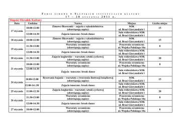 F E R I E Z I M O W E 1 7 S Ł U – 2 8 W P S K I C H I N S T Y T U C J A C H S T Y C Z N I A 2 0 11 R K U L T U R Y . Słupski Ośrodek Kultury Data Godzina 10:00-12:00 17 stycznia 12:00-14:30 18 stycznia 10:00-12:00 11:30-13:00 19 stycznia 12:00-14:30 20 stycznia 11:30-13:00 10:00-12:00 21 stycznia Nazwa Zimowe filcowanki – zajęcia z rękodzielnictwa (obowiązują zapisy) Zajęcia taneczne: break dance Zimowe filcowanki – zajęcia z rękodzielnictwa (obowiązują zapisy) Warsztaty ceramiczne (obowiązują zapisy) Zajęcia taneczne: break dance Zajęcia kuglarskie – warsztaty sztuki cyrkowej (obowiązują zapisy) Warsztaty ceramiczne (obowiązują zapisy) 12:00-14:30 Zajęcia taneczne: break dance 10:00-12:00 Rysowanie bajanie – warsztaty z tworzenia ilustracji książkowej (obowiązują zapisy) 12:00-14::30 Zajęcia taneczne: break dance 24 stycznia 25 stycznia 11:00-12:30 11:30-13:00 26 stycznia 27 stycznia Zajęcia kuglarskie - warsztaty sztuki cyrkowej (obowiązują zapisy) Warsztaty ceramiczne (obowiązują zapisy) 12:00-14:30 Zajęcia taneczne: break dance 10:00-12:00 Warsztaty ceramiczne (obowiązują zapisy) Miejsce SOK ul. Braci Gierymskich 1 Sala widowiskowa SOK ul. Braci Gierymskich 1 SOK ul. Braci Gierymskich 1 Pracownia ceramiczna ul. Wojska Polskiego 10a Sala widowiskowa SOK ul. Braci Gierymskich 1 Sala widowiskowa SOK ul. Braci Gierymskich 1 Pracownia ceramiczna ul. Wojska Polskiego 10a Liczba miejsc 15 15 8 20 8 Sala widowiskowa SOK ul. Braci Gierymskich 1 SOK ul. Braci Gierymskich 1 Sala widowiskowa SOK ul. Braci Gierymskich 1 Sala widowiskowa SOK ul. Braci Gierymskich 1 Pracownia ceramiczna ul. Wojska Polskiego 10a Sala widowiskowa SOK ul. Braci Gierymskich 1 Pracownia ceramiczna ul. Wojska Polskiego 10a 15 20 8 8 28 stycznia 12:00-14:30 Zajęcia taneczne: break dance Zawody taneczne Sala widowiskowa SOK ul. Braci Gierymskich 1 Informacje i zapisy na zajęcia tel. (0-59) 848 15 93 mail: [email protected] Słupski Ośrodek Kultury - organizator wypoczynku zimowego dzieci i młodzieży zastrzega sobie prawo wprowadzania zmian w/w harmonogramie. Zajęcia dofinansowane z budżetu Miasta Słupska w ramach realizacji zadań z zakresu Profilaktyki i Rozwiązywania Problemów Uzależnień. MŁODZIEŻOWE CENTRUM KULTURY W SŁUPSKU I Półkolonie dla dzieci ze szkół podstawowych 17-28.01. 2011 r. godz. 10.00-14.30 II Zajęcia muzyczne indywidualne (w godz. 10.00 -15.00) 1. Uzupełniające warsztaty gitarowe: 17- 28.01.2011 r. dla stałych uczestników zajęć: - gitara akustyczna, - gitara elektryczna, - gitara basowa. 2. Uzupełniające warsztaty wokalne dla stałych uczestników zajęć: 17-28.01.2011 r.: - emisja głosu, - praca z mikrofonem. 3. Zajęcia indywidualne otwarte: 17 - 28.01.2011 r. dla osób nieuczestniczących do tej pory w zajęciach organizowanych przez Dział Muzyczny Młodzieżowego Centrum Kultury (na zapisy). III Zajęcia teatralne 17-28.01.2011 r. - warsztaty teatralne dla dzieci uczestniczących w zimowych półkoloniach (emisja głosu, ćwiczenie dykcji, gry dramatyczne z tekstem), 17 -28.01.2011 r. – próby (dla stałej grupy teatralnej) do spektaklu „Tango” Sławomira Mrożka. IV Zajęcia plastyczne (17-28.01.2011 r., godz. 10.00-14.00) - otwarte Warsztaty plastyczne dla najmłodszych ( I-IV klasa SP). Świat bajek ukazany za pomocą różnych technik malarskich i plastycznych, Galeria Wyobraźni, czytanie bajek, oglądanie malarstwa dawnych mistrzów. V Warsztaty taneczne dla stałych uczestników zajęć Teatr Tańca ENZA – 17-22.01.11 r. godz. 8.00-15.00 VI IMPREZY otwarte: Turniej SCRABBLE dla młodzieży gimnazjalnej i ponadgimnazjalnej – 25.01.2011 r., godz. 10.00, Turniej warcabowy – 26.01.2011 r., godz.10.00. VII Projekcje filmowe dla dzieci (odpłatne): 17-23.01.11 r. - kino – projekcja filmu: „Mia i Migusie” 17-21.01.2011 r. godz. 11.00, 22-23.01.2011 r. godz. 16.00 24-30.01.11 r. - kino – projekcja filmu: „Zaplątani” 24-28.01.2011 r. godz. 11.00, 29-30.01.2011 r. godz. 16.00 Wszystkie zajęcia dla dzieci i młodzieży prowadzone będą od poniedziałku do piątku. Nieodpłatne projekcje dofinansowane dla świetlic środowiskowych z budżetu Miasta Słupska w ramach realizacji zadań z zakresu Profilaktyki i Rozwiązywania Problemów Uzależnień odbędą się w uzgodnieniu z pracownikami świetlic. Miejska Biblioteka Publiczna w Słupsku Data, godz. Miejsce Nazwa imprezy Opis W okresie ferii dostępne będą wystawy związane z aktualnymi rocznicami literackimi i kulturalnymi Wy s t a w y Krzysztof Kamil Filia nr 7 Baczyński – Wystawa z okazji 90. rocznicy urodzin Krzysztofa Kamila 22.01 Garncarska 6 przedstawiciel Baczyńskiego. pokolenia Kolumbów. styczeń Biblioteka Centralna Grodzka 3 Requiem dla Mozarta. Wystawa płyt, artykułów i książek z okazji 255 rocznicy urodzin i 220 rocznicy śmierci kompozytora. styczeń Filia nr 8 Braci Gierymskich 1 Zapach kawy i konwalii. Wystawa z okazji 35 rocznicy śmierci autorki powieści detektywistycznych Agaty Christie. styczeń Filia nr 8 Braci Gierymskich 1 Dzień Słupskiego Krajobrazu. Wystawa LOP. I m p r e z y czytelnicze i zajęcia z dziećmi 17.01 godz. 12.00 – 14.00 Kodeks Młodego Turysty. Pogadanka połączona z działaniami plastycznymi. 18.01 godz. 12.00 – 14.00 Mapy, też się czyta. Kształcenie umiejętności czytania z map oraz zajęcia plastyczne. 19.01 godz. 12.00 – 14.00 Turyści, a ochrona przyrody. Prezentacja multimedialna różnych form ochrony przyrody, zabawy ruchowe. 20.01 godz. 12.00 – 14.00 Z przewodnikiem i turyście lżej. Nabywanie umiejętności posługiwania się przewodnikiem turystycznym oraz zabawy ruchowe. 21.01 godz. 12.00 – 14.00 U babci jest słodko – u Dzidka, też. Zajęcia plastyczno - techniczne. Zimą w Dolinie Słupi. Zajęcia integracyjne mające na celu przybliżenie przyrody naszego regionu. 25.01 godz. 12.00 – 14.00 Wiosną w Dolinie Słupi. Zajęcia integracyjne mające na celu przybliżeni