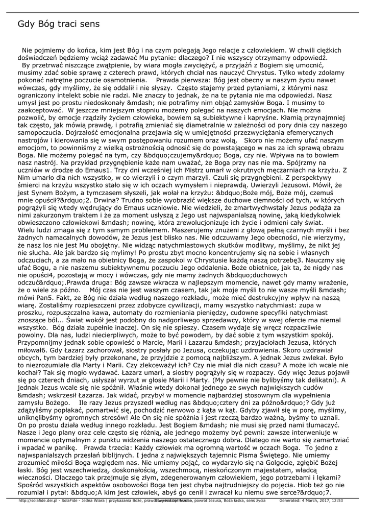 Gdy Bóg traci sens Nie pojmiemy do końca, kim jest Bóg i na czym polegają Jego relacje z człowiekiem. W chwili ciężkich doświadczeń będziemy wciąż zadawać Mu pytanie: dlaczego? I nie wszyscy otrzymamy odpowiedź. By przetrwać niszczące zwątpienie, by wiara mogła zwyciężyć, a przyjaźń z Bogiem się umocnić, musimy zdać sobie sprawę z czterech prawd, których chciał nas nauczyć Chrystus. Tylko wtedy zdołamy pokonać natrętne poczucie osamotnienia. Prawda pierwsza: Bóg jest obecny w naszym życiu nawet wówczas, gdy myślimy, że się oddalił i nie słyszy. Często stajemy przed pytaniami, z którymi nasz ograniczony intelekt sobie nie radzi. Nie znaczy to jednak, że na te pytania nie ma odpowiedzi. Nasz umysł jest po prostu niedoskonały — nie potrafimy nim objąć zamysłów Boga. I musimy to zaakceptować. W jeszcze mniejszym stopniu możemy polegać na naszych emocjach. Nie można pozwolić, by emocje rządziły życiem człowieka, bowiem są subiektywne i kapryśne. Kłamią przynajmniej tak często, jak mówią prawdę, i potrafią zmieniać się diametralnie w zależności od pory dnia czy naszego samopoczucia. Dojrzałość emocjonalna przejawia się w umiejętności przezwyciężania efemerycznych nastrojów i kierowania się w swym postępowaniu rozumem oraz wolą. Skoro nie możemy ufać naszym emocjom, to powinniśmy z wielką ostrożnością odnosić się do powstającego w nas za ich sprawą obrazu Boga. Nie możemy polegać na tym, czy „czujemy” Boga, czy nie. Wpływa na to bowiem nasz nastrój. Na przykład przygnębienie każe nam uważać, że Boga przy nas nie ma. Spójrzmy na uczniów w drodze do Emaus1. Trzy dni wcześniej ich Mistrz umarł w okrutnych męczarniach na krzyżu. Z Nim umarło dla nich wszystko, w co wierzyli i o czym marzyli. Czuli się przygnębieni. Z perspektywy śmierci na krzyżu wszystko stało się w ich oczach wymysłem i nieprawdą. Uwierzyli Jezusowi. Mówił, że jest Synem Bożym, a tymczasem słyszeli, jak wołał na krzyżu: „Boże mój, Boże mój, czemuś mnie opuścił?”2. Drwina? Trudno sobie wyobrazić większe duchowe ciemności od tych, w których pogrążyli się wtedy wędrujący do Emaus uczniowie. Nie wiedzieli, że zmartwychwstały Jezus podąża za nimi zakurzonym traktem i że za moment usłyszą z Jego ust najwspanialszą nowinę, jaką kiedykolwiek obwieszczono człowiekowi — nowinę, która zrewolucjonizuje ich życie i odmieni cały świat. Wielu ludzi zmaga się z tym samym problemem. Maszerujemy znużeni z głową pełną czarnych myśli i bez żadnych namacalnych dowodów, że Jezus jest blisko nas. Nie odczuwamy Jego obecności, nie wierzymy, że nasz los nie jest Mu obojętny. Nie widząc natychmiastowych skutków modlitwy, myślimy, że nikt jej nie słucha. Ale jak bardzo się mylimy! Po prostu zbyt mocno koncentrujemy się na sobie i własnych odczuciach, a za mało na obietnicy Boga, że zaspokoi w Chrystusie każdą naszą potrzebę3. Nauczmy się ufać Bogu, a nie naszemu subiektywnemu poczuciu Jego oddalenia. Boże obietnice, jak ta, że nigdy nas nie opuści4, pozostają w mocy i wówczas, gdy nie mamy żadnych „duchowych odczuć”.Prawda druga: Bóg zawsze wkracza w najlepszym momencie, nawet gdy mamy wrażenie, że o wiele za późno. Mój czas nie jest waszym czasem, tak jak moje myśli to nie wasze myśli — mówi Pan5. Fakt, ze Bóg nie działa według naszego rozkładu, może mieć destrukcyjny wpływ na naszą wiarę. Zostaliśmy rozpieszczeni przez zdobycze cywilizacji, mamy wszystko natychmiast: zupa w proszku, rozpuszczalna kawa, automaty do rozmieniania pieniędzy, cudowne specyfiki natychmiast znoszące ból... Świat wokół jest podobny do nadgorliwego sprzedawcy, który w swej ofercie ma niemal wszystko. Bóg działa zupełnie inaczej. On się nie spieszy. Czasem wydaje się wręcz rozpaczliwie powolny. Dla nas, ludzi niecierpliwych, może to być powodem, by dać sobie z tym wszystkim spokój. Przypomnijmy jednak sobie opowieść o Marcie, Marii i Łazarzu — przyjaciołach Jezusa, których miłował6. Gdy Łazarz zachorował, siostry posłały po Jezusa, oczekując uzdrowienia. Skoro uzdrawiał obcych, tym bardziej były przekonane, że przyjdzie z pomocą najbliższym. A jednak Jezus zwlekał. Było to niezrozumiałe dla Marty i Marii. Czy zlekceważył ich? Czy nie miał dla nich czasu? A może ich wcale nie kochał? Tak się mogło wydawać. Łazarz umarł, a siostry pogrążyły się w rozpaczy. Gdy więc Jezus pojawił się po czterech dniach, usłyszał wyrzut w głosie Marii i Marty. (My pewnie nie bylibyśmy tak delikatni). A jednak Jezus wcale się nie spóźnił. Właśnie wtedy dokonał jednego ze swych największych cudów — wskrzesił Łazarza. Jak widać, przybył w momencie najbardziej stosownym dla wypełnienia zamysłu Bożego. Ile razy Jezus przyszedł według nas „cztery dni za późno”? Gdy już zdążyliśmy popłakać, pomartwić się, pochodzić nerwowo z kąta w kąt. Gdyby zjawił się w porę, myślimy, uniknęlibyśmy ogromnych stresów! Ale On się nie spóźnia i jest rzeczą bardzo ważną, byśmy to uznali. On po prostu działa według innego rozkładu. Jest Bogiem — nie musi się przed nami tłumaczyć. Nasze i Jego plany oraz cele często się różnią, ale jednego możemy być pewni: zawsze interweniuje w momencie optymalnym z punktu widzenia naszego ostatecznego dobra. Dlatego nie warto się zamartwiać i wpadać w panikę. Prawda trzecia: Każdy człowiek ma ogromną wartość w oczach Boga. To jedno z najwspanialszych przesłań biblijnych. I jedna z największych tajemnic Pisma Świętego. Nie umiemy zrozumieć miłości Boga względem nas. Nie umiemy pojąć, co wydarzyło się na Golgocie, zgłębić Bożej łaski. Bóg jest wszechwiedzą, doskonałością, wszechmocą, nieskończonym majestatem, władcą wieczności. Dlaczego tak przejmuje się złym, zdegenerowanym człowiekiem, jego potrzebami 