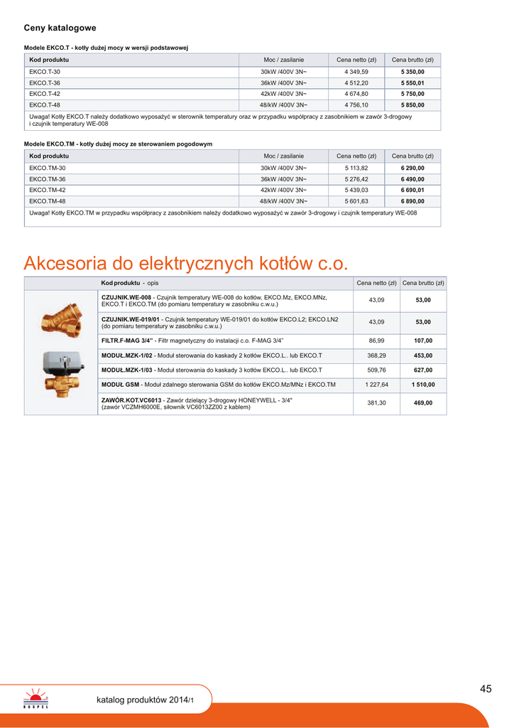 Ceny katalogowe Modele EKCO.T - kotły dużej mocy w wersji podstawowej Kod produktu Moc / zasilanie Cena netto (zł) Cena brutto (zł) EKCO.T-30 30kW /400V 3N~ 4 349,59 5 350,00 EKCO.T-36 36kW /400V 3N~ 4 512,20 5 550,01 EKCO.T-42 42kW /400V 3N~ 4 674,80 5 750,00 EKCO.T-48 48/kW /400V 3N~ 4 756,10 5 850,00 Uwaga! Kotły EKCO.T należy dodatkowo wyposażyć w sterownik temperatury oraz w przypadku współpracy z zasobnikiem w zawór 3-drogowy i czujnik temperatury WE-008 Modele EKCO.TM - kotły dużej mocy ze sterowaniem pogodowym Kod produktu Moc / zasilanie EKCO.TM-30 30kW /400V 3N~ 5 113,82 6 290,00 EKCO.TM-36 36kW /400V 3N~ 5 276,42 6 490,00 EKCO.TM-42 42kW /400V 3N~ 5 439,03 6 690,01 EKCO.TM-48 48/kW /400V 3N~ 5 601,63 6 890,00 Cena netto (zł) Cena brutto (zł) Uwaga! Kotły EKCO.TM w przypadku współpracy z zasobnikiem należy dodatkowo wyposażyć w zawór 3-drogowy i czujnik temperatury WE-008 Akcesoria do elektrycznych kotłów c.o. Kod produktu - opis Cena netto (zł) Cena brutto (zł) CZUJNIK.WE-008 - Czujnik temperatury WE-008 do kotłów, EKCO.Mz, EKCO.MNz, EKCO.T i EKCO.TM (do pomiaru temperatury w zasobniku c.w.u.) 43,09 53,00 CZUJNIK.WE-019/01 - Czujnik temperatury WE-019/01 do kotłów EKCO.L2; EKCO.LN2 (do pomiaru temperatury w zasobniku c.w.u.) 43,09 53,00 FILTR.F-MAG 3/4” - Filtr magnetyczny do instalacji c.o. F-MAG 3/4” 86,99 107,00 MODUŁ.MZK-1/02 - Moduł sterowania do kaskady 2 kotłów EKCO.L.. lub EKCO.T 368,29 453,00 MODUŁ.MZK-1/03 - Moduł sterowania do kaskady 3 kotłów EKCO.L.. lub EKCO.T 509,76 627,00 1 227,64 1 510,00 381,30 469,00 MODUŁ GSM - Moduł zdalnego sterowania GSM do kotłów EKCO.Mz/MNz i EKCO.TM ZAWÓR.KOT.VC6013 - Zawór dzielący 3-drogowy HONEYWELL - 3/4" (zawór VCZMH6000E, siłownik VC6013ZZ00 z kablem) katalog produktów 2014/1 45