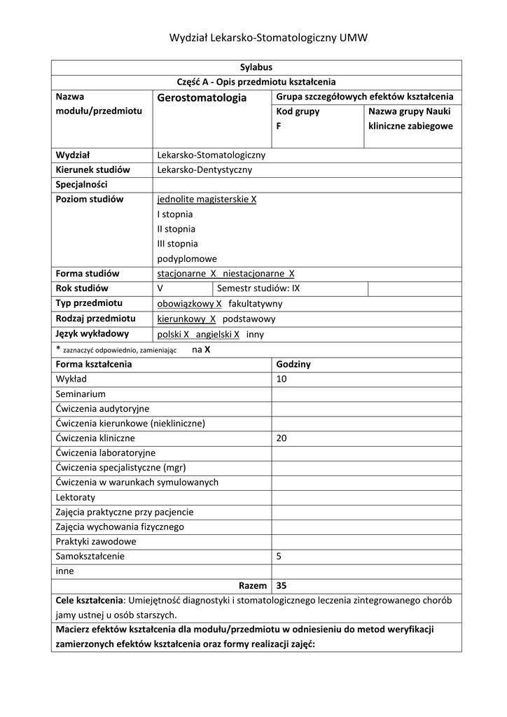 Wydział Lekarsko-Stomatologiczny UMW Gerostomatologia