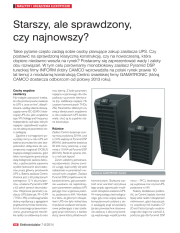 MASZYNY I URZĄDZENIA ELEKTRYCZNE Starszy, ale sprawdzony, czy najnowszy? Takie pytanie często zadają sobie osoby planujące zakup zasilacza UPS. Czy postawić na sprawdzoną klasyczną konstrukcję, czy na nowoczesną, która dopiero niedawno weszła na rynek? Postaramy się zaprezentować wady i zalety obu rozwiązań. W tym celu porównamy monoblokowy zasilacz Pyramid DSP tureckiej firmy INFORM (który CAMCO wprowadziła na polski rynek prawie 10 lat temu) z modularną konstrukcją Centric izraelskiej firmy GAMATRONIC (którą CAMCO dostarcza odbiorcom od połowy 2013 roku). Cechy wspólne zasilaczy Na wstępie zaznaczyć trzeba, że oba porównywane zasilacze to UPS-y „true on-line”, sklasyfikowane, według obecnie obowiązującej normy IEC 62040-3 dotyczącej UPS-ów, jako urządzenia typu VFI (Voltage and Frequency Independent), czyli takie, których napięcie i częstotliwość wyjściowa nie zależą od parametrów sieci zasilającej. Zgodnie z wymaganiami powyższej normy w obu UPS-ach bateria akumulatorów jest bezpośrednio dołączona do wewnętrznej magistrali DCBUS (napięcia stałego) zasilacza, gdyż takie rozwiązanie gwarantuje stałą dostępność zasilania falownika, a jednocześnie zapewnia szybkie ładowanie akumulatorów przez główny prostownik UPS-a. Bateria zasilacza Centric złożona jest z 60 połączonych szeregowo 12 V akumulatorów, a bateria Pyramid’a DSP z 62 takich samych akumulatorów. Wejściowe parametry zasilaczy UPS (takie jak: PF=0,99 i THDi<3%) umożliwiają bardzo dobrą współpracę z agregatami prądotwórczymi bez konieczności ich znacznego przewymiarowania, gwarantują też niewielkie opłaty za oddawaną do sieci 66 moc bierną. Z kolei parametry napięcia wyjściowego dla obu zasilaczy są prawie identyczne (np. stabilizacja napięcia 1% i poziom harmonicznych THDu 2%). Parametrów zbliżonych czy wręcz identycznych znajdziemy w obu zasilaczach UPS bardzo wiele, choć są to zupełnie różne konstrukcje. Różnice Zasilacz Centric dysponuje czynną mocą wyjściową 50 kW, czyli o 2 kW większą niż Pyramid DSP (48 kW). Jednocześnie dostarcza 50 kVA mocy pozornej, a więc mniej o 10 kVA od Pyramid DSP (60 kVA). Rodzi to pytanie, który z nich jest lepszy? Zanim udzielimy jednoznacznej odpowiedzi, chcemy zwrócić uwagę, skąd wzięły się takie rozbieżności w parametrach mocowych tych urządzeń. Zasilacz Pyramid DSP projektowano kilkanaście lat temu, gdy powszechnie uważano, że najistotniejszym parametrem zasilacza UPS jest jego moc wyjściowa pozorna, podawana w kVA. Wynikało to z faktu, że głównym obciążeniem UPS-ów były niskiej klasy impulsowe zasilacze komputerowe pobierające z sieci zasilającej prąd nieliniowy z bardzo dużą zawartością składowych Elektroinstalator 7-8/2014 Zasilacze GAMATRONIC Centric harmonicznych. Skuteczna wartość oraz wartość szczytowa tego prądu ograniczały możliwość obciążania zasilacza UPS. W miarę postępu technologicznego, gdy coraz więcej zasilaczy komputerowych pobiera z sieci zasilającej prąd sinusoidalny (przez powszechne stosowanie zasilaczy z aktywną korekcją wejściowego współczynnika mocy – PFC), istotniejsza staje się wyjściowa moc czynna UPS, podawana w kW. Należy dodatkowo podkreślić, że Centric będzie również lepiej sobie radził z obciążeniem nieliniowym, gdyż dopuszczalny współczynnik kształtu CF (Crest Factor) prądu wyjściowego dla niego ma wartość 6, podczas gdy dla Pyramid DSP koszt eksploatacji podwyższa się o koszt energii elektrycznej potrzebnej do usunięcia ciepła oddanego przez UPS w pomieszczeniu. Mniejsze o 2% straty to w całym okresie eksploatacji oszczędność około 13 500 złotych. Kwota samych oszczędności sprawia, że już po 5 latach wydatek na zakup zasilacza się zwraca. Rodzina zasilaczy Pyramid DSP współczynnik ten nie przekracza wartości 4. Kolejną różnicą porównywanych UPS-ów jest ich sprawność, która dla zasilacza Centric osiąga 96%, a dla Pyramid DSP 94%. Choć 2% różnicy w sprawności urządzeń może wydawać się niewielką wartością, to jednak w okresie eksploatacji (która Zasilacz UPS Centric-100kVA zwykle trwa około 10 lat) przekłada się to na znaczne ograniczenie zużycia energii elektrycznej. Suma oszczędności w obecnych warunkach cenowych może dojść do nawet 45 000 złotych za cały okres eksploatacji. Zasilacze UPS są zwykle instalowane w klimatyzowanych pomieszczeniach, stąd Parametry fizyczne urządzeń Warto porównać dane fizyczne obu zasilaczy UPS: C e n t r i c 5 0 k W/ k V A : 540x757x665 mm i masa 92 kg, Pyramid DSP 48 kW/60 kVA: 520x900x1300 mm i masa 260 kg. Centric zajmuje o 13% mniej kosztownej powierzchni serwerowni niż Pyramid DSP. Kubatura zasilacza Centric to jedynie 45% objętości Pyramid DSP, a waga Centric to tylko 35% wagi Pyramid DSP. Urządzenie mniejsze i lżejsze to kolejne oszczędności w kosztach instalacji czy eksploatacji. Rozbudowa Kolejną, chyba najbardziej istotną różnicą między porównywanymi zasilaczami UPS, jest ich konstrukcja. Inform Pyramid DSP to tradycyjny monoblokowy zasilacz UPS, o stałej nominalnej mocy wyjściowej. Gdy pojawi się konieczność zwiększenia mocy wyjściowej ponad moc nominalną, trzeba będzie zasilacz wymienić na większy. GAMATRONIC Centric ma z kolei konstrukcję modułową – gdy planowany pobór mocy ze źródła gwarantowanego przekroczy moc nominalną UPS-a, można w prosty sposób ją zwiększyć montując w obudowie kolejny 25 kW moduł. A w razie potrzeby połączyć równolegle kolejną szafę i tak dalej aż do uzyskania 800 kW mocy. Modularność zasilacza Centric pozwala na proste i tanie zwiększenie niezawodności systemu zasilania awaryjnego przez wprowadzenie nadmiarowości. Instalując jeden dodatkowy 25 kW moduł mocy uzyskuje się redundancję N+1, a dodając dwa moduły można uzyskać redundancję N+2. Redundancja (nadmiarowość) umożliwia ciągłe zas