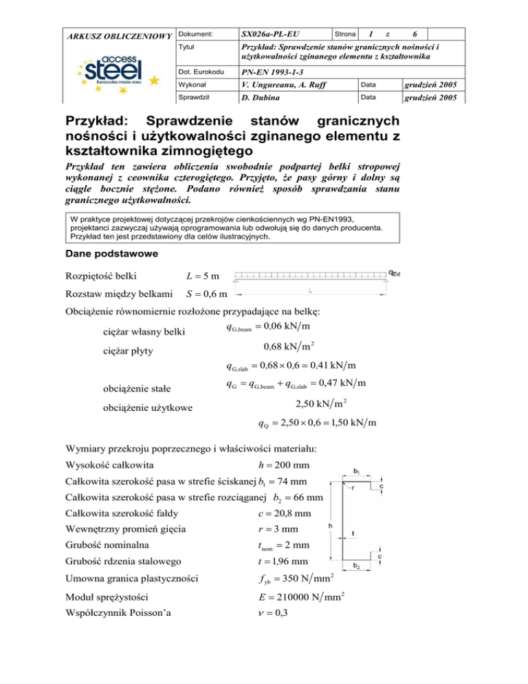 SX026a-PL-EU ARKUSZ OBLICZENIOWY Dokument: 1 Strona z 6 Dot. Eurokodu Przykład: Sprawdzenie stanów granicznych nośności i uŜytkowalności zginanego elementu z kształtownika zimnogiętego PN-EN 1993-1-3 Wykonał V. Ungureanu, A. Ruff Data grudzień 2005 Sprawdził D. Dubina Data grudzień 2005 Tytuł Przykład: Sprawdzenie stanów granicznych nośności i uŜytkowalności zginanego elementu z kształtownika zimnogiętego Przykład ten zawiera obliczenia swobodnie podpartej belki stropowej wykonanej z ceownika czterogiętego. Przyjęto, Ŝe pasy górny i dolny są ciągle bocznie stęŜone. Podano równieŜ sposób sprawdzania stanu granicznego uŜytkowalności. W praktyce projektowej dotyczącej przekrojów cienkościennych wg PN-EN1993, projektanci zazwyczaj uŜywają oprogramowania lub odwołują się do danych producenta. Przykład ten jest przedstawiony dla celów ilustracyjnych. Dane podstawowe Rozpiętość belki L=5m Rozstaw między belkami S = 0,6 m ObciąŜenie równomiernie rozłoŜone przypadające na belkę: qG,beam = 0 ,06 kN m cięŜar własny belki cięŜar płyty 0 ,68 kN m 2 qG,slab = 0 ,68 × 0 ,6 = 0 ,41 kN m obciąŜenie stałe qG = qG,beam + qG,slab = 0,47 kN m 2,50 kN m 2 obciąŜenie uŜytkowe qQ = 2,50 × 0,6 = 1,50 kN m Wymiary przekroju poprzecznego i właściwości materiału: Wysokość całkowita h = 200 mm Całkowita szerokość pasa w strefie ściskanej b1 = 74 mm Całkowita szerokość pasa w strefie rozciąganej b2 = 66 mm Całkowita szerokość fałdy c = 20,8 mm Wewnętrzny promień gięcia r = 3 mm Grubość nominalna t nom = 2 mm Grubość rdzenia stalowego t = 1,96 mm Umowna granica plastyczności f yb = 350 N mm 2 Moduł spręŜystości E = 210000 N mm 2 Współczynnik Poisson’a ν = 0,3 SX026a-PL-EU ARKUSZ OBLICZENIOWY Dokument: Strona 2 z 6 Dot. Eurokodu Przykład: Sprawdzenie stanów granicznych nośności i uŜytkowalności zginanego elementu z kształtownika zimnogiętego PN-EN 1993-1-3 Wykonał V. Ungureanu, A. Ruff Data grudzień 2005 Sprawdził D. Dubina Data grudzień 2005 Tytuł Częściowe współczynniki bezpieczeństwa γ M0 = 1,0 γ M1 = 1,0 γ G = 1,35 – obciąŜenie stałe γ Q = 1,50 – obciąŜenie zmienne PN-EN19931-3 §2(3) PN-EN1990 1. Sprawdzenie stanu granicznego nośności belki Efektywne charakterystyki przekroju dla stanu granicznego nośności Moment bezwładności dla zimnogiętego ceownika czterogiętego poddanego zginaniu względem mocnej osi bezwładności: 4 I eff, y = 4139861 mm SX022 PołoŜenie osi obojętnej: - od pasa ściskanego: zc = 102 ,3 mm - od pasa rozciąganego: z t = 95,7 mm Efektywny wskaźnik wytrzymałości na zginanie: - w odniesieniu do pasa ściskanego: Weff, y, c = I eff, y zc = 4140000 = 40460 mm 3 102,3 - w odniesieniu do pasa rozciąganego: Weff, y, t = I eff, y zt = 4140000 = 43260 mm3 95,7 Weff, y = min(Weff, y,c ,Weff, y,t ) = 40463 mm3 ObciąŜenie przyłoŜone do belki w stanie granicznym nośności qd = γ G qG + γ Q qQ = 1,35 × 0,47 + 1,50 × 1,50 = 2,89 kN m Maksymalny moment zginający (w środku rozpiętości) względem mocnej osi y-y: M Ed = qd L2 8 = 2 ,89 × 5 2 8 = 9 ,03 kNm PN-EN1990 SX026a-PL-EU ARKUSZ OBLICZENIOWY Dokument: Strona 3 z 6 Dot. Eurokodu Przykład: Sprawdzenie stanów granicznych nośności i uŜytkowalności zginanego elementu z kształtownika zimnogiętego PN-EN 1993-1-3 Wykonał V. Ungureanu, A. Ruff Data grudzień 2005 Sprawdził D. Dubina Data grudzień 2005 Tytuł Sprawdzenie nośności na zginanie w stanie granicznym nośności Nośność obliczeniowa przekroju na zginanie: M c,Rd = Weff, y f yb γ M0 = 40463 × 10 −9 × 350 × 103 1,0 = 14,16 kNm Sprawdzenie warunku nośności na zginanie: M Ed 9,03 = = 0,638 < 1 M c,Rd 14,16 PN-EN19931-3 §6.1.4.1(1) PN-EN19931-1 – OK §6.2.5(1) Sprawdzenie nośności na ścinanie w stanie granicznym nośności Obliczeniowa siła ścinająca Maksymalna wartość przyłoŜonej siły ścinającej VEd = qd L 2 = 2,89 × 5 2 = 7,225 kN Obliczeniowa plastyczna nośność na ścinanie Vpl,Rd = ( Av f yb γ M0 3 )= ( hw t f yb sin φ 3 ) PN-EN19931-1 §6.2.6(2) γ M0 gdzie: Av – jest polem przekroju przy ścinaniu hw = h − t nom – jest wysokością środnika belki φ = 90° – jest pochyleniem środnika w stosunku do pasów. Vpl,Rd = (200 − 2) × 10 −3 × 1,96 × 10 −3 × (350 × 103 sin 90° 1,0 3 ) = 78,42 kN SX026a-PL-EU ARKUSZ OBLICZENIOWY Dokument: Strona 4 z 6 Dot. Eurokodu Przykład: Sprawdzenie stanów granicznych nośności i uŜytkowalności zginanego elementu z kształtownika zimnogiętego PN-EN 1993-1-3 Wykonał V. Ungureanu, A. Ruff Data grudzień 2005 Sprawdził D. Dubina Data grudzień 2005 Tytuł Obliczeniowa nośność na ścinanie z uwzględnieniem utraty stateczności miejscowej Vb,Rd = hw tf bv sinφ PN-EN19931-3 §6.1.5 γ M0 gdzie: f bv is nośnością na ścinanie z uwzględnieniem stateczności miejscowej Dla środnika usztywnionego w punktach podparcia: f bv = 0,58 f yb jeŜeli λw ≤ 0,83 f bv = 0,48 f yb λw jeŜeli λw > 0,83 Smukłość względna środnika λw bez usztywnień wzdłuŜnych: λw = 0,346 sw t 0,346 × f yb E = 0,346 h − t nom t f yb E = 200 − 2 350 × = 1,427 1,96 210000 λw = 1,427 > 0 ,83 to: f bv = 0,48 f yb λw = 0,48 × 350 1,427 = 117,7 N mm 2 Vb, Rd = (200 − 2 ) × 10 −3 × 1,96 × 10 − 3 × 117,7 × 103 sin 90° 1,0 = 45,7 kN Obliczeniowa nośność na ścinanie Vc,Rd = min(Vpl,Rd ,Vb,Rd ) = min(78,42 ; 45,7 ) = 45,7 kN Sprawdzenie warunku nośność na ścinanie VEd 7 ,225 = = 0,158 < 1 Vc,Rd 45,7 – OK PN-EN19931-1 §6.2.6(1) SX026a-PL-EU ARKUSZ OBLICZENIOWY Dokument: Strona 5 z 6 Dot. Eurokodu Przykład: Sprawdzenie stanów granicznych nośności i uŜytkowalności zginanego elementu z kształtownika zimnogiętego PN-EN 1993-1-3 Wykonał V. Ungureanu, A. Ruff Data grudzień 2005 Sprawdził D. Dubina Data grudzień 2005 Tytuł Sprawdzenie nośności lokalnej w stanie granicznym nośności Reakcja podporowa: FEd = qd L 2 = 2,89 × 5 2 = 7