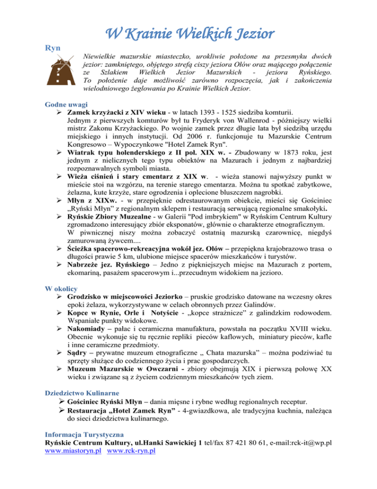 W Krainie Wielkich Jezior Ryn Niewielkie mazurskie miasteczko, urokliwie położone na przesmyku dwóch jezior: zamkniętego, objętego strefą ciszy jeziora Ołów oraz mającego połączenie ze Szlakiem Wielkich Jezior Mazurskich - jeziora Ryńskiego. To położenie daje możliwość zarówno rozpoczęcia, jak i zakończenia wielodniowego żeglowania po Krainie Wielkich Jezior. Godne uwagi Zamek krzyżacki z XIV wieku - w latach 1393 - 1525 siedziba komturii. Jednym z pierwszych komturów był tu Fryderyk von Wallenrod - późniejszy wielki mistrz Zakonu Krzyżackiego. Po wojnie zamek przez długie lata był siedzibą urzędu miejskiego i innych instytucji. Od 2006 r. funkcjonuje tu Mazurskie Centrum Kongresowo – Wypoczynkowe "Hotel Zamek Ryn". Wiatrak typu holenderskiego z II poł. XIX w. - Zbudowany w 1873 roku, jest jednym z nielicznych tego typu obiektów na Mazurach i jednym z najbardziej rozpoznawalnych symboli miasta. Wieża ciśnień i stary cmentarz z XIX w. - wieża stanowi najwyższy punkt w mieście stoi na wzgórzu, na terenie starego cmentarza. Można tu spotkać zabytkowe, żelazna, kute krzyże, stare ogrodzenia i oplecione bluszczem nagrobki. Młyn z XIXw. - w przepięknie odrestaurowanym obiekcie, mieści się Gościniec „Ryński Młyn” z regionalnym sklepem i restauracją serwującą regionalne smakołyki. Ryńskie Zbiory Muzealne - w Galerii "Pod imbrykiem" w Ryńskim Centrum Kultury zgromadzono interesujący zbiór eksponatów, głównie o charakterze etnograficznym. W piwnicznej niszy można zobaczyć ostatnią mazurską czarownicę, niegdyś zamurowaną żywcem.... Ścieżka spacerowo-rekreacyjna wokół jez. Ołów – przepiękna krajobrazowo trasa o długości prawie 5 km, ulubione miejsce spacerów mieszkańców i turystów. Nabrzeże jez. Ryńskiego – Jedno z piękniejszych miejsc na Mazurach z portem, ekomariną, pasażem spacerowym i...przecudnym widokiem na jezioro. W okolicy Grodzisko w miejscowości Jeziorko – pruskie grodzisko datowane na wczesny okres epoki żelaza, wykorzystywane w celach obronnych przez Galindów. Kopce w Rynie, Orle i Notyście - „kopce strażnicze” z galindzkim rodowodem. Wspaniałe punkty widokowe. Nakomiady – pałac i ceramiczna manufaktura, powstała na początku XVIII wieku. Obecnie wykonuje się tu ręcznie repliki pieców kaflowych, miniatury pieców, kafle i inne ceramiczne przedmioty. Sądry – prywatne muzeum etnograficzne „ Chata mazurska” – można podziwiać tu sprzęty służące do codziennego życia i prac gospodarczych. Muzeum Mazurskie w Owczarni - zbiory obejmują XIX i pierwszą połowę XX wieku i związane są z życiem codziennym mieszkańców tych ziem. Dziedzictwo Kulinarne Gościniec Ryński Młyn – dania mięsne i rybne według regionalnych receptur. Restauracja „Hotel Zamek Ryn” - 4-gwiazdkowa, ale tradycyjna kuchnia, należąca do sieci dziedzictwa kulinarnego. Informacja Turystyczna Ryńskie Centrum Kultury, ul.Hanki Sawickiej 1 tel/fax 87 421 80 61, e-mail:[email protected] www.miastoryn.pl www.rck-ryn.pl