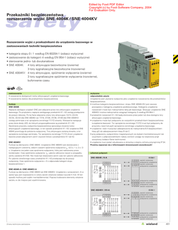 Edited by Foxit PDF Editor Copyright (c) by Foxit Software Company, 2004 For Evaluation Only. Przekaźniki bezpieczeństwa rozszerzenie wyjść SNE 4004K / SNE 4004KV safety Rozszerzenie wyjść z przekaźnikami do urządzenia bazowego w zastosowaniach techniki bezpieczeństwa • kategoria stopu 0 i 1 według EN 60204-1 (zobacz wytyczne) • zastosowanie do kategorii 4 według EN 954-1 (zobacz wytyczne) • sterowanie jedno- lub dwukanałowe • SNE 4004K: 4 tory aktywujące bezzwłoczne (zwierne) 3 tory sygnalizacyjne bezzwłoczne (rozwierne) • SNE 4004KV: 4 tory aktywujące, opóźnienie wyłączenia (zwierne) 3 tory sygnalizacyjne opóźnienie wyłączenia (rozwierne), buforwanie czasu bE zastosowanie • rozszerzenie dostępnych torów aktywujących urządzenia bazowego • rozszerzenie styków dla przekaźników bezpieczeństwa funkcje SNE 4004K Napięcie zasilające urządzeń SNE jest załączane przez tory aktywujące urządzenia bazowego. Po przyłożeniu napięcia zasilającego przekaźniki K1 i K2 zostają przełączone do pozycji roboczej. Po tej fazie załączania cztery tory aktywujące 13 /14, 23 / 24, 33 / 34, 43 / 44 (dla SNE 4004K) lub 17/18, 27/ 28, 37/ 38, 47/ 48 (dla SNE 4004KV) zostają zamknięte a tor sprzężenia zwrotnego Y1/ Y2 otwarty. Wskazanie następuje przez dwie diody LED, do których przyporządkowane są przekaźniki K1 i K2. Naciśniecie przycisku wyłącznika bezpieczeństwa spowoduje otwarcie torów aktywujących urządzenia bazowego, w ten sposób przekaźniki K1 i K2 urządzenia SNE 4004K powrócąją do położenia wyłączonej. Tory aktywujące zostaną otwarte, a tor sprzężenia zwrotnego zamknięty. Tor sprzężenia zwrotnego Y1/ Y2 chroni urządzenie bazowe przed załączeniem zanim wyzwoli któryś z przekaźników K1 lub K2. SNE 4004KV Funkcje są identyczne z SNE 4004K. Urządzenie SNE 4004KV jest dostarczane z następującymi czterema, stałymi czasami opóźnienia wyłączenia tR1: 0,5 s; 1 s; 2 s i 3 s. Urządzenie ma jeden czas opoźnienia wyłączenia, który jest realizowany przez kondensator. Czas opóźnienia wyłączenia tR1 upłynie całkowice nawet w przypadku zaniku zasilania (A1/ A2). Nie może być skasowane zanim czas ten upłynie całkowicie. Po upływie określonego czasu przekaźniki K1 i K2 przełączaja się do pozycji wyłączonej. Czas opóźnienia wyłączenia > 0 s odpowiada kategorii stopu bezpieczeństwa 1. SNE 4004K-A i SNE 4004KV-A Funkcje są identyczne z SNE 4004K lub SNE 4004KV. Urządzenie z oznaczeniem -A w opisie typu jest wyposażone w cztery zaciski wtykowe (zobacz rysunek K 4-2). W ten sposób możliwy jest szybki montaż/demontaż. Poprzez kodowane elementy włożenie zacisku w złe miejsce jest wyeliminowane. wytyczne odpowiednie użycie Urządzenie jest używane wyłącznie jako urządzenie rozszerzenia dla przekaźników bezpieczeństwa. • możliwa kategoria bezpieczeństwa i stopu SNE 4004K / KV jest zawsze powiązana z kategorią urządzenia podstawowego. Kategoria urządzenia rozszerzeń może być maksymalnie taką jak bazowego. Stosując urządzenie SNE 4004KV można maksymalnie osiągnąć kategorię 3 według EN 954-1. • przekaźniki rozszerzeń K1 i K2 będą sterowane przez jeden lub dwa dostępne tory aktywujące urządzenia bazowego. • urządzenie może być połączone ze wszystkimi przekaźnikami bezpieczeństwa (urządzenia bazowe). Tor sprzężenia zwrotnego Y1/Y2 musi być połączony do przycisku reset lub pętli sprzężenia zwrotnego urządzenia bazowego. • urządzenie i styki muszą być zabezpieczone do maksymalnie 6 A bezpiecznikiem klasy gG lub zabezpieczeniem klasy B lub C. • przy połączeniu wyłączników magnetycznych ze stykami kontraktonowymi lub czujnikami z półprzewodnikami należy zwrócić uwagę na wejściowy prąd szczytowy (zobacz Dane techniczne). • urządzenie musi zostać wbudowane w skrzynkę o stopniu ochrony przynajmniej IP 54. Prosimy zapoznać się z informacjami stowarzyszeń zawodowych! schemat połączeń zaciski wtykowe połączenia urządzenia zaciski wtykowe połączenia urządzenia połączenia urządzenia zaciski wtykowe połączenia urządzenia zaciski wtykowe zaciski wtykowe połączenia urządzenia zaciski wtykowe połączenia urządzenia połączenia urządzenia zaciski wtykowe połączenia urządzenia zaciski wtykowe Zmiany techniczne zastrzeżone 401 Edited by Foxit PDF Editor Copyright (c) by Foxit Software Company, 2004 For Evaluation Only. Przekaźniki bezpieczeństwa rozszerzenie wyjść SNE 4004K / SNE 4004KV safety safety wykres funkcji SNE 4004K rysunek SNE 4004K / KV A1/A2 napięcie zasilające Y1/Y2 tor sprzężenia zwrotnego 13/14, 23/24, 33/34, 43/44, LED K1, LED K2 51/52, 61/62 tA = czas odpowiedzi tR2 = czas wyzwolenia SNE 4004KV A1/A2 napięcie zasilające Y1/Y2 tor sprzężenia zwrotnego 17/18, 27/28, 37/38, 47/48, LED K1, LED K2 55/56, 65/66 tA = czas odpowiedzi tR1 = czas wyzwolenia tM = minimalny czas załączania SNE 4004K- A/ KV-A instalacja SNE 4004K 1 2 3 4 Proszę zwrócić uwagę na schemat połączeń w trakcie instalacji. 4 tory aktywujące (zwierne) 2 tory sygnalizacyjne (rozwierne) 1 tor sprzężenia zwrotnego (rozwierny) do połączenia z modułem bazowym napięcie zasilające 1 2 3 4 4 tory aktywujące (zwierne) 2 tory sygnalizacyjne (rozwierne) 1 tor sprzężenia zwrotnego (rozwierny) do połączenia z modułem bazowym napięcie zasilające SNE 4004KV 402 Zmiany techniczne zastrzeżone Edited by Foxit PDF Editor Copyright (c) by Foxit Software Company, 2004 For Evaluation Only. Przekaźniki bezpieczeństwa rozszerzenie wyjść SNE 4004K / SNE 4004KV safety E-stop przykład zastosowania Dwukanałowy wyłącznik bezpieczeństwa (ciągłość połączeń) z nadzorem przcisku reset i przekaźnikiem rozszerzeniem styków Przekaźnik bezpieczeństwa SNO 4062K z rozszerzeniem styków SNE 4004K Przykład dwukanałowego wyłącznika z przekaźnikiem rozszerzenia styków wyłącza się, nawet w przypadku