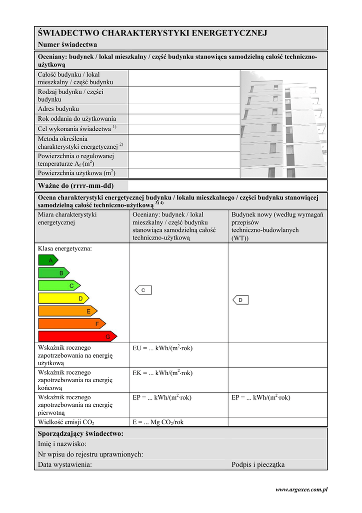 ŚWIADECTWO CHARAKTERYSTYKI ENERGETYCZNEJ Numer świadectwa Oceniany: budynek / lokal mieszkalny / część budynku stanowiąca samodzielną całość technicznoużytkową Całość budynku / lokal mieszkalny / część budynku Rodzaj budynku / części budynku Adres budynku Rok oddania do użytkowania Cel wykonania świadectwa 1) Metoda określenia charakterystyki energetycznej 2) Powierzchnia o regulowanej temperaturze Af (m2) Powierzchnia użytkowa (m2) Ważne do (rrrr-mm-dd) Ocena charakterystyki energetycznej budynku / lokalu mieszkalnego / części budynku stanowiącej samodzielną całość techniczno-użytkową 3) 4) Miara charakterystyki Oceniany: budynek / lokal Budynek nowy (według wymagań energetycznej mieszkalny / część budynku przepisów stanowiąca samodzielną całość techniczno-budowlanych techniczno-użytkową (WT)) Klasa energetyczna: Wskaźnik rocznego zapotrzebowania na energię użytkową Wskaźnik rocznego zapotrzebowania na energię końcową Wskaźnik rocznego zapotrzebowania na energię pierwotną Wielkość emisji CO2 EU = ... kWh/(m2⋅rok) EK = ... kWh/(m2⋅rok) EP = ... kWh/(m2⋅rok) EP = ... kWh/(m2⋅rok) E = ... Mg CO2/rok Sporządzający świadectwo: Imię i nazwisko: Nr wpisu do rejestru uprawnionych: Data wystawienia: Podpis i pieczątka www.argoxee.com.pl 2 ŚWIADECTWO CHARAKTERYSTYKI ENERGETYCZNEJ Numer świadectwa Podstawowe parametry techniczno-użytkowe budynku / lokalu mieszkalnego / części budynku Przeznaczenie budynku Rok oddania do użytkowania Liczba kondygnacji Powierzchnia użytkowa [m2] Kubatura [m3] Powierzchnia o regulowanej temperaturze Af [m2] Kubatura o regulowanej temperaturze [m3] Podział powierzchni użytkowej Temperatura wewnętrzna Rodzaj konstrukcji budynku Liczba użytkowników/ mieszkańców Osłona budynku Przegroda System ogrzewczy Elementy składowe Opis systemu Wytwarzanie ciepła Przesył ciepła Akumulacja ciepła Regulacja i wykorzystanie ciepła Elementy składowe Opis instalacji Wytwarzanie ciepła Przesył ciepła Akumulacja ciepła Regulacja i wykorzystanie ciepła Elementy składowe Opis instalacji Wytwarzanie chłodu Przesył chłodu Akumulacja chłodu Regulacja i wykorzystanie chłodu System przygotowania ciepłej wody użytkowej System chłodzenia Opis Współczynnik przenikania ciepła Uc lub U [W/( m2⋅rok)] uzyskany wymagany dla budynku nowego lub przebudowanego Sprawności cząstkowe Sprawności cząstkowe Sprawności cząstkowe System wentylacji System oświetlenia z wbudowanej instalacji oświetlenia Inne istotne dane www.argoxee.com.pl 3 ŚWIADECTWO CHARAKTERYSTYKI ENERGETYCZNEJ Numer świadectwa Wskaźniki zapotrzebowania na energię w zależności od rodzaju nośnika energii oraz systemu technicznego Wskaźnik rocznego zapotrzebowania na energię użytkową EU w zależności od rodzaju nośnika energii oraz systemu technicznego [kWh/( m2⋅rok)] Nośnik energii Ogrzewanie i wentylacja Ciepła woda Wentylacja mechaniczna Klimatyzacja i Oświetlenie chłodzenie wbudowane Urządzenia pomocnicze Suma Suma [kWh/( m2⋅rok)] Udział [%] Wskaźnik rocznego zapotrzebowania na energię użytkową EU: ... kWh/( m2⋅rok) Wskaźnik rocznego zapotrzebowania na energię końcową EK w zależności od rodzaju nośnika energii oraz systemu technicznego [kWh/( m2⋅rok)] Nośnik energii Ogrzewanie i wentylacja Ciepła woda Wentylacja mechaniczna Klimatyzacja i Oświetlenie chłodzenie wbudowane Urządzenia pomocnicze Suma Suma [kWh/( m2⋅rok)] Udział [%] Wskaźnik rocznego zapotrzebowania na energię końcową EK: ... kWh/( m2⋅rok) Wskaźnik rocznego zapotrzebowania na energię pierwotną EP w zależności od rodzaju nośnika energii oraz systemu technicznego [kWh/( m2⋅rok)] Nośnik energii Ogrzewanie i wentylacja Ciepła woda Wentylacja mechaniczna Klimatyzacja i Oświetlenie chłodzenie wbudowane Urządzenia pomocnicze Suma Suma [kWh/( m2⋅rok)] Udział [%] Wskaźnik rocznego zapotrzebowania na energię pierwotną EP: ... kWh/( m2⋅rok) Zalecenia dotyczące opłacalnej ekonomicznie poprawy charakterystyki energetycznej 1) Zalecenia w zakresie charakterystyki cieplnej przegród zewnętrznych budynku 2) Zalecenia w zakresie systemów technicznych w budynku i źródeł energii 3) Zalecenia w zakresie sposobu eksploatacji, wykorzystania pasywnego ciepła słonecznego i innych zysków oraz ochrony przed nasłonecznieniem 4) Inne uwagi osoby sporządzającej świadectwo charakterystyki energetycznej (w tym informacja, gdzie można uzyskać bardziej szczegółowe informacje dotyczące opłacalności ekonomicznej zawartych w świadectwie zaleceń) www.argoxee.com.pl ŚWIADECTWO CHARAKTERYSTYKI ENERGETYCZNEJ 4 Numer świadectwa Objaśnienia 1) Cel wykonania świadectwa: budynek oddawany do użytkowania, przeniesienie własności, zbycie spółdzielczego własnościowego prawa do lokalu, wynajem, umieszczenie w widocznym miejscu, inny. 2) Metoda określenia charakterystyki energetycznej: metoda obliczeniowa dla przyjętego sposobu użytkowania i standardowych warunków klimatycznych, metoda oparta na faktycznie zużytej ilości energii. 3) Charakterystyka energetyczna nowowznoszonego budynku określana jest na podstawie porównania jednostkowej ilości nieodnawialnej energii pierwotnej EP niezbędnej do zaspokojenia potrzeb energetycznych budynku w zakresie ogrzewania, chłodzenia, wentylacji, ciepłej wody użytkowej i oświetlenia wbudowanego (z wyłączeniem budynków mieszkalnych i lokali mieszkalnych) z odpowiednią wartością referencyjną wynikającą z przepisów techniczno-budowlanych. 4) Charakterystyka energetyczna określana jest dla warunków klimatycznych odniesienia - stacja …………… oraz dla normalnych warunków eksploatacji budynku podanych na str 2. 1) Niniejsze świadectwo charakterystyki energetycznej budynku zostało wydane na podstawie dokonanej oceny charakterystyki energetycznej budynku zgodnie z przepisami ustawy z dnia 7 lipca 1994 r. - Prawo budowlane (Dz. U. z 2010 r. Nr