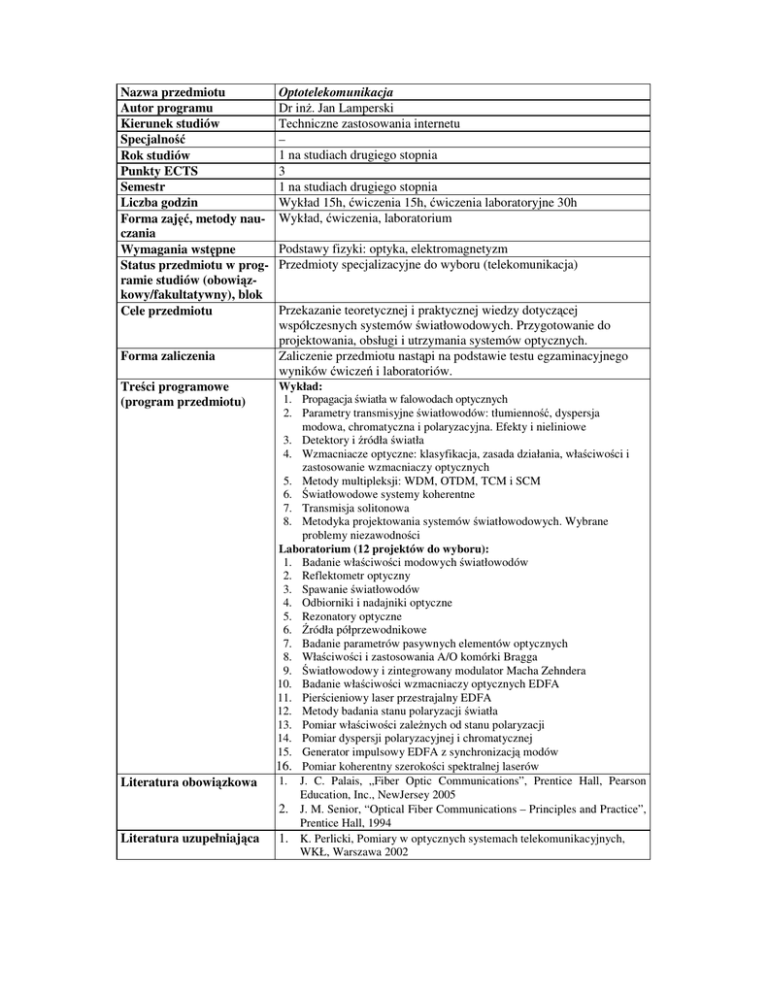 Nazwa przedmiotu Optotelekomunikacja Autor programu Dr inż. Jan