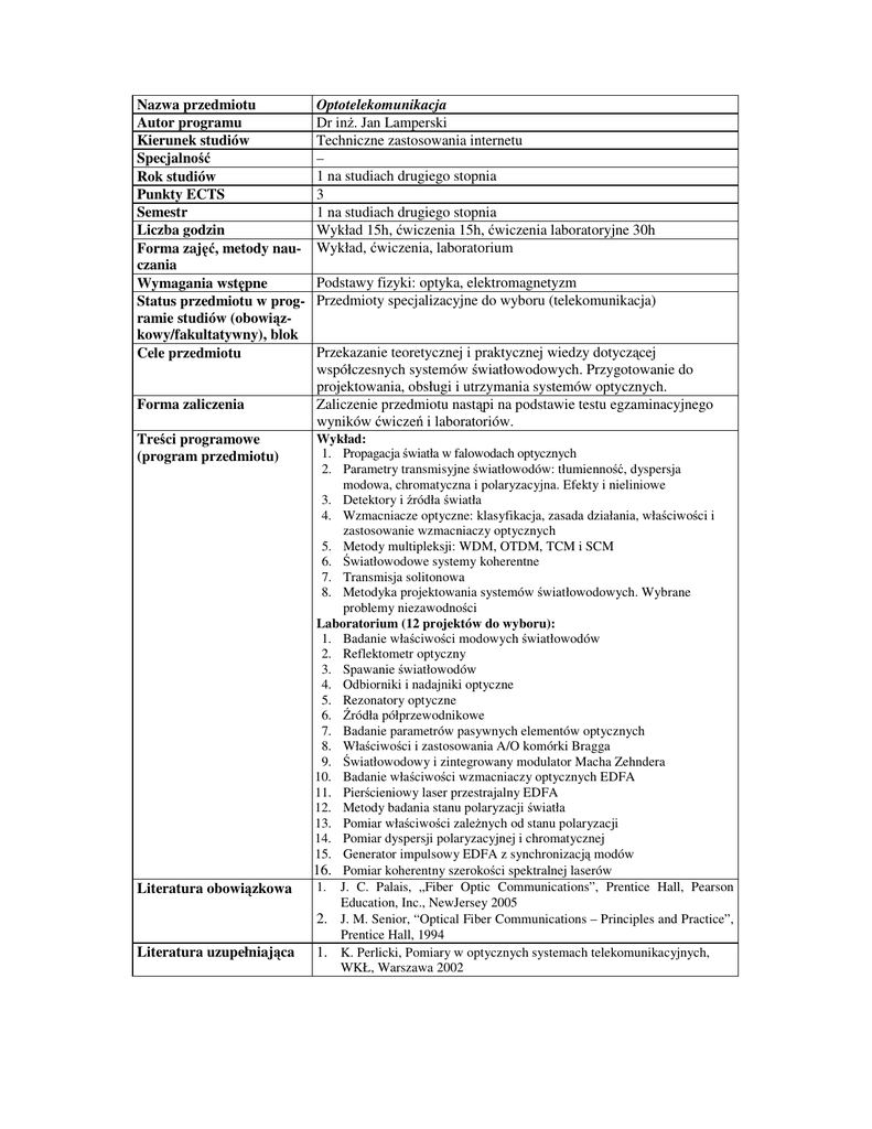Nazwa przedmiotu Autor programu Kierunek studiów Specjalno Rok studiów Punkty ECTS Semestr Liczba godzin Forma zaj , metody nauczania Wymagania wst pne Status przedmiotu w programie studiów (obowi zkowy/fakultatywny), blok Cele przedmiotu Forma zaliczenia Tre ci programowe (program przedmiotu) Literatura obowi zkowa Literatura uzupełniaj ca Optotelekomunikacja Dr in . Jan Lamperski Techniczne zastosowania internetu – 1 na studiach drugiego stopnia 3 1 na studiach drugiego stopnia Wykład 15h, wiczenia 15h, wiczenia laboratoryjne 30h Wykład, wiczenia, laboratorium Podstawy fizyki: optyka, elektromagnetyzm Przedmioty specjalizacyjne do wyboru (telekomunikacja) Przekazanie teoretycznej i praktycznej wiedzy dotycz cej współczesnych systemów wiatłowodowych. Przygotowanie do projektowania, obsługi i utrzymania systemów optycznych. Zaliczenie przedmiotu nast pi na podstawie testu egzaminacyjnego wyników wicze i laboratoriów. Wykład: 1. Propagacja wiatła w falowodach optycznych 2. Parametry transmisyjne wiatłowodów: tłumienno , dyspersja modowa, chromatyczna i polaryzacyjna. Efekty i nieliniowe 3. Detektory i ródła wiatła 4. Wzmacniacze optyczne: klasyfikacja, zasada działania, wła ciwo ci i zastosowanie wzmacniaczy optycznych 5. Metody multipleksji: WDM, OTDM, TCM i SCM 6. wiatłowodowe systemy koherentne 7. Transmisja solitonowa 8. Metodyka projektowania systemów wiatłowodowych. Wybrane problemy niezawodno ci Laboratorium (12 projektów do wyboru): 1. Badanie wła ciwo ci modowych wiatłowodów 2. Reflektometr optyczny 3. Spawanie wiatłowodów 4. Odbiorniki i nadajniki optyczne 5. Rezonatory optyczne 6. ródła półprzewodnikowe 7. Badanie parametrów pasywnych elementów optycznych 8. Wła ciwo ci i zastosowania A/O komórki Bragga 9. wiatłowodowy i zintegrowany modulator Macha Zehndera 10. Badanie wła ciwo ci wzmacniaczy optycznych EDFA 11. Pier cieniowy laser przestrajalny EDFA 12. Metody badania stanu polaryzacji wiatła 13. Pomiar wła ciwo ci zale nych od stanu polaryzacji 14. Pomiar dyspersji polaryzacyjnej i chromatycznej 15. Generator impulsowy EDFA z synchronizacj modów 16. Pomiar koherentny szeroko ci spektralnej laserów 1. J. C. Palais, „Fiber Optic Communications”, Prentice Hall, Pearson Education, Inc., NewJersey 2005 2. J. M. Senior, “Optical Fiber Communications – Principles and Practice”, Prentice Hall, 1994 1. K. Perlicki, Pomiary w optycznych systemach telekomunikacyjnych, WKŁ, Warszawa 2002