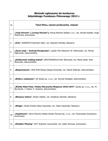 Wnioski zgłoszone do konkursu Gdyńskiego Funduszu Filmowego 2013 r. Lp. Tytuł filmu, nazwa producenta, reżyser 1. „Twój Vincent” („Loving Vincent”), Flying Machine Spółka z o.o., reż. Dorota Kobiela, Hugh Welchman, animowany 2. „Orły”, NORDFILM Kazimierz Beer, reż. Wojciech Klimala, fabularny 3. „Życie moje – Andrzej Perepeczko”, Leader Film Sławomir W. Malinowski, reż. Michał Dąbrowski, dokumentalny 4. „Solidarność według kobiet”, EMOTIKONFILM Piotr Śliwowski, reż. Marta Dzido, Piotr Śliwowski, dokumentalny 5. „Wspomnienie”, ADD SUM Maciej Ostoja-Chyżyński, reż. Marek Widarski, dokumentalny 6. „Walka z szatanem”, ZK Studio sp. z o.o., reż. Konrad Szołajski, dokumentalny 7. „Wielka Mała Flota. Polska Marynarka Wojenna 1918-1947”, Epoka sp. z o.o., reż. M. Burchardt, J. Rados, P. Grajnert, dokumentalny 8. „Wszyscy wielcy”, Studio Videlec, reż. Arkadiusz Okoński, fabularny 9. „Wołga”, Studio Panika Oskar Kaszyński, reż. Oskar Kaszyński, fabularny 10. „Pojednanie”, Nemi Pictures Polskie Studio Filmowe Sp. z o.o., reż. Przemysław Anusiewicz, animowany 11. „Możdżer Playing”, WJT Wojciech Leszczyński, reż. Adam Wyrwas, animowany 12. „Ucho van Gogha”, New Format Sp. z o.o., reż. S. Chondrokostas, M. Lechki, A. Smoczyńska, A. Guziński, serial 13. „Dzieci dzwonią”, BIAŁY SMOK Production Andrzej Mańkowski, reż. Andrzej Mańkowski, dokumentalny 14. „Zorza II czyli obywatelskie nieposłuszeństwo”, Oficyna Verbi Causa Halina Małgorzata Sokołowska, reż. Jacek Dworakowski, dokumentalny 15. „Hiszpanka”, Studio Filmowe Kadr, reż. Łukasz Barczyk, fabularny 16. „Szklane domy”, TOMATO Marcin Junkiewicz, reż. Bartosz Warwas, dokumentalny 17. „XX lecie pracy”, EASYBUSYPRODUCTIONS Weronika Czołnowska, reż. Mateusz Jarmulski, animowany 18. „Nam wieczna w polszczyźnie rozróba”, Ambermedia Sp. z o.o., reż. Borys Lankosz, dokumentalny 19. „Hel”, Fundacja AMONDO Films reż. Paweł Tarasiewicz, Katarzyna Priwiezencew, fabularny