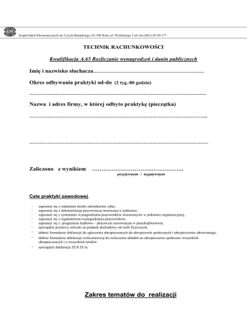 Zespół Szkół Ekonomicznych im. Cyryla Ratajskiego, 63-100 Śrem, ul. Wybickiego 2 tel./fax.(061) 28-30-177 TECHNIK RACHUNKOWOŚCI Kwalifikacja A.65 Rozliczanie wynagrodzeń i danin publicznych Imię i nazwisko słuchacza…………………………………………………….…… Okres odbywania praktyki od-do (2 tyg.-80 godzin) …………………………………………………………………………………….………. Nazwa i adres firmy, w której odbyto praktykę (pieczątka) ……………………………………………………………………………………………... ……………………………………………………………………………………………… Zaliczono z wynikiem ………………………….…………….. pozytywnym / negatywnym Cele praktyki zawodowej. - zapoznać się z zadaniami działu zatrudnienia i płac, zapoznać się z dokumentacją pracowniczą stosowaną w jednostce, zapoznać się z systemami wynagradzania pracowników stosowanymi w jednostce organizacyjnej, zapoznać się z regulaminem wynagradzania pracowników, zapoznać się z programem kadrowo – płacowym stosowanym w przedsiębiorstwie, sporządzić przelewy zaliczki na podatek dochodowy od osób fizycznych, - dobrać formularze deklaracji do zgłoszenia ubezpieczonych do ubezpieczeń społecznych i ubezpieczenia zdrowotnego, - sporządzić deklaracje ZUS ZUA. dobrać formularze deklaracji rozliczeniowej do rozliczenia składek na ubezpieczenia społeczne wszystkich ubezpieczonych i z wszystkich tytułów Zakres tematów do realizacji PRAKTYK ZAWODOWYCH SŁUCHACZA KKZ A.65 ……………………………………………… imię i nazwisko słuchacza Lp. 1. 2. Temat do realizacji praktycznej Zakres obowiązków pracowników działu zatrudnienia i płac. Dokumentacja pracownicza. 3. 4. Dokumentowanie wynagrodzeń. 5. Systemy wynagradzania pracowników w jednostce organizacyjnej. 6. Obowiązki zgłoszeniowe do ZUS. data ………………………. Zagadnienie szczegółowe 1.sporzadzić umowę o pracę dostosowując rodzaj umowy do konkretnej sytuacji; 2.sporządzić wypowiedzenie stosunku pracy zgodnie z przepisami Kodeksu Pracy; 3.sporządzić umowy cywilnoprawne; 4. prowadzić akta osobowe pracownika; Dokumenty rezultatów pracy: karty pracy, karty zleceniowe, karty robocze. 1.sporządzić listę płac z wykorzystaniem oprogramowania kadrowo – płacowego stosowanego w jednostce organizacyjnej; 1.obliczyć wynagrodzenia pracowników przy zastosowaniu systemu wynagradzania obowiązującego w jednostce organizacyjnej; 2.sporządzić listę płac z wykorzystaniem oprogramowania kadrowo – płacowego stosowanego w jednostce organizacyjnej; 3.rozliczyć wynagrodzenia pracownika zatrudnionego w jednostce organizacyjnej na umowę o pracę i umowę zlecenia; 4.rozliczyć wynagrodzenie pracownika zatrudnionego w jednostce organizacyjnej na umowę zlecenia; 1. określić termin zgłoszenia do ubezpieczeń społecznych zatrudnionego pracownika; 2. dobrać formularz ZUS do zgłoszenia do ubezpieczeń społecznych i ubezpieczenia zdrowotnego zatrudnionych pracowników; 3. dobrać formularz ZUS do zgłoszenia płatnika osoby fizycznej prowadzącej działalność gospodarczą; 4. dobrać formularz ZUS do zgłoszenia płatnika osoby prawnej; 5. dobrać formularz ZUS do zgłoszenia zamiany danych identyfikacyjnych osoby ubezpieczonej; 6. sporządzić deklaracje zgłoszeniowe do ubezpieczeń społecznych i ubezpieczenia zdrowotnego; 7. określić terminy regulowania płatności składek na ubezpieczenia społeczne i ubezpieczenie zdrowotne; 8. rozróżnić dokumenty rozliczeniowe ZUS; 9. sporządzić deklarację rozliczeniową ZUS DRA;10. sporządzić imienne raporty miesięczne: ZUS RCA, ZUS RZA, ZUSRSA; 10. określić sankcje z tytułu niewykonywania obowiązków z zakresu ubezpieczeń społecznych; A.65.3(4)6 sporządzić „listę zasiłkową”. data……………………………….. podpis opiekuna praktyki podpis słuchacza UWAGI O REALIZACJI! - Praktyka powinna być realizowana w konkretnych instytucjach w których jest dostateczna ilość działów pozwalających na realizacje większości zagadnień zawartych w tym opracowaniu. - Powyższy plan realizacji praktyk należy dostosować do możliwości danego przedsiębiorstwa lub instytucji. - Praktykę słuchacze mogą odbywać w kraju lub w dowolnym kraju z państw UE. Praktyka jest zaliczona jeśli słuchacz/słuchaczka zrealizuje zagadnienia i przedstawi ocenę opiekuna praktyk.