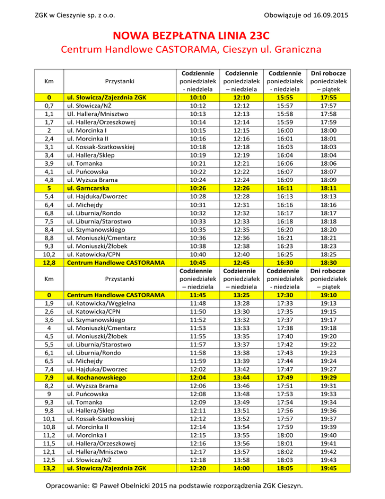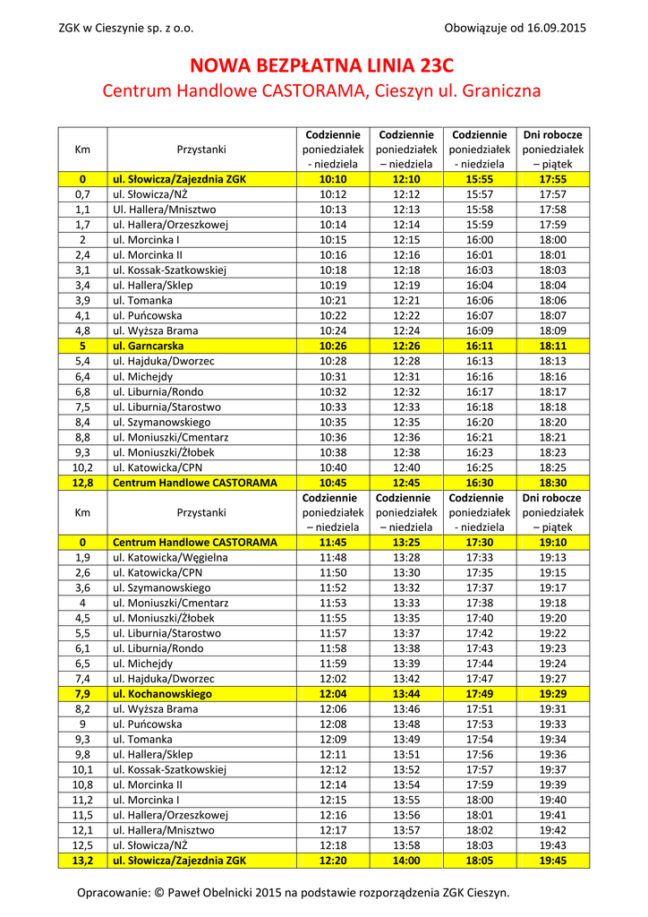 ZGK w Cieszynie sp. z o.o. Obowiązuje od 16.09.2015 NOWA BEZPŁATNA LINIA 23C Centrum Handlowe CASTORAMA, Cieszyn ul. Graniczna Km 0 0,7 1,1 1,7 2 2,4 3,1 3,4 3,9 4,1 4,8 5 5,4 6,4 6,8 7,5 8,4 8,8 9,3 10,2 12,8 Km 0 1,9 2,6 3,6 4 4,5 5,5 6,1 6,5 7,4 7,9 8,2 9 9,3 9,8 10,1 10,8 11,2 11,5 12,1 12,5 13,2 Przystanki ul. Słowicza/Zajezdnia ZGK ul. Słowicza/NŻ Ul. Hallera/Mnisztwo ul. Hallera/Orzeszkowej ul. Morcinka I ul. Morcinka II ul. Kossak-Szatkowskiej ul. Hallera/Sklep ul. Tomanka ul. Puńcowska ul. Wyższa Brama ul. Garncarska ul. Hajduka/Dworzec ul. Michejdy ul. Liburnia/Rondo ul. Liburnia/Starostwo ul. Szymanowskiego ul. Moniuszki/Cmentarz ul. Moniuszki/Żłobek ul. Katowicka/CPN Centrum Handlowe CASTORAMA Przystanki Centrum Handlowe CASTORAMA ul. Katowicka/Węgielna ul. Katowicka/CPN ul. Szymanowskiego ul. Moniuszki/Cmentarz ul. Moniuszki/Żłobek ul. Liburnia/Starostwo ul. Liburnia/Rondo ul. Michejdy ul. Hajduka/Dworzec ul. Kochanowskiego ul. Wyższa Brama ul. Puńcowska ul. Tomanka ul. Hallera/Sklep ul. Kossak-Szatkowskiej ul. Morcinka II ul. Morcinka I ul. Hallera/Orzeszkowej ul. Hallera/Mnisztwo ul. Słowicza/NŻ ul. Słowicza/Zajezdnia ZGK Codziennie Codziennie Codziennie Dni robocze poniedziałek poniedziałek poniedziałek poniedziałek - niedziela – niedziela - niedziela – piątek 10:10 12:10 15:55 17:55 10:12 12:12 15:57 17:57 10:13 12:13 15:58 17:58 10:14 12:14 15:59 17:59 10:15 12:15 16:00 18:00 10:16 12:16 16:01 18:01 10:18 12:18 16:03 18:03 10:19 12:19 16:04 18:04 10:21 12:21 16:06 18:06 10:22 12:22 16:07 18:07 10:24 12:24 16:09 18:09 10:26 12:26 16:11 18:11 10:28 12:28 16:13 18:13 10:31 12:31 16:16 18:16 10:32 12:32 16:17 18:17 10:33 12:33 16:18 18:18 10:35 12:35 16:20 18:20 10:36 12:36 16:21 18:21 10:38 12:38 16:23 18:23 10:40 12:40 16:25 18:25 10:45 12:45 16:30 18:30 Codziennie Codziennie Codziennie Dni robocze poniedziałek poniedziałek poniedziałek poniedziałek – niedziela – niedziela - niedziela – piątek 11:45 13:25 17:30 19:10 11:48 13:28 17:33 19:13 11:50 13:30 17:35 19:15 11:52 13:32 17:37 19:17 11:53 13:33 17:38 19:18 11:55 13:35 17:40 19:20 11:57 13:37 17:42 19:22 11:58 13:38 17:43 19:23 11:59 13:39 17:44 19:24 12:02 13:42 17:47 19:27 12:04 13:44 17:49 19:29 12:06 13:46 17:51 19:31 12:08 13:48 17:53 19:33 12:09 13:49 17:54 19:34 12:11 13:51 17:56 19:36 12:12 13:52 17:57 19:37 12:14 13:54 17:59 19:39 12:15 13:55 18:00 19:40 12:16 13:56 18:01 19:41 12:17 13:57 18:02 19:42 12:18 13:58 18:03 19:43 12:20 14:00 18:05 19:45 Opracowanie: © Paweł Obelnicki 2015 na podstawie rozporządzenia ZGK Cieszyn.