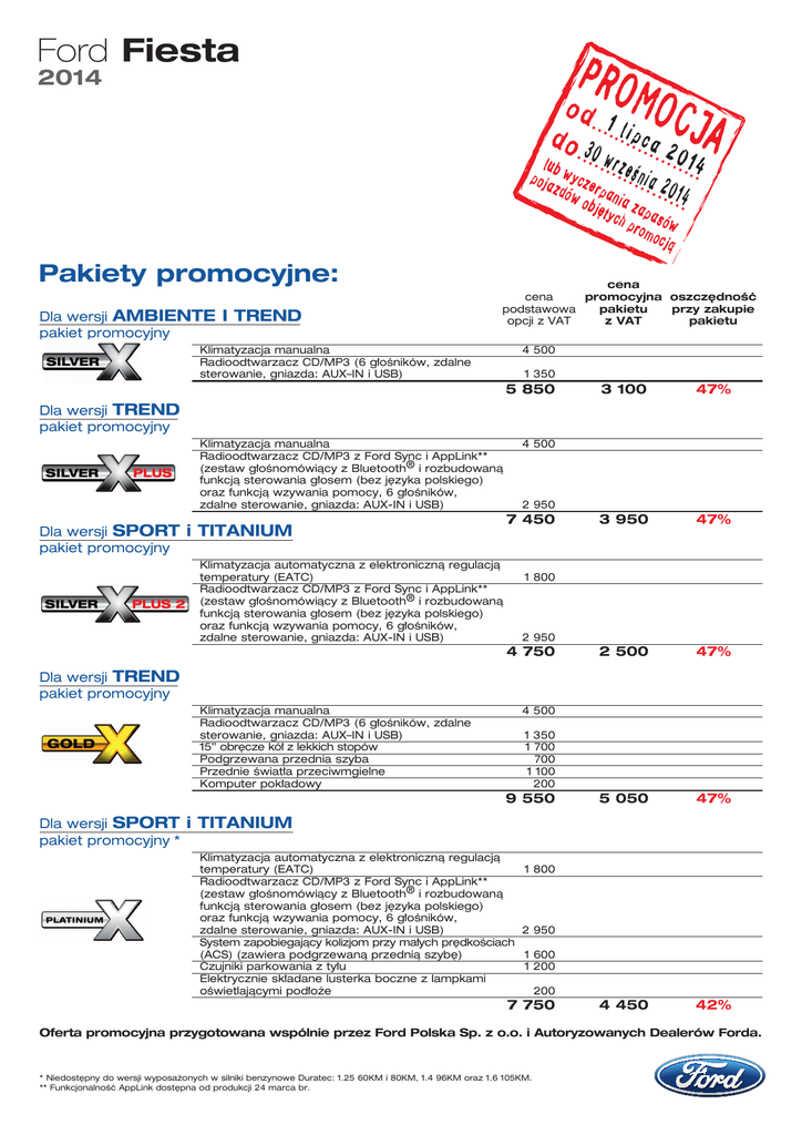 Ford Fiesta PRO 2014 MOC od. .1 do. 3 ...l.i.p..c..a 2 ... 0 ..0 JA ..w. r z ...1.4 lub . poja wycze ...e.Ê.n.i a . 2 zdów rpa . 0 . obj´ nia za ...1 4. tych pasó prom w ocjà Pakiety promocyjne: Dla wersji AMBIENTE pakiet promocyjny I TREND cena cena promocyjna oszcz´dnoÊç podstawowa pakietu przy zakupie opcji z VAT z VAT pakietu Klimatyzacja manualna Radioodtwarzacz CD/MP3 (6 g∏oÊników, zdalne sterowanie, gniazda: AUX–IN i USB) 4 500 1 350 5 850 3 100 47% 3 950 47% 2 500 47% 5 050 47% 4 450 42% Dla wersji TREND pakiet promocyjny Klimatyzacja manualna Radioodtwarzacz CD/MP3 z Ford Sync i AppLink** (zestaw g∏oÊnomówiàcy z Bluetooth® i rozbudowanà funkcjà sterowania g∏osem (bez j´zyka polskiego) oraz funkcjà wzywania pomocy, 6 g∏oÊników, zdalne sterowanie, gniazda: AUX-IN i USB) Dla wersji SPORT pakiet promocyjny i TITANIUM 4 500 2 950 7 450 Klimatyzacja automatyczna z elektronicznà regulacjà temperatury (EATC) Radioodtwarzacz CD/MP3 z Ford Sync i AppLink** (zestaw g∏oÊnomówiàcy z Bluetooth® i rozbudowanà funkcjà sterowania g∏osem (bez j´zyka polskiego) oraz funkcjà wzywania pomocy, 6 g∏oÊników, zdalne sterowanie, gniazda: AUX-IN i USB) 1 800 2 950 4 750 Dla wersji TREND pakiet promocyjny Klimatyzacja manualna Radioodtwarzacz CD/MP3 (6 g∏oÊników, zdalne sterowanie, gniazda: AUX–IN i USB) 15” obr´cze kó∏ z lekkich stopów Podgrzewana przednia szyba Przednie Êwiat∏a przeciwmgielne Komputer pok∏adowy 4 500 1 350 1 700 700 1 100 200 9 550 Dla wersji SPORT pakiet promocyjny * i TITANIUM Klimatyzacja automatyczna z elektronicznà regulacjà temperatury (EATC) Radioodtwarzacz CD/MP3 z Ford Sync i AppLink** (zestaw g∏oÊnomówiàcy z Bluetooth® i rozbudowanà funkcjà sterowania g∏osem (bez j´zyka polskiego) oraz funkcjà wzywania pomocy, 6 g∏oÊników, zdalne sterowanie, gniazda: AUX-IN i USB) System zapobiegajàcy kolizjom przy ma∏ych pr´dkoÊciach (ACS) (zawiera podgrzewanà przednià szyb´) Czujniki parkowania z ty∏u Elektrycznie sk∏adane lusterka boczne z lampkami oÊwietlajàcymi pod∏o˝e 1 800 2 950 1 600 1 200 200 7 750 Oferta promocyjna przygotowana wspólnie przez Ford Polska Sp. z o.o. i Autoryzowanych Dealerów Forda. * Niedost´pny do wersji wyposa˝onych w silniki benzynowe Duratec: 1.25 60KM i 80KM, 1.4 96KM oraz 1.6 105KM. ** FunkcjonalnoÊç AppLink dost´pna od produkcji 24 marca br.