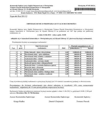 Komornik Sądowy przy Sądzie Rejonowym w Oświęcimiu Oświęcim, 07-05-2012r. Tomasz Paszek Kancelaria Komornicza w Oświęcimiu ul. Rynek Główny 12, 32-600 Oświęcim tel./fax: 33 842 26 12; e-mail: [email protected]; www.komornikpaszek.pl Konto bankowe: ING Bank Śląski SA o/ Kęty: 37 1050 1113 1000 0090 7011 8550 *9012050702425* Sygn.akt Km 281/12 OBWIESZCZENIE O PIERWSZEJ LICYTACJI RUCHOMOŚCI Komornik Sądowy przy Sądzie Rejonowym w Oświęcimiu Tomasz Paszek Kancelaria Komornicza w Oświęcimiu mający kancelarię w Oświęcimiu przy ul. Rynek Główny 12 na podstawie art. 867 kpc podaje do publicznej wiadomości, że w dniu 12-06-2012 roku o godz. 10.00 odbędzie się w kancelarii komornika w Oświęcimiu przy ul. Rynek Główny 12 pierwsza licytacja ruchomości. Przedmiotem licytacji są następujące ruchomości: Nr prot. L.p. 1 2 3 4 5 6 7 8 9 10 11 1 10 11 2 3 4 5 6 7 8 9 Opis licytowanej ruchomości ilość Pełny łańcuch - złoto z krzyżykiem Pierścionek złoty - góra zdobiona Pierścionek złoty ozdoba z cekinków Łańcuszek złoty - cienki Łańcuszek złoty - urwany cienki Kolczyki (para) złote z diamencikami Kolczyki złote + cyrkonia fioletowa (para) Krzyżyk złoty z Jezusem Obrączka złota bez ozdób Pierścionek złoty ozdoba z białego złota Pierścionek złoty - ozdoba z szafirem niebieskim 1,00 1,00 1,00 1,00 1,00 1,00 1,00 1,00 1,00 1,00 1,00 Wartość szacunkowa w zł. jednostkowa łączna 2.000,00 zł 200,00 zł 500,00 zł 300,00 zł 100,00 zł 400,00 zł 200,00 zł 100,00 zł 250,00 zł 250,00 zł 800,00 zł 2.000,00 zł 200,00 zł 500,00 zł 300,00 zł 100,00 zł 400,00 zł 200,00 zł 100,00 zł 250,00 zł 250,00 zł 800,00 zł Ceną wywoławczą każdej ruchomości w powyższej licytacji jest 3/4 wartości szacunkowej podanej w obwieszczeniu. Przystępujący do licytacji zobowiązany jest złożyć rękojmię w wysokości 10% ceny oszacowania ruchomości, najpóźniej do 15 min przed godziną rozpoczęcia licytacji. Ruchomości będące przedmiotem niniejszej licytacji można oglądać w dniu 11-06-2012 w godzinach 10.00-12.00 pod adresem: Brzeźnica 286, 32-700 Bochnia Asesor Komornika Sądowego Kinga Radke Asesor Komornika Sądowego Daniel Chojnacki Komornik Sądowy Tomasz Paszek