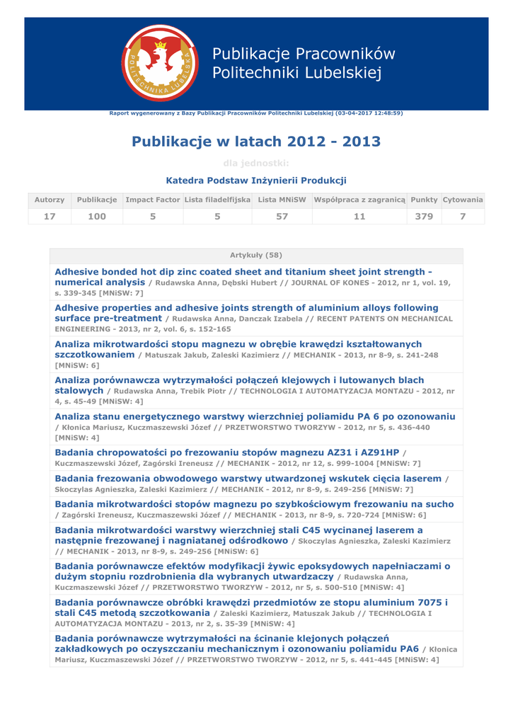 Raport wygenerowany z Bazy Publikacji Pracowników Politechniki Lubelskiej (03-04-2017 12:48:59) Publikacje w latach 2012 - 2013 dla jednostki: Katedra Podstaw Inżynierii Produkcji Autorzy Publikacje 17 100 Impact Factor Lista filadelfijska 5 Lista MNiSW 5 57 Współpraca z zagranicą Punkty Cytowania 11 379 7 Artykuły (58) Adhesive bonded hot dip zinc coated sheet and titanium sheet joint strength numerical analysis / Rudawska Anna, Dębski Hubert // JOURNAL OF KONES - 2012, nr 1, vol. 19, s. 339-345 [MNiSW: 7] Adhesive properties and adhesive joints strength of aluminium alloys following surface pre-treatment / Rudawska Anna, Danczak Izabela // RECENT PATENTS ON MECHANICAL ENGINEERING - 2013, nr 2, vol. 6, s. 152-165 Analiza mikrotwardości stopu magnezu w obrębie krawędzi kształtowanych szczotkowaniem / Matuszak Jakub, Zaleski Kazimierz // MECHANIK - 2013, nr 8-9, s. 241-248 [MNiSW: 6] Analiza porównawcza wytrzymałości połączeń klejowych i lutowanych blach stalowych / Rudawska Anna, Trebik Piotr // TECHNOLOGIA I AUTOMATYZACJA MONTAZU - 2012, nr 4, s. 45-49 [MNiSW: 4] Analiza stanu energetycznego warstwy wierzchniej poliamidu PA 6 po ozonowaniu / Kłonica Mariusz, Kuczmaszewski Józef // PRZETWORSTWO TWORZYW - 2012, nr 5, s. 436-440 [MNiSW: 4] Badania chropowatości po frezowaniu stopów magnezu AZ31 i AZ91HP / Kuczmaszewski Józef, Zagórski Ireneusz // MECHANIK - 2012, nr 12, s. 999-1004 [MNiSW: 7] Badania frezowania obwodowego warstwy utwardzonej wskutek cięcia laserem / Skoczylas Agnieszka, Zaleski Kazimierz // MECHANIK - 2012, nr 8-9, s. 249-256 [MNiSW: 7] Badania mikrotwardości stopów magnezu po szybkościowym frezowaniu na sucho / Zagórski Ireneusz, Kuczmaszewski Józef // MECHANIK - 2013, nr 8-9, s. 720-724 [MNiSW: 6] Badania mikrotwardości warstwy wierzchniej stali C45 wycinanej laserem a następnie frezowanej i nagniatanej odśrodkowo / Skoczylas Agnieszka, Zaleski Kazimierz // MECHANIK - 2013, nr 8-9, s. 249-256 [MNiSW: 6] Badania porównawcze efektów modyfikacji żywic epoksydowych napełniaczami o dużym stopniu rozdrobnienia dla wybranych utwardzaczy / Rudawska Anna, Kuczmaszewski Józef // PRZETWORSTWO TWORZYW - 2012, nr 5, s. 500-510 [MNiSW: 4] Badania porównawcze obróbki krawędzi przedmiotów ze stopu aluminium 7075 i stali C45 metodą szczotkowania / Zaleski Kazimierz, Matuszak Jakub // TECHNOLOGIA I AUTOMATYZACJA MONTAZU - 2013, nr 2, s. 35-39 [MNiSW: 4] Badania porównawcze wytrzymałości na ścinanie klejonych połączeń zakładkowych po oczyszczaniu mechanicznym i ozonowaniu poliamidu PA6 / Kłonica Mariusz, Kuczmaszewski Józef // PRZETWORSTWO TWORZYW - 2012, nr 5, s. 441-445 [MNiSW: 4] Badania sił skrawania i ich amplitud podczas frezowania stopów magnezu / Kuczmaszewski Józef, Zagórski Ireneusz // POSTEPY NAUKI I TECHNIKI / ADVANCES IN SCIENCE AND TECHNOLOGY - 2012, nr 15, s. 228-237 [MNiSW: 4] Badania skuteczności klejenia poliamidu PA6 oraz politetrafluoroetylenu (PTFE) / Kłonica Mariusz, Kuczmaszewski Józef // TECHNOLOGIA I AUTOMATYZACJA MONTAZU - 2013, nr 3, s. 45-49 [MNiSW: 4] Badania stanu krawędzi przedmiotów ze stopów aluminium po procesie usuwania zadziorów / Matuszak Jakub, Zaleski Kazimierz // MECHANIK - 2012, nr 8-9, s. 191-198 [MNiSW: 7] Badania wpływu parametrów nagniatania wibracyjnego na trwałość zmęczeniową elementów ze stopu tytanu / Zaleski Kazimierz // INŻYNIERIA MATERIAŁOWA - 2012, nr 3, s. 215-218 [MNiSW: 7] Badania wytrzymałości połączeń klejowych w podwyższonej temperaturze po modyfikacji żywicy epoksydowej montmorylonitem / Biruk-Urban Katarzyna, Kuczmaszewski Józef // PRZETWORSTWO TWORZYW - 2012, nr 5, s. 414-417 [MNiSW: 4] Badanie masy, temperatury zapłonu oraz temperatury wiórów podczas skrawania wybranych stopów magnezu / Kuczmaszewski Józef, Zagórski Ireneusz // MECHANIK - 2012, nr 10, s. 824-828 [MNiSW: 7] Comparative analysis of energetic properties of Ti6AI4V titanium and EN-AW-2017A(PA6) aluminum alloy surface layers for an adhesive bonding application / Kwiatkowski Michał, Kłonica Mariusz, Kuczmaszewski Józef, Satoh Saburoh // OZONE-SCIENCE & ENGINEERING - 2013, nr 3, vol. 35, s. 220-228 [MNiSW: 15] Comparative study in the passive force and cutting torque in the milling process of polymer matrix composites and aluminum alloys / Ciecieląg Krzysztof, Zaleski Kazimierz // ADVANCES IN SCIENCE AND TECHNOLOGY RESEARCH JOURNAL - 2013, nr 18, vol. 7, s. 6-12 [MNiSW: 5] Effect of brushing parameters upon edge states after wire brushing of AZ91 HP magnesium alloy / Matuszak Jakub, Zaleski Kazimierz // ADVANCES IN SCIENCE AND TECHNOLOGY RESEARCH JOURNAL - 2013, nr 20, vol. 7, s. 55-60 [MNiSW: 5] Experimental methods for determining uncertainty of measurement using inspection probes / Jacniacka Elżbieta, Semotiuk Leszek // EKSPLOATACJA I NIEZAWODNOSC-MAINTENANCE AND RELIABILITY - 2013, nr 3, vol. 15, s. 246-252 [MNiSW: 15] Grinding tools and grinding wheels for shaping CNC grinding machine / Kral Jan, Spišák Emil, Kral jr. Jan, Józwik Jerzy // POSTEPY NAUKI I TECHNIKI / ADVANCES IN SCIENCE AND TECHNOLOGY - 2012, nr 15, s. 221-227 [MNiSW: 4] Investigation and assessment of occupational risk on the metal cutting machine tool stand / Józwik Jerzy, Pietras Paweł // ADVANCES IN SCIENCE AND TECHNOLOGY RESEARCH JOURNAL - 2013, nr 20, vol. 7, s. 47-54 [MNiSW: 5] A knowledge base of the functional properties of the conveyor belt adhesive joint for FEM simulation of Its stress and strain state / Mazurkiewicz Dariusz // JOURNAL OF ADHESION SCIENCE AND TECHNOLOGY - 2012, nr 10-11, vol. 26, s. 1429-1442 [MNiSW: 25] Measurement uncertainty analysis of different cnc machine tools measurement systems / Semotiuk Leszek, Józwik Jerzy, Kuric Ivan // ADVANCES IN SCIENCE AND TECHNOLOGY RESEARCH JOURNAL - 2013, nr 19, vol. 7, s. 41-47 [MNiSW: 5] Methodological problems of temperature measurement in the cutting area during milling magnesium alloys / Kuczmaszewski Józef, Zagórski Ireneusz // 