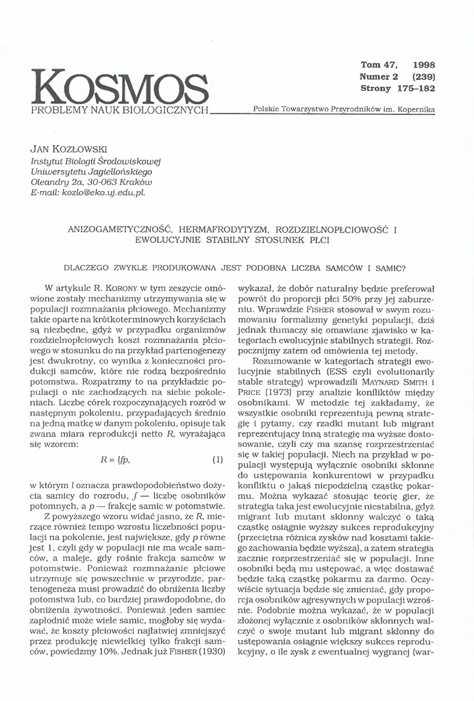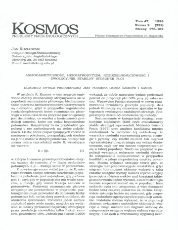 Tom 47, 1998 Numer 2 (239) Strony 175-182 Kosmos PROBLEMY NAUK BIOLOGICZNYCH ____________ Polskie Towarzystwo Przyrodników im. Kopernika Jan K o zło w ski Instytut Biologii Środowiskowej Uniwersytetu Jagiellońskiego Oleandry 2a, 30-063 Kraków E-mail: [email protected]. ANIZOGAMETYCZNOSC, HERMAFRODYTYZM, ROZDZIELNOPŁCIOWOŚĆ I EWOLUCYJNIE STABILNY STOSUNEK PŁCI DLACZEGO ZW YKLE PRODUKOW ANA JEST PO D O BNA LICZBA SAM CÓ W I SAMIC? W artykule R. K o r o n y w tym zeszycie omó wione zostały mechanizmy utrzymywania się w populacji rozmnażania płciowego. Mechanizmy takie oparte na krótkoterminowych korzyściach są niezbędne, gdyż w przypadku organizmów rozdzielnopłciowych koszt rozmnażania płcio wego w stosunku do na przykład partenogenezy jest dwukrotny, co wynika z konieczności pro dukcji samców, które nie rodzą bezpośrednio potomstwa. Rozpatrzmy to na przykładzie po pulacji o nie zachodzących na siebie pokole niach. Liczbę córek rozpoczynających rozród w następnym pokoleniu, przypadających średnio na jedną matkę w danym pokoleniu, opisuje tak zwana miara reprodukcji netto R, wyrażająca się wzorem: R=lfp, (1) w którym l oznacza prawdopodobieństwo doży cia samicy do rozrodu, f — liczbę osobników potomnych, a p — frakcję samic w potomstwie. Z powyższego wzoru widać jasno, że R, mie rzące również tempo wzrostu liczebności popu lacji na pokolenie, jest największe, gdy p równe jest 1, czyli gdy w populacji nie ma wcale sam ców, a maleje, gdy rośnie frakcja samców w potomstwie. Ponieważ rozmnażanie płciowe utrzymuje się powszechnie w przyrodzie, partenogeneza musi prowadzić do obniżenia liczby potomstwa lub, co bardziej prawdopodobne, do obniżenia żywotności. Ponieważ jeden samiec zapłodnić może wiele samic, mogłoby się wyda wać, że koszty płciowości najłatwiej zmniejszyć przez produkcję niewielkiej tylko frakcji sam ców, powiedzmy 10%. Jednak już F is h e r (1930) wykazał, że dobór naturalny będzie preferował powrót do proporcji płci 50% przy jej zaburze niu. Wprawdzie F is h e r stosował w swym rozu mowaniu formalizmy genetyki populacji, dziś jednak tłumaczy się omawiane zjawisko w ka tegoriach ewolucyjnie stabilnych strategii. Roz pocznijmy zatem od omówienia tej metody. Rozumowanie w kategoriach strategii ewo lucyjnie stabilnych (ESS czyli evolutionarily stable strategy) wprowadzili M a y n a rd S m ith i P r i c e (1973) przy analizie konfliktów między osobnikami. W metodzie tej zakładamy, że wszystkie osobniki reprezentują pewną strate gię i pytamy, czy rzadki mutant lub migrant reprezentujący inną strategię ma wyższe dosto sowanie, czyli czy ma szansę rozprzestrzeniać się w takiej populacji. Niech na przykład w po pulacji występują wyłącznie osobniki skłonne do ustępowania konkurentowi w przypadku konfliktu o jakąś niepodzielną cząstkę pokar mu. Można wykazać stosując teorię gier, że strategia taka jest ewolucyjnie niestabilna, gdyż migrant lub mutant skłonny walczyć o taką cząstkę osiągnie wyższy sukces reprodukcyjny (przeciętna różnica zysków nad kosztami takie go zachowania będzie wyższa), a zatem strategia zacznie rozprzestrzeniać się w populacji. Inne osobniki będą mu ustępować, a więc dostawać będzie taką cząstkę pokarmu za darmo. Oczy wiście sytuacja będzie się zmieniać, gdy propo rcja osobników agresywnych w populacji wzroś nie. Podobnie można wykazać, że w populacji złożonej wyłącznie z osobników skłonnych wal czyć o swoje mutant lub migrant skłonny do ustępowania osiągnie większy sukces reprodu kcyjny, o ile zysk z ewentualnej wygranej (war 176 J a n K ozłow ski tość energetyczna cząstki pokarmu) będzie niż szy od straty w przypadku przegranej (śmierć lub zranienie). Wynika to stąd, że w populacji złożonej z osobników agresywnych konflikt jest nieunikniony, a zysk netto jest ujemny. W tym konkretnym przypadku nie jest ewolucyjnie stabilna ani strategia polegająca na bezwzględ nym ustępowaniu, ani na bezwzględnej walce. Stabilna jest strategia mieszana, polegająca na tym, że albo część osobników walczy, a część ustępuje, albo te same osobniki raz walczą, a raz ustępują. Przypuśćmy, że mamy do czynie nia z tym drugim przypadkiem. To, jaka jest ewolucyjnie stabilna proporcja zachowań agre sywnych zależy od stosunku potencjalnych zy sków i strat w przypadku, gdy dojdzie do kon fliktu. Jeśli taka ewolucyjnie stabilna proporcja zostanie osiągnięta, inwazja mutantów lub mi grantów reprezentujących wszystkie inne pro porcje jest niemożliwa. Metoda ESS znalazła zastosowanie również w badaniach innych pro blemów ewolucyjnych, a jej dokładniejsze omó wienie znaleźć można w podręczniku K r z a n o w s k ie j i współaut. (1995). Stosując metodę ESS można zatem powie dzieć, że inny niż 50% stosunek każdej płci w potomstwie jest ewolucyjnie niestabilny. Wyni ka to z prostego faktu, że każdy organizm po wstały w wyniku rozmnażania płciowego ma jedną matkę i jednego ojca. Wyobraźmy sobie, że wszystkie osobniki w populacji produkują 90% samic i 10% samców. Każdy samiec zapładnia zatem średnio jaja 9 samic, czyli jest ojcem potomstwa 9 samic. Niech każda z nich składa 100 jaj. Zatem samiec będzie przeciętnie ojcem 900 potomków, a samica tylko stu. W su mie da to samicy produkującej 90% żeńskiego i 10% męskiego potomstwa 90xl00+10x 9x100 = 18 000 wnuków i wnuczek. Wyobraźmy sobie teraz, że zajdzie mutacja polegająca na zwię kszeniu proporcji samców w potomstwie do 20%. Ponieważ nosiciele tej mutacji są począt kowo bardzo nieliczni, nie wpłyną w sposób istotny na proporcję płci, która będzie dalej wynosić 1:9, a zatem dalej każdy samiec zapładniać będzie przeciętnie jaja 9 samic. Liczba wnuków i wnuczek wyniesie wtedy 80x100+20 x 9x100 = 26 000. Zatem genotyp produkujący 20% samców będzie się rozprzestrzeniać w po 