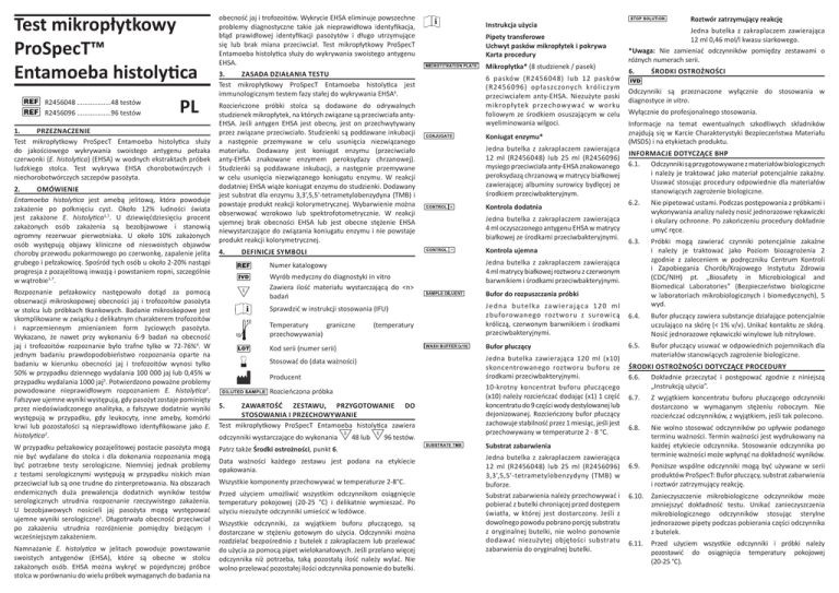 Test mikropłytkowy ProSpecT™ Entamoeba histolytica R2456048 ..................48 testów R2456096 ..................96 testów PL 1. PRZEZNACZENIE Test mikropłytkowy ProSpecT Entamoeba histolytica służy do jakościowego wykrywania swoistego antygenu pełzaka czerwonki (E. histolytica) (EHSA) w wodnych ekstraktach próbek ludzkiego stolca. Test wykrywa EHSA chorobotwórczych i niechorobotwórczych szczepów pasożyta. 2. Omówienie Entamoeba histolytica jest amebą jelitową, która powoduje zakażenie po połknięciu cyst. Około 12% ludności świata jest zakażone E. histolytica1,7. U dziewięćdziesięciu procent zakażonych osób zakażenia są bezobjawowe i stanowią ogromny rezerwuar pierwotniaka. U około 10% zakażonych osób występują objawy kliniczne od nieswoistych objawów choroby przewodu pokarmowego po czerwonkę, zapalenie jelita grubego i pełzakowicę. Spośród tych osób u około 2-20% nastąpi progresja z pozajelitową inwazją i powstaniem ropni, szczególnie w wątrobie1,7. Rozpoznanie pełzakowicy następowało dotąd za pomocą obserwacji mikroskopowej obecności jaj i trofozoitów pasożyta w stolcu lub próbkach tkankowych. Badanie mikroskopowe jest skomplikowane w związku z delikatnym charakterem trofozoitów i naprzemiennym zmienianiem form życiowych pasożyta. Wykazano, że nawet przy wykonaniu 6-9 badań na obecność jaj i trofozoitów rozpoznanie było trafne tylko w 72-76%4. W jednym badaniu prawdopodobieństwo rozpoznania oparte na badaniu w kierunku obecności jaj i trofozoitów wynosi tylko 50% w przypadku dziennego wydalania 100 000 jaj lub 0,45% w przypadku wydalania 1000 jaj3. Potwierdzono poważne problemy powodowane nieprawidłowym rozpoznaniem E. histolytica2. Fałszywe ujemne wyniki występują, gdy pasożyt zostaje pominięty przez niedoświadczonego analityka, a fałszywe dodatnie wyniki występują w przypadku, gdy leukocyty, inne ameby, komórki krwi lub pozostałości są nieprawidłowo identyfikowane jako E. histolytica2. W przypadku pełzakowicy pozajelitowej postacie pasożyta mogą nie być wydalane do stolca i dla dokonania rozpoznania mogą być potrzebne testy serologiczne. Niemniej jednak problemy z testami serologicznymi występują w przypadku niskich mian przeciwciał lub są one trudne do zinterpretowania. Na obszarach endemicznych duża prewalencja dodatnich wyników testów serologicznych utrudnia rozpoznanie rzeczywistego zakażenia. U bezobjawowych nosicieli jaj pasożyta mogą występować ujemne wyniki serologiczne1. Długotrwała obecność przeciwciał po zakażeniu utrudnia rozróżnienie pomiędzy bieżącym i wcześniejszym zakażeniem. Namnażanie E. histolytica w jelitach powoduje powstawanie swoistych antygenów (EHSA), które są obecne w stolcu zakażonych osób. EHSA można wykryć w pojedynczej próbce stolca w porównaniu do wielu próbek wymaganych do badania na obecność jaj i trofozoitów. Wykrycie EHSA eliminuje powszechne problemy diagnostyczne takie jak nieprawidłowa identyfikacja, błąd prawidłowej identyfikacji pasożytów i długo utrzymujące się lub brak miana przeciwciał. Test mikropłytkowy ProSpecT Entamoeba histolytica służy do wykrywania swoistego antygenu EHSA. 3. ZASADA DZIAŁANIA Testu Test mikropłytkowy ProSpecT Entamoeba histolytica jest immunologicznym testem fazy stałej do wykrywania EHSA6. Rozcieńczone próbki stolca są dodawane do odrywalnych studzienek mikropłytek, na których związane są przeciwciała antyEHSA. Jeśli antygen EHSA jest obecny, jest on przechwytywany przez związane przeciwciało. Studzienki są poddawane inkubacji a następnie przemywane w celu usunięcia niezwiązanego materiału. Dodawany jest koniugat enzymu (przeciwciało anty-EHSA znakowane enzymem peroksydazy chrzanowej). Studzienki są poddawane inkubacji, a następnie przemywane w celu usunięcia niezwiązanego koniugatu enzymu. W reakcji dodatniej EHSA wiąże koniugat enzymu do studzienki. Dodawany jest substrat dla enzymu 3,3’,5,5’-tetrametylobenzydyna (TMB) i powstaje produkt reakcji kolorymetrycznej. Wybarwienie można obserwować wzrokowo lub spektrofotometrycznie. W reakcji ujemnej brak obecności EHSA lub jest obecne stężenie EHSA niewystarczające do związania koniugatu enzymu i nie powstaje produkt reakcji kolorymetrycznej. 4. Instrukcja użycia Pipety transferowe Uchwyt pasków mikropłytek i pokrywa Karta procedury Mikropłytka* (8 studzienek / pasek) 6 pasków (R2456048) lub 12 pasków (R2456096) opłaszczonych króliczym przeciwciałem anty-EHSA. Niezużyte paski mikropłytek przechowywać w worku foliowym ze środkiem osuszającym w celu wyeliminowania wilgoci. Koniugat enzymu* Jedna butelka z zakraplaczem zawierająca 12 ml (R2456048) lub 25 ml (R2456096) mysiego przeciwciała anty-EHSA znakowanego peroksydazą chrzanową w matrycy białkowej zawierającej albuminy surowicy bydlęcej ze środkiem przeciwbakteryjnym. Wyrób medyczny do diagnostyki in vitro Zawiera ilość materiału wystarczającą do <n> badań Sprawdzić w instrukcji stosowania (IFU) Temperatury graniczne przechowywania) Kod serii (numer serii) 5. Zawartość zestawu, przygotowanie do stosowania i przechowywanie Test mikropłytkowy ProSpecT Entamoeba histolytica zawiera odczynniki wystarczające do wykonania 48 lub 96 testów. Patrz także Środki ostrożności, punkt 6. Data ważności każdego zestawu jest podana na etykiecie opakowania. Wszystkie komponenty przechowywać w temperaturze 2-8°C. Przed użyciem umożliwić wszystkim odczynnikom osiągnięcie temperatury pokojowej (20-25 °C) i delikatnie wymieszać. Po użyciu niezużyte odczynniki umieścić w lodówce. Wszystkie odczynniki, za wyjątkiem buforu płuczącego, są dostarczane w stężeniu gotowym do użycia. Odczynniki można rozdzielać bezpośrednio z butelek z zakraplaczem lub przelewać do użycia za pomocą pipet wielokanałowych. Jeśli przelano więcej odczynnika niż potrzeba, taką pozostałą ilość należy wylać. N
