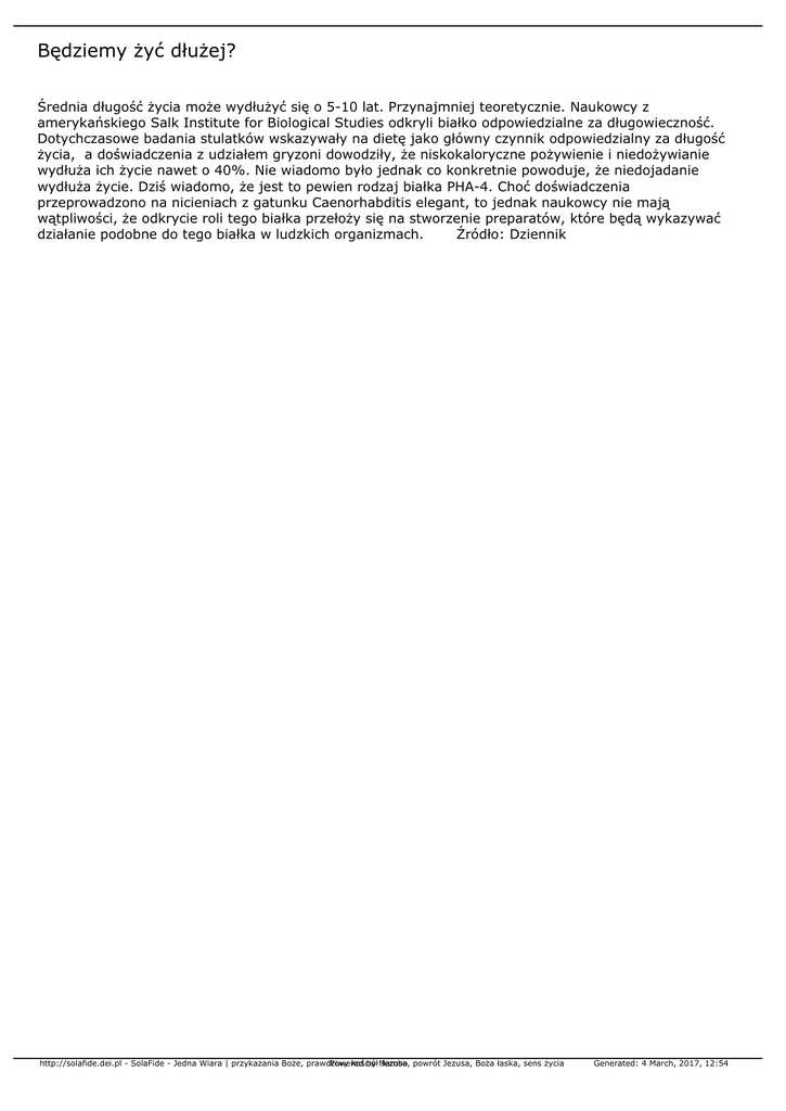 Będziemy żyć dłużej? Średnia długość życia może wydłużyć się o 5-10 lat. Przynajmniej teoretycznie. Naukowcy z amerykańskiego Salk Institute for Biological Studies odkryli białko odpowiedzialne za długowieczność. Dotychczasowe badania stulatków wskazywały na dietę jako główny czynnik odpowiedzialny za długość życia, a doświadczenia z udziałem gryzoni dowodziły, że niskokaloryczne pożywienie i niedożywianie wydłuża ich życie nawet o 40%. Nie wiadomo było jednak co konkretnie powoduje, że niedojadanie wydłuża życie. Dziś wiadomo, że jest to pewien rodzaj białka PHA-4. Choć doświadczenia przeprowadzono na nicieniach z gatunku Caenorhabditis elegant, to jednak naukowcy nie mają wątpliwości, że odkrycie roli tego białka przełoży się na stworzenie preparatów, które będą wykazywać działanie podobne do tego białka w ludzkich organizmach. Źródło: Dziennik http://solafide.dei.pl - SolaFide - Jedna Wiara | przykazania Boże, prawdziwy Powered kościół by Mambo Jezusa, powrót Jezusa, Boża łaska, sens życia Generated: 4 March, 2017, 12:54