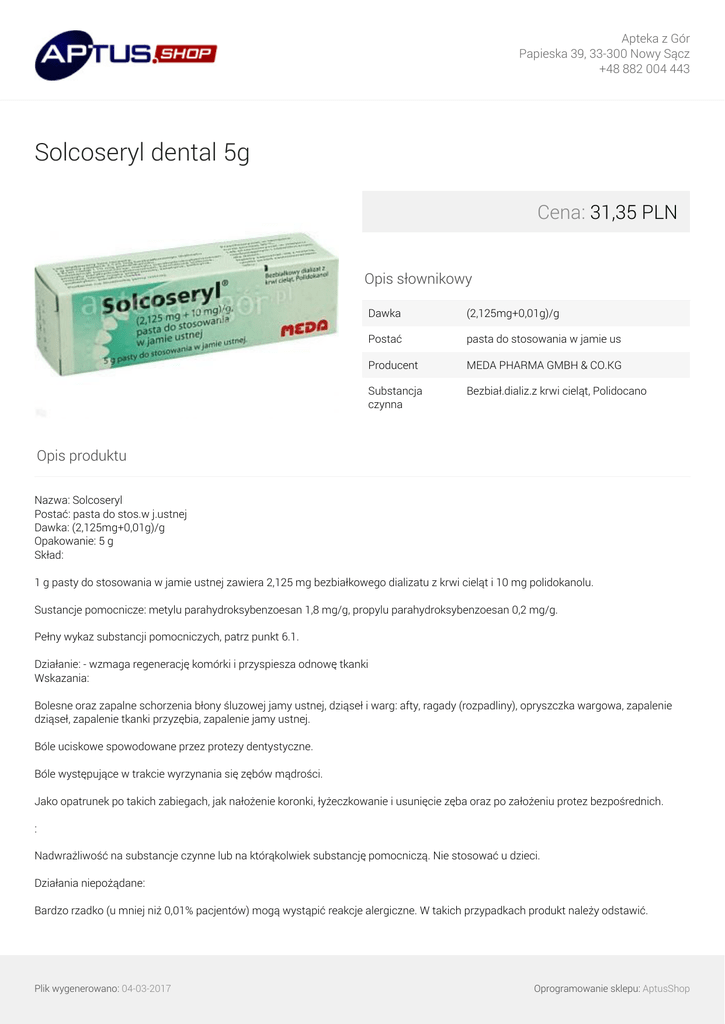 Apteka z Gór Papieska 39, 33-300 Nowy Sącz +48 882 004 443 Solcoseryl dental 5g Cena: 31,35 PLN Opis słownikowy Dawka (2,125mg+0,01g)/g Postać pasta do stosowania w jamie us Producent MEDA PHARMA GMBH & CO.KG Substancja czynna Bezbiał.dializ.z krwi cieląt, Polidocano Opis produktu Nazwa: Solcoseryl Postać: pasta do stos.w j.ustnej Dawka: (2,125mg+0,01g)/g Opakowanie: 5 g Skład: 1 g pasty do stosowania w jamie ustnej zawiera 2,125 mg bezbiałkowego dializatu z krwi cieląt i 10 mg polidokanolu. Sustancje pomocnicze: metylu parahydroksybenzoesan 1,8 mg/g, propylu parahydroksybenzoesan 0,2 mg/g. Pełny wykaz substancji pomocniczych, patrz punkt 6.1. Działanie: - wzmaga regenerację komórki i przyspiesza odnowę tkanki Wskazania: Bolesne oraz zapalne schorzenia błony śluzowej jamy ustnej, dziąseł i warg: afty, ragady (rozpadliny), opryszczka wargowa, zapalenie dziąseł, zapalenie tkanki przyzębia, zapalenie jamy ustnej. Bóle uciskowe spowodowane przez protezy dentystyczne. Bóle występujące w trakcie wyrzynania się zębów mądrości. Jako opatrunek po takich zabiegach, jak nałożenie koronki, łyżeczkowanie i usunięcie zęba oraz po założeniu protez bezpośrednich. : Nadwrażliwość na substancje czynne lub na którąkolwiek substancję pomocniczą. Nie stosować u dzieci. Działania niepożądane: Bardzo rzadko (u mniej niż 0,01% pacjentów) mogą wystąpić reakcje alergiczne. W takich przypadkach produkt należy odstawić. Plik wygenerowano: 04-03-2017 Oprogramowanie sklepu: AptusShop Apteka z Gór Papieska 39, 33-300 Nowy Sącz +48 882 004 443 Interakcje: Dotychczas nie stwierdzono by Solcoseryl w postaci pasty do stosowania w jamie ustnej podawany miejscowo wykazywał interakcje z innymi lekami. Dawkowanie: Pasek pasty o długości ok. 0,5 cm należy nakładać cienką warstwą na zmienione chorobowo miejsce od 3 do 5 razy na dobę. Produkt należy stosować aż do ustąpienia objawów. Szczególnie korzystne jest stosowanie produktu przed snem. Pasty nie należy wcierać ani rozcierać. Aby dobrze przylegała, należy ją nakładać suchym palcem, a miejsce, na które ma być podana należy wcześniej wysuszyć.Produkt tworzy błonę ochronną, która długo przylega do błony śluzowej jamy ustnej chroniąc ją przed podrażnieniem w trakcie spożywania pokarmów. Pacjenci w podeszłym wieku: Nie ma potrzeby zmiany dawkowania. Pacjenci z zaburzeniami czynności wątroby i nerek: Nie ma potrzeby zmiany dawkowania. Środki ostrożności: Produktu nie należy podawać do wnętrza ran, które mają być leczone przy użyciu szwów adaptacyjnych głębokich (np. po ekstrakcji zębów trzonowych i wklinowanych, zębów mądrości czy po resekcji wierzchołkowej korzenia zęba). W przypadku ostrego zakażenia w obrębie zmiany chorobowej przed zastosowaniem produktu należy przeprowadzić odpowiednie leczenie przyczynowe. Produkt zawiera metylu parahydroksybenzoesan i propylu parahydroksybenzoesan - może powodować reakcje alergiczne (możliwe reakcje typu późnego). Prowadzenie pojazdów: Dotychczas nie stwierdzono, by produkt wpływał na zdolność prowadzenia pojazdów mechanicznych i obsługiwania urządzeń mechanicznych w ruchu. Przedawkowanie: Dotychczas nie odnotowano żadnego przypadku objawowego przedawkowania produktu. W razie przypadkowego lub omyłkowego połknięcia dużej ilości produktu należy podjąć działania mające na celu usunięcie go z organizmu (wywoływanie wymiotów, płukanie żołądka). Ciąża: Badania na zwierzętach dotyczące wpływu na przebieg ciąży i (lub) rozwój zarodka (płodu) i (lub) przebieg porodu i (lub) rozwój pourodzeniowy (patrz punkt 5.3) są niewystarczające. Zagrożenie dla człowieka nie jest znane. Produktu Solcoseryl nie stosować w okresie ciąży, jeśli nie jest to bezwzględnie konieczne. Produkt Solcoseryl pasta do stosowania w jamie ustnej można stosować w okresie karmienia piersią po rozważeniu przez lekarza stosunku korzyści dla matki i ryzyka dla dziecka Plik wygenerowano: 04-03-2017 Powered by TCPDF (www.tcpdf.org) Oprogramowanie sklepu: AptusShop