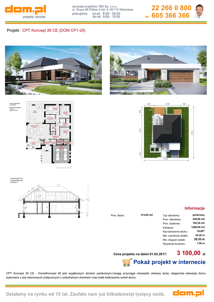 sprzedaż projektów: IMO Sp. z o.o., ul. Grupy AK Północ 4 lok. 9, 00-713 Warszawa pracujemy: pn-pt 8:00 - 20:00 sb-nd 9:00 - 15:00 22 266 0 800 tel. 605 366 366 Projekt CPT Koncept 26 CE (DOM CP1-29) Informacje Pow. dachu: 313,00 m2 Typ zabudowy: parterowy Pow. zabudowy: 248,80 m2 Pow. użytkowa: 165,36 m2 1286,00 m3 Kubatura: Kąt nachylenia dachu: 35,00 0 Min. szerokość działki: 24,30 m Min. długość działki: 29,55 m Wysokość budynku: 7,56 m Cena projektu na dzień 01.03.2017: 3 100,00 zł Pokaż projekt w internecie CPT Koncept 26 CE - HomeKoncept 26 jest wyjątkowym domem parterowym.Uwagę przyciąga niezwykle ciekawy taras, elegancka elewacja domu wykonana z płyt betonowych połączonych z szlachetnym drewnem oraz białe belkowania wokół domu. Działamy na rynku od 15 lat. Zaufało nam już kilkadziesiąt tysięcy osób.
