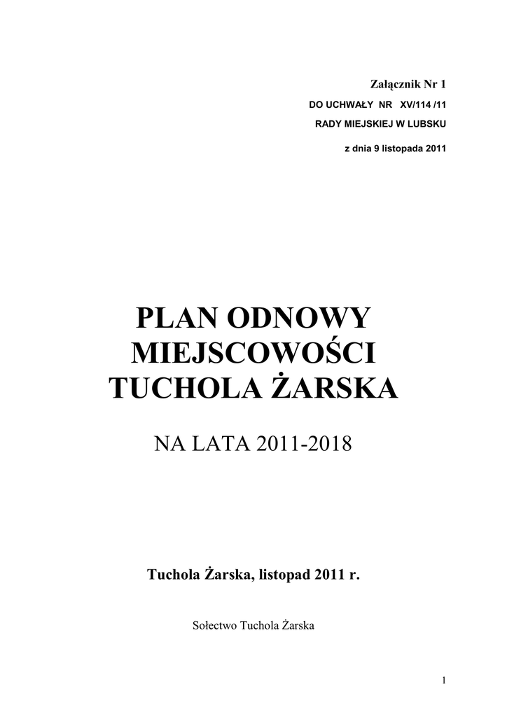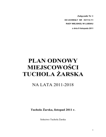 Załącznik Nr 1 DO UCHWAŁY NR XV/114 /11 RADY MIEJSKIEJ W LUBSKU z dnia 9 listopada 2011 PLAN ODNOWY MIEJSCOWOŚCI TUCHOLA ŻARSKA NA LATA 2011-2018 Tuchola Żarska, listopad 2011 r. Sołectwo Tuchola Żarska 1 SPIS TREŚCI I. Charakterystyka miejscowości Tuchola Żarska ………………3 1. 2. 3. 4. 5. 6. II. Położenie ………………………………………………………………….3 Powierzchnia ……………………………………………………………...3 Ludność …………………………………………………………………...3 Ilość gospodarstw …………………………………………………………4 Zakłady, zatrudnienie ……………………………………………………..4 Stowarzyszenia ............................................................................................4 Inwentaryzacja zasobów służących odnowie miejscowości Tuchola Żarska ……………………………...…………………..6 1. 2. 3. 4. 5. Środowisko przyrodnicze, położenie ………………………………….6 Środowisko kulturowe …………………………………………...........7 Obiekty i tereny ……………………………………………………….8 Gospodarka, rolnictwo ………………………………………………..8 Mieszkańcy, kapitał społeczny ………………………………………..8 III. Opis i charakterystyka obszarów o szczególnym znaczeniu dla zaspokojenia potrzeb mieszkańców, sprzyjających nawiązywaniu kontaktów społecznych, ze względu na ich położenie oraz cechy funkcjonalno-przestrzenne……………..10 IV. Analiza SWOT ………………………………………………….11 V. Opis planowanych przedsięwzięć w perspektywie 7 lat (20112018) ……………………………………………………….……12 2 I. CHARAKTERYSTYKA MIEJSCOWOŚCI TUCHOLA ŻARSKA 1. Położenie Tuchola Żarska położona jest we wschodniej części gminy Lubsko 12 km od Lubska w kierunku Nowogród Bobrz. - Zielona Góra; podzielona na Tucholę Małą i Dużą, pomiędzy miejscowościami: - Stara Woda (od zachodu) - Mokra (od północnego – zachodu) - Białków (od południowego – zachodu) - Zabłocie gm. Jasień (od południowego – wschodu) Współrzędne charakteryzujące położenie geograficzne Tucholi Żarskiej: 15004’42’’E, 51047’48’’N. 2. Powierzchnia Ogólna powierzchnia wsi Tuchola Żarska wynosi 1002ha 41a z podziałem na: - grunty orne – 408 ha - łąki trwałe – 158 ha - pastwiska trwałe – 14 ha - lasy i grunty leśne – 305 ha 98 a - pozostałe (nieużytki) – 6 ha 29 a - grunty zakrzewione i zadrzewione – 29 ha 57 a - wody stojące – 2 ha 40 a - rowy – 11 ha 05 a - drogi – 44 ha 91 a - tereny osiedlowe zabudowane – 22 ha 05 a - sady – 0 ha 16 a 3. Ludność Liczbę mieszkańców wg stanu na dzień 31.10.2011 r. szacuje się na 505 osób. Wyszczególnienie Osoby poniżej 18 roku życia Dorośli Razem: Wyszczególnienie do 6 lat od 7 do 15 lat od 16 do 18 lat Liczba mieszkańców 109 396 505 w tym: 251 kobiet 254 mężczyzn Liczba mieszkańców 48 w tym: 29 kobiet 19 mężczyzn 54 w tym: 26 kobiet 28 mężczyzn 16 w tym: 3 8 kobiet od 19 do 60 lat 8 mężczyzn 152 kobiet od 19 do 65 lat 182 mężczyzn powyżej 60 lat 36 kobiet powyżej 65 lat 17 mężczyzn Razem: 505 osób Źródło: Urząd Miejski w Lubsku 4. Ilość gospodarstw Na działalność rolniczą składa się 27 gospodarstw niskotowarowe i ogólno-rolnicze. 5. Zakłady, zatrudnienie Na terenie sołectwa działa 8 firm. Największą z nich jest RADAN Weu Sp. z o.o. specjalizująca się w hodowli bydła mlecznego. Według stanu na październik 2011 r. spółka zatrudnia 40 pracowników (Żródło: RADAN Weu Sp. z o.o.). Pozostałe przedsiębiorstwa to: 1) Stolarstwo i Remonty Budowlane Grzegorz Dziurzyński (Tuchola Żarska 30, 68-300 Lubsko), 2) Piotr Banaś (Tuchola Żarska 1I/6, 68-300 Lubsko) – działający w branży budowlanej, 3) Instalacje sanitarne c.o. i gaz Marek Dziczek (Tuchola Żarska 1 L/5, 68-300 Lubsko), 4) Dekarstwo, ciesielstwo Jan Łobodziec (Tuchola Żarska 55, 68-300 Lubsko), 5) Sklep Ogólnospożywczo-Przemysłowy Krzysztof Stodolski (Tuchola Żarska 67, 68-300 Lubsko), 6) GODLEWSKI Dariusz Godlewski (Tuchola Żarska 1J/6, 68-300 Lubsko) – działający w branży budowlanej, 7) Przedsiębiorstwo Handlowo-Usługowe „Jasiak” Robert Jasiak (Tuchola Żarska 26, 68-300 Lubsko) – działający w branży motoryzacyjnej. W sołectwie funkcjonuje również Spółdzielnia Mieszkaniowa oraz Leśnictwo Nadleśnictwa Krzystkowice. 6. Stowarzyszenia W Tucholi aktywnie działa „Stowarzyszenie Sympatyków wsi Tuchola Żarska”. Celami stowarzyszenia, zgodnie ze statutem są: Inicjowanie aktywności publicznej, Inicjowanie i wspieranie działalności kulturalnej, Promocja idei zdrowego społeczeństwa, Pomoc dla osób niepełnosprawnych Upowszechnianie kultury fizycznej i sportu, Prowadzenie działalności turystycznej i krajoznawczej, Organizacja współpracy zagranicznej, 4 Współpraca i współdziałanie z władzami samorządowymi województwa, powiatu, gminy i wsi w zakresie przygotowania i realizacji planów rozwoju infrastruktury i gospodarki wsi, Upowszechnianie znajomości problemów życia publicznego, Działalność na rzecz upowszechniania aktywnego wypoczynku mieszkańców, Wsparcie demokracji i budowania społeczeństwa obywatelskiego w lokalnej społeczności. 5 II. INWENTARYZACJA ZASOBÓW SOŁECTWA 1. Środowisko przyrodnicze, położenie • Walory krajobrazu Tuchola Żarska jest wsią położoną we wschodniej części województwa lubuskiego. Znajduje się na drodze głównej nr 289 w kierunku Nowogród Bobrz. Zielona Góra. Tuchola dzieli się na Małą i Dużą. Tuchola Mała położona jest przy szosie biegnącej z Lubska do Nowogrodu Bobrzańskiego, natomiast Tuchola Duża położona na południe od Tucholi Małe