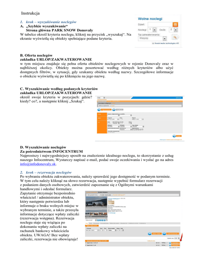 Instrukcja 1. krok – wyszukiwanie noclegów A. „Szybkie wyszukiwanie“ Strona główna PARK SNOW Donovaly W tabelce określ kryteria noclegu, kliknij na przycisk „wyszukaj“. Na ekranie wyświetlą się obiekty spełniające podane kryteria. B. Oferta noclegów zakładka URLOP/ZAKWATEROWANIE w tym miejscu znajduje się pełna oferta obiektów noclegowych w rejonie Donovaly oraz w najbliższej okolicy. Obiekty można posortować według różnych kryteriów albo użyć dostępnych filtrów, w sytuacji, gdy szukamy obiektu według nazwy. Szczegółowe informacje o obiekcie wyświetlą się po kliknięciu na jego nazwę. C. Wyszukiwanie według podanych kryteriów zakładka URLOP/ZAKWATEROWANIE określ swoje kryteria w pozycjach: gdzie? kiedy? co?, a następnie kliknij „Szukaj“. D. Wyszukiwanie noclegów Za pośrednictwem INFOCENTRUM Najprostszy i najwygodniejszy sposób na znalezienie idealnego noclegu, to skorzystanie z usług naszego Infocentrum, Wystarczy napisać e-mail, podać swoje oczekiwania i wysłać go na adres [email protected]. 2. krok – rezerwacja noclegów Po wybraniu obiektu zakwaterowania, należy sprawdzić jego dostępność w podanym terminie. W tym celu należy kliknąć na słowo rezerwacja, następnie wypełnić formularz rezerwacji z podaniem danych osobowych, zatwierdzić zapoznanie się z Ogólnymi warunkami handlowymi i odesłać formularz. Zapytanie otrzymuje bezpośrednio właściciel / administrator obiektu, który następnie potwierdza lub informuje o braku wolnych miejsc w wybranym terminie, a także przesyła informacje dotyczące wpłaty zaliczki (rezerwacja wstępna). Rezerwacja noclegu staje się wiążąca po dokonaniu wpłaty zaliczki na rachunek bankowy właściciela obiektu. UWAGA! Bez wpłaty zaliczki, rezerwacja nie obowiązuje!
