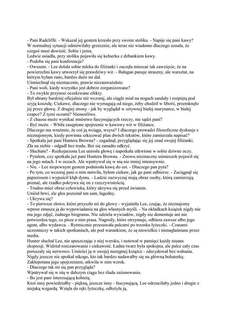 - Pani Radcliffe. - Wskazał jej gestem krzesło przy swoim stoliku. - Napije się pani kawy? W normalnej sytuacji odmówiłaby grzecznie, ale teraz nie wiadomo dlaczego uznała, że czegoś musi dowieść. Sobie i jemu. Ledwie usiadła, przy stoliku pojawiła się kelnerka z dzbankiem kawy. - Podoba się pani konferencja? - Owszem. - Lee dolała sobie mleka do filiżanki i zaczęła mieszać tak zawzięcie, że na powierzchni kawy utworzył się prawdziwy wir. - Bałagan panuje straszny, ale warsztat, na którym byłam rano, bardzo dużo mi dał. Uśmiechnął się nieznacznie, prawie niezauważalnie. - Pani woli, kiedy wszystko jest dobrze zorganizowane? - To zwykle przynosi oczekiwane efekty. Był ubrany bardziej oficjalnie niż wczoraj, ale ciągle miał na nogach sandały i rozpiętą pod szyją koszulę. Ciekawe, dlaczego nie wymagają od niego, żeby chodził w liberii, przemknęło jej przez głowę. Z drugiej strony - jak by wyglądał w sztywnej białej marynarce, w białej czapce? Z tymi oczami? Niemożliwe. - Z chaosu może wynikać mnóstwo fascynujących rzeczy, nie sądzi pani? - Być może. - Wbiła zasępione spojrzenie w kawowy wir w filiżance. Dlaczego ma wrażenie, że coś ją wciąga, wsysa? I dlaczego prowadzi filozoficzne dyskusje z nieznajomym, kiedy powinna szkicować plan dwóch tekstów, które zamierzała napisać? - Spotkała już pani Huntera Browna? - zagadnął, przyglądając się jej znad swojej filiżanki. Zła na siebie - odgadł bez trudu. Boi się zanadto odkryć. - Słucham? - Rozkojarzona Lee uniosła głowę i napotkała utkwione w sobie dziwne oczy. - Pytałem, czy spotkała już pani Huntera Browna. - Znowu nieznaczny uśmieszek pojawił się na jego ustach. I w oczach. Ale wpatrywał się w nią nie mniej intensywnie. - Nie. - Lee niepewnym gestem podniosła kawę do ust. - Dlaczego pan pyta? - Po tym, co wczoraj pani o nim mówiła, byłem ciekaw, jak go pani odbierze. - Zaciągnął się papierosem i wypuścił kłąb dymu. - Ludzie zazwyczaj mają obraz osoby, którą zamierzają poznać, ale rzadko pokrywa się on z rzeczywistością. - Trudno mieć obraz człowieka, który ukrywa się przed światem. Uniósł brwi, ale głos pozostał ten sam, łagodny. - Ukrywa się? - To pierwsze słowo, które przyszło mi do głowy - wyjaśniła Lee, czując, że nieznajomy wprost zmusza ją do wypowiadania na głos własnych myśli. - Na okładkach książek nigdy nie ma jego zdjęć, żadnego biogramu. Nie udziela wywiadów, nigdy nie dementuje ani nie potwierdza tego, co pisze o nim prasa. Nagrody, które otrzymuje, odbiera zawsze albo jego agent, albo wydawca. - Rytmicznie przesuwała palcami po trzonku łyżeczki. - Czasami uczestniczy w takich spotkaniach, ale pod warunkiem, że są niewielkie i nienagłaśniane przez media. Hunter słuchał Lee, nie spuszczając z niej wzroku, i notował w pamięci każdy niuans ekspresji. Widział rozczarowanie i ciekawość. Ładna twarz była spokojna, ale palce cały czas poruszały się nerwowo. Umieści ją w swojej następnej książce - zdecydował bez wahania. Nigdy jeszcze nie spotkał nikogo, kto tak bardzo nadawałby się na główną bohaterkę. Zakłopotana jego spojrzeniem, utkwiła w nim wzrok. - Dlaczego tak mi się pan przygląda? Wpatrywał się w nią w dalszym ciągu bez śladu zażenowania. - Bo jest pani interesującą kobietą. Ktoś inny powiedziałby - piękną, jeszcze inny - fascynującą. Lee odrzuciłaby jedno i drugie z niejaką wzgardą. Wzięła do ręki łyżeczkę, odłożyła ją. - Dlaczego? - Ma pani chłodny umysł, wrodzone poczucie stylu i jest pani kłębkiem nerwów. Podobał mu się lekki mars na jej czole. Oznaczał upór i wytrwałość. Miał szacunek dla obu cech. - Zawsze intrygowały mnie kieszenie - ciągnął. - Im głębsze, tym lepiej. Jestem ciekaw, co pani ma w kieszeniach, pani Radcliffe. Znowu poczuła ciarki na plecach. Niezbyt miło jest siedzieć obok kogoś, kto przyprawia człowieka o podobne sensacje. Nagle ogarnęła ją fala sympatii dla ludzi, z którymi kiedykolwiek zdarzyło się jej przeprowadzać wywiady. - Ma pan oryginalny sposób prowadzenia rozmowy - mruknęła. - Tak mówią.