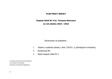 PLAN PRACY SZKOŁY Zespołu Szkół Nr 4 im. Tomasza Klenczara na rok szkolny 2015 / 2016 Opracowano na podstawie : Po uzyskaniu pozytywnej opinii Rady Rodziców, oraz Samorządu Uczniowskiego zatwierdzony Uchwałą Rady Pedagogicznej str. 1 1. Ustawa o systemie oświaty z dnia 7.09.91r. (z późniejszymi zmianami), 2. Konstytucja RP, 3. Statut Zespołu Szkół Nr 4 Zadania L.p. szczegółowe 1 2 I Organizacja i dokumentacja pracy oraz przygotowanie nowego roku szkolnego 1. 2. 3. 4. 5. 6. 7. 8. 9. 10. 11. 12. 13. 14. 15. 16. 17. 18. 19. Sposób / formy / realizacji Odpowiedzialny Termin realizacji Uwagi 3 4 5 6 konferencja Rady Pedagogicznej zatwierdzająca plan pracy ZS Nr 4 na rok szkolny 2015 /2016 oraz przydział zadań dydaktyczno – wychowawczych nauczycielom przydział obowiązków służbowych, uroczysta inauguracja nowego roku szkolnego 2015 /2016, spotkania z rodzicami, wybór rad klasowych, sporządzenie stałego tygodniowego rozkładu zajęć dydaktyczno - wychowawczych, przygotowanie harmonogramu / planu / dyżurów nauczycieli, przygotowanie harmonogramu i organizacja praktyk zawodowych, opracowanie rocznego planu pracy Szkoły oraz kalendarza roku szkolnego, przygotowanie rocznego kalendarza uroczystości szkolnych, opracowanie terminarza zebrań rady pedagogicznej oraz spotkań z rodzicami, wybory Samorządu Szkolnego, modyfikacja programów nauczania oraz planów pracy z poszczególnych przedmiotów w oparciu o podstawę programową, badania diagnozujące, wnioski i spostrzeżenia wynikające z egzaminów zewnętrznych zebrania komisji przedmiotowych i ustalenie ich planów pracy, organizacja pracy komisji /zespołów przedmiotowych i zadaniowych, powołanie i organizacja pracy zespołu ds. ewaluacji, korelacja między przedmiotami, kształtowanie umiejętności samodzielnego zdobywania wiedzy w zależności od możliwości ucznia, omówienie z wychowawcą klasy maturalnej regulaminów egzaminów: maturalnego i potwierdzającego kwalifikacje w zawodzie – zapoznanie uczniów i rodziców z w/w regulaminami - z kluczowymi dokumentami Szkoły oraz wymaganiami edukacyjnymi na poszczególne oceny, przygotowanie sprawozdań z realizacji zadań zawartych w planach pracy zespołów / komisji przedmiotowych, kontrolowanie realizacji obowiązku nauki, opracowanie planu nadzoru pedagogicznego. 1. 2. 3. 4. 5. 6. 7. 8. 9. 10. 11. 12. 13. 14. 15. 16. 17. 18. 19. II Org. i przeprowadzenie egzaminów dla uczniów str. 2 - egzaminy potwierdzające kwalifikacje zawodowe dla klas III oraz IV (sk) egzamin maturalny klasy IV sk egzaminy klasyfikacyjne, poprawkowe RP / dyr. dyr. D. Szmyt, B. Słowińska, N. Ziółkowska wychowawcy klas, B. Słowińska, N. Ziółkowska, D. Pantak N. Ziółkowska dyr. D. Szmyt dyr. D. Szmyt B. Słowińska B. Bąk B. Słowińska przewodniczący komisji przedmiotowych przewodniczący komisji przedmiotowych przewodniczący komisji przedmiotowych wszyscy nauczyciele dyr. D. Szmyt przewodniczący komisji przedmiotowych wychowawcy klas, szkolny pedagog dyr. D. Szmyt dyr. D. Szmyt, B. Bąk dyr. D. Szmyt, B. Bąk nauczyciele 1. 2. 3. 4. 5. 28 oraz 31 sierpień ‘15 28 sierpień ‘15 1 wrzesień ‘15 op. RR B. Słowińska op. sam szk.N. Ziółkowska wrzesień ’15 do 1 września ‘15 6. do 10 września ‘15 7. do 1 września ‘15 8. 31 sierpień ‘15 9. wrzesień ‘15 10. wrzesień ‘15 11. wrzesień ‘15 12. październik ‘15 13. do 15 września ‘15 14. na bieżąco 15. na bieżąco 16. wrzesień ‘15 17. styczeń oraz czerwiec ‘16 18. na bieżąco 19. do 15 września ‘15 terminarz CKE zgodnie z komunikatem CKE III Rada Pedagogiczna 1. 2. 3. 4. 5. 6. 7. 8. 9. 10. 11. 12. 13. 14. 15. IV Doskonalenie procesu dydaktycznego; realizacja nowej podstawy programowej / programów nauczania 1. 2. 3. 4. 5. 6. 7. V Formy i metody kształcenia 1. 2. str. 3 organizacja konferencji Rady Pedagogicznej – wg. harmonogramu organizacja doskonalenia zawodowego nauczycieli - opracowanie planu doskonalenia zawodowego nauczycieli po uprzedniej analizie potrzeb pracowników i możliwości finansowych Szkóły oraz po zapoznaniu się z dostępną ofertą edukacyjną na rynku, współpraca nauczycieli z doradcami metodycznymi, udział nauczycieli w sympozjach, wykładach naukowych, konferencjach podnoszenie i uzupełnianie kwalifikacji zawodowych, tworzenie warunków do uzyskiwania kolejnych stopni awansu zawodowego: - przydzielenie opiekunów stażu; - nadzór nad realizacją planu zawodowego; - uzupełnienie dokumentacji związanej z awansem, opieka nad nauczycielami o krótkim stażu pracy i niewielkim doświadczeniu pedagogicznym, wizytowanie, obserwowanie (hospitowanie) zajęć połączone z rozmową o problemach dydaktyczno - wychowawczych oraz udzielanie wskazówek metodycznych, inspirowanie i wspieranie nowatorstwa pedagogicznego, zaopatrzenie biblioteki w aktualne wydawnictwa metodyczne i specjalistyczne, systematyczna ocena pracy kadry pedagogicznej, egzekwowanie osobistej odpowiedzialności nauczycieli za wyniki ich pracy dydaktyczno-wychowawczej, analiza wyników nauczania i wychowania połączona z wyciąganiem wniosków służących doskonaleniu zawodowemu nauczycieli, ewaluacja programu rozwoju Szkoły, aktualizacja Statutu ZS Nr 4, podjęcie współpracy z rodzicami i wzmocnienie ich roli w planowaniu zadań strategicznych Szkoły, 1. 2. 3. 4. 5. 6. 7. dyr. D. Szmyt dyrektor, B. Bąk nauczyciele, nauczyciele, nauczyciele, dyr. D. Szmyt przew. komisji przedmiotowych, 8. opiekunowie stażu, dyr. D. Szmyt, 9. dyr. D. Szmyt, 10. bibliotekarka, aktualizacja treści kształcenia pod kątem bieżących wymagań, postępu naukowo technicznego, itp. (plany wynikowe i kierunkowe), prezentacja młodzieży i ich rodzicom wymagań edukacyjnych, przygotowanie i uzupełnienie planów wynikowych / rozkładów materiału nauczania / scenariusze lekcji obserwowanych / hospitowanych, korelacja międzyprzedmiotowa, okresowa analiza stopnia realizacji programu nauczania połąc