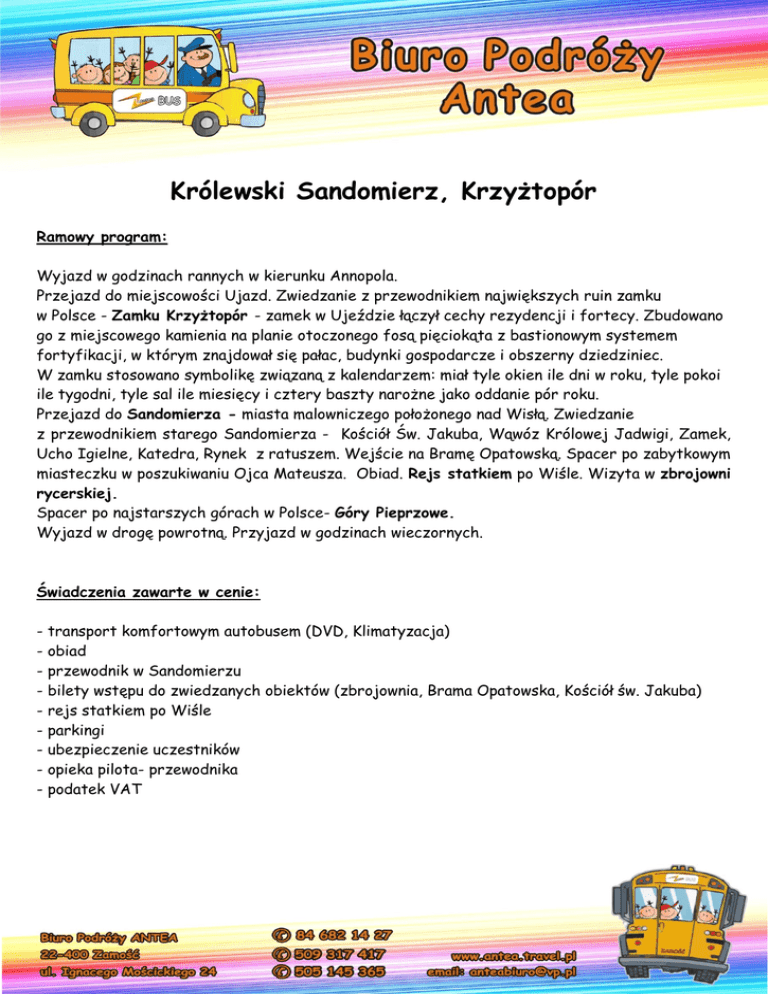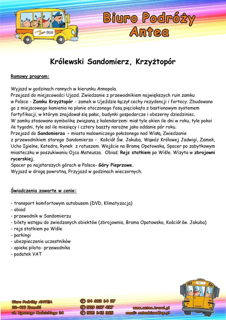 Królewski Sandomierz, Krzyżtopór Ramowy program: Wyjazd w godzinach rannych w kierunku Annopola. Przejazd do miejscowości Ujazd. Zwiedzanie z przewodnikiem największych ruin zamku w Polsce - Zamku Krzyżtopór - zamek w Ujeździe łączył cechy rezydencji i fortecy. Zbudowano go z miejscowego kamienia na planie otoczonego fosą pięciokąta z bastionowym systemem fortyfikacji, w którym znajdował się pałac, budynki gospodarcze i obszerny dziedziniec. W zamku stosowano symbolikę związaną z kalendarzem: miał tyle okien ile dni w roku, tyle pokoi ile tygodni, tyle sal ile miesięcy i cztery baszty narożne jako oddanie pór roku. Przejazd do Sandomierza - miasta malowniczego położonego nad Wisłą. Zwiedzanie z przewodnikiem starego Sandomierza - Kościół Św. Jakuba, Wąwóz Królowej Jadwigi, Zamek, Ucho Igielne, Katedra, Rynek z ratuszem. Wejście na Bramę Opatowską. Spacer po zabytkowym miasteczku w poszukiwaniu Ojca Mateusza. Obiad. Rejs statkiem po Wiśle. Wizyta w zbrojowni rycerskiej. Spacer po najstarszych górach w Polsce- Góry Pieprzowe. Wyjazd w drogę powrotną. Przyjazd w godzinach wieczornych. Świadczenia zawarte w cenie: - transport komfortowym autobusem (DVD, Klimatyzacja) obiad przewodnik w Sandomierzu bilety wstępu do zwiedzanych obiektów (zbrojownia, Brama Opatowska, Kościół św. Jakuba) rejs statkiem po Wiśle parkingi ubezpieczenie uczestników opieka pilota- przewodnika podatek VAT