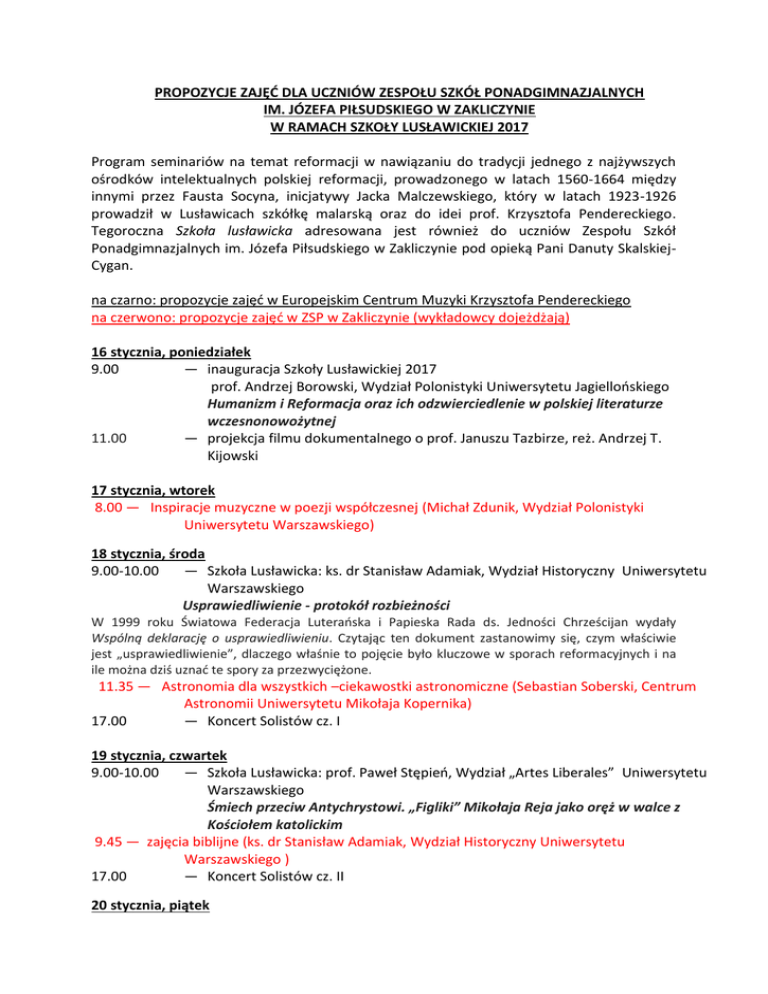 PROPOZYCJE ZAJĘĆ DLA UCZNIÓW ZESPOŁU SZKÓŁ PONADGIMNAZJALNYCH IM. JÓZEFA PIŁSUDSKIEGO W ZAKLICZYNIE W RAMACH SZKOŁY LUSŁAWICKIEJ 2017 Program seminariów na temat reformacji w nawiązaniu do tradycji jednego z najżywszych ośrodków intelektualnych polskiej reformacji, prowadzonego w latach 1560-1664 między innymi przez Fausta Socyna, inicjatywy Jacka Malczewskiego, który w latach 1923-1926 prowadził w Lusławicach szkółkę malarską oraz do idei prof. Krzysztofa Pendereckiego. Tegoroczna Szkoła lusławicka adresowana jest również do uczniów Zespołu Szkół Ponadgimnazjalnych im. Józefa Piłsudskiego w Zakliczynie pod opieką Pani Danuty SkalskiejCygan. na czarno: propozycje zajęć w Europejskim Centrum Muzyki Krzysztofa Pendereckiego na czerwono: propozycje zajęć w ZSP w Zakliczynie (wykładowcy dojeżdżają) 16 stycznia, poniedziałek 9.00 — inauguracja Szkoły Lusławickiej 2017 prof. Andrzej Borowski, Wydział Polonistyki Uniwersytetu Jagiellońskiego Humanizm i Reformacja oraz ich odzwierciedlenie w polskiej literaturze wczesnonowożytnej 11.00 — projekcja filmu dokumentalnego o prof. Januszu Tazbirze, reż. Andrzej T. Kijowski 17 stycznia, wtorek 8.00 — Inspiracje muzyczne w poezji współczesnej (Michał Zdunik, Wydział Polonistyki Uniwersytetu Warszawskiego) 18 stycznia, środa 9.00-10.00 — Szkoła Lusławicka: ks. dr Stanisław Adamiak, Wydział Historyczny Uniwersytetu Warszawskiego Usprawiedliwienie - protokół rozbieżności W 1999 roku Światowa Federacja Luterańska i Papieska Rada ds. Jedności Chrześcijan wydały Wspólną deklarację o usprawiedliwieniu. Czytając ten dokument zastanowimy się, czym właściwie jest „usprawiedliwienie”, dlaczego właśnie to pojęcie było kluczowe w sporach reformacyjnych i na ile można dziś uznać te spory za przezwyciężone. 11.35 — Astronomia dla wszystkich –ciekawostki astronomiczne (Sebastian Soberski, Centrum Astronomii Uniwersytetu Mikołaja Kopernika) 17.00 — Koncert Solistów cz. I 19 stycznia, czwartek 9.00-10.00 — Szkoła Lusławicka: prof. Paweł Stępień, Wydział „Artes Liberales” Uniwersytetu Warszawskiego Śmiech przeciw Antychrystowi. „Figliki” Mikołaja Reja jako oręż w walce z Kościołem katolickim 9.45 — zajęcia biblijne (ks. dr Stanisław Adamiak, Wydział Historyczny Uniwersytetu Warszawskiego ) 17.00 — Koncert Solistów cz. II 20 stycznia, piątek 11.35 – 13.20 „Figliki” Mikołaja Reja (prof. Paweł Stępień, Wydział „Artes Liberales” Uniwersytetu Warszawskiego 19.00 — Koncert Absolwentów Programu Pomocy Młodzieży Wybitnie Uzdolnionej (Magdalena Bojanowicz, Marcin Koziak, Aleksandra Kuls, Marta Wryk) w przerwie wernisaż prac podopiecznych Funduszu – uczestników Warsztatów (Alicja Lasota, Petro Martyniuk, Maria Napieralska, Alicja Sobiepańska, Paweł Wołczański) 21 stycznia, sobota 19.30 — Koncert Muzyki Ludowej w wykonaniu Kapieli z Innej Struny w składzie: Daria Butskaya (skrzypce), Kamila Owsianików (flet), Anna Walkowiak (basy), Krystian Pisowicz (bębenek, skrzypce) ze specjalnym udziałem Marii Siwiec i Jana Kmity Chętni uczniowie, szczególnie klasy pierwsze w ramach wiedzy o kulturze. Zgłoszenia do pani Danuty Skalskiej - Cygan 22 stycznia, niedziela 19.30 — Obiekt w sztuce XX wieku, spotkanie z prof. Marianem Stępakiem Chętni uczniowie, szczególnie klasy pierwsze w ramach wiedzy o kulturze oraz maturalne. Zgłoszenia do pani Danuty Skalskiej - Cygan 23 stycznia, poniedziałek 9.00 — Szkoła Lusławicka: Zwiedzanie Klasztoru OO. Franciszkanów w Zakliczynie 11.35 – 13.20 — „Wesele” S. Wyspiańskiego inaczej. Tego nie można mówić na maturze. (dr Michał Mizera, Wydział „Artes Liberales” Uniwersytetu Warszawskiego) 24 stycznia, wtorek 8.00 — zajęcia z kultury antycznej (dr Barbara Bibik) 25 stycznia, środa 9.45 — zajęcia filozoficzne Dlaczego warto czytać Platona? (Maria Mach, Krajowy Fundusz na rzecz Dzieci) 19.30 — Koncert wiolonczelowy w wykonaniu Wojciecha Fudali i Michała Roty (sala kameralna) 26 stycznia, czwartek 9.00-11.00 — Szkoła Lusławicka: ks. dr Roman Pracki, Parafia Ewangelicko-Augsburska w Krakowie Współcześni luteranie w Polsce 8.00 lub 12.35 — zajęcia kulturoznawcze Niepodlegli kreatorzy sztuki – Elżbieta i Krzysztof Pendereccy (prof. Stanisław Cz. Kurdziel)( np. Kl I TG, I TTM, I LO) 27 stycznia, piątek 9.00-11.00 — Szkoła Lusławicka: prof. Marta Gibińska (Uniwersytet Jagielloński) Szekspir: katolik czy protestant? 11.35 – 13.20 — Jak patrzeć na dzieła sztuki współczesnej (dr Daria Rzepiela) 19.00 — Koncert Muzyki Kameralnej w wykonaniu Uczestników Warsztatów