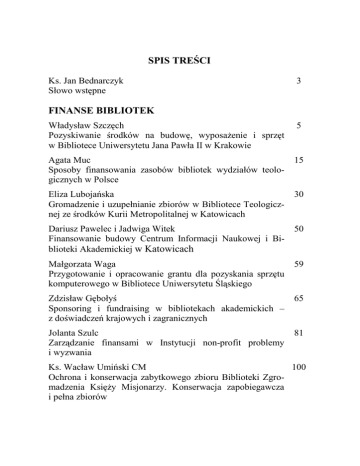 SPIS TREŚCI Ks. Jan Bednarczyk Słowo wstępne 3 FINANSE BIBLIOTEK Władysław Szczęch Pozyskiwanie środków na budowę, wyposażenie i sprzęt w Bibliotece Uniwersytetu Jana Pawła II w Krakowie 5 Agata Muc Sposoby finansowania zasobów bibliotek wydziałów teologicznych w Polsce 15 Eliza Lubojańska Gromadzenie i uzupełnianie zbiorów w Bibliotece Teologicznej ze środków Kurii Metropolitalnej w Katowicach 30 Dariusz Pawelec i Jadwiga Witek Finansowanie budowy Centrum Informacji Naukowej i Biblioteki Akademickiej w Katowicach 50 Małgorzata Waga Przygotowanie i opracowanie grantu dla pozyskania sprzętu komputerowego w Bibliotece Uniwersytetu Śląskiego 59 Zdzisław Gębołyś Sponsoring i fundraising w bibliotekach akademickich – z doświadczeń krajowych i zagranicznych 65 Jolanta Szulc Zarządzanie finansami w Instytucji non-profit problemy i wyzwania 81 Ks. Wacław Umiński CM 100 Ochrona i konserwacja zabytkowego zbioru Biblioteki Zgromadzenia Księży Misjonarzy. Konserwacja zapobiegawcza i pełna zbiorów NOWOCZESNE TECHNOLOGIE W BIBLIOTECE Elżbieta Słoń 106 Garść uwag dotyczących opisu katalogowego - cz. 3 Pole przeznaczone dla języka dokumentu Ewa Olszowy Czasopisma z zakresu nauk teologicznych w bazie Directory of Open Access Journals (DOAJ) 108 Andrzej Jurek 140 Współpraca bibliotek kościelnych w przekazywaniu dubletów i druków zbędnych. Wykorzystanie nowoczesnych form zarządzania zbiorami Bogumiła Warząchowska Promocja zbiorów Biblioteki Teologicznej w Katowicach 150 HISTORIA I TEORIA BADAŃ BIBLIOTEK Tomasz Stolarczyk 169 Biblioteka łowickiego konwentu dominikańskiego w początkach XVII wieku i jej księgozbiór 184 O. Antoni Karaś CSsR Dzieje Biblioteki Prowincjalnej Redemptorystów w Tuchowie i ogólna charakterystyka księgozbioru Z ŻYCIA BIBLIOTEK Agata Jaśko – Danuta Gradowska 210 Ks. Jan Bednarczyk Kazanie wygłoszone na pogrzebie ś.p. Danuty Gradowskiej Cmentarz Rakowicki Kraków, 13 XII 2010 r. 212 INFORMACJE, SPRAWOZDANIA, RECENZJE Ks. Tomasz Garwoliński 215 „Co kryją w sobie stare druki ?” Wystawa ciekawostek wydobytych ze starodruków 224 Ewa Olszowy Sprawozdanie z Forum Sekcji Bibliotek Szkół Wyższych Stowarzyszenia Bibliotekarzy Polskich „Prawo autorskie w bibliotekach” (Katowice, 24 luty 2010 r.) 228 Urszula Grabińska Sprawozdanie z konferencji „Między teorią a praktyką. 7 Ochrona zbiorów w małych bibliotekach i archiwach” (Cieszyn, 3-5 marca 2010 r.) Agnieszka Bajor 234 Księgozbiory polskiego duchowieństwa katolickiego na Górnym Śląsku w XIX i XX wieku (do 1939 r.) / Weronika Pawłowicz. – Katowice : Księgarnia św. Jacka, 2009. – 429, [3] s. – (Studia i Materiały Wydziału Teologicznego Uniwersytetu Śląskiego w Katowicach, ISSN 1643-0131 ; 52). – ISBN 97883-7030-669-4 Bogumiła Warząchowska Święty Wawrzyniec patron bibliotekarzy / Teresa Kunikowska. – Słupsk: Stowarzyszenie Bibliotekarzy Polskich. Zarząd Oddziału w Słupsku, 2008. – 24 s. – ISBN 978-83-88783-111 241 WIADOMOŚCI O FIDES Relacja z XVI Walnego Zgromadzenia Federacji Bibliotek Kościelnych FIDES (Koszalin, 20-23 IX 2010 r.) 245