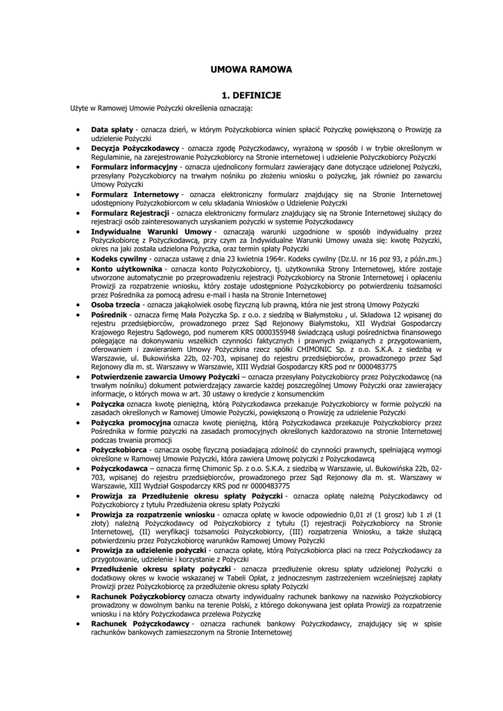 UMOWA RAMOWA 1. DEFINICJE Użyte w Ramowej Umowie Pożyczki określenia oznaczają: Data spłaty - oznacza dzień, w którym Pożyczkobiorca winien spłacić Pożyczkę powiększoną o Prowizję za udzielenie Pożyczki Decyzja Pożyczkodawcy - oznacza zgodę Pożyczkodawcy, wyrażoną w sposób i w trybie określonym w Regulaminie, na zarejestrowanie Pożyczkobiorcy na Stronie internetowej i udzielenie Pożyczkobiorcy Pożyczki Formularz informacyjny - oznacza ujednolicony formularz zawierający dane dotyczące udzielonej Pożyczki, przesyłany Pożyczkobiorcy na trwałym nośniku po złożeniu wniosku o pożyczkę, jak również po zawarciu Umowy Pożyczki Formularz Internetowy - oznacza elektroniczny formularz znajdujący się na Stronie Internetowej udostępniony Pożyczkobiorcom w celu składania Wniosków o Udzielenie Pożyczki Formularz Rejestracji - oznacza elektroniczny formularz znajdujący się na Stronie Internetowej służący do rejestracji osób zainteresowanych uzyskaniem pożyczki w systemie Pożyczkodawcy Indywidualne Warunki Umowy - oznaczają warunki uzgodnione w sposób indywidualny przez Pożyczkobiorcę z Pożyczkodawcą, przy czym za Indywidualne Warunki Umowy uważa się: kwotę Pożyczki, okres na jaki została udzielona Pożyczka, oraz termin spłaty Pożyczki Kodeks cywilny - oznacza ustawę z dnia 23 kwietnia 1964r. Kodeks cywilny (Dz.U. nr 16 poz 93, z późn.zm.) Konto użytkownika - oznacza konto Pożyczkobiorcy, tj. użytkownika Strony Internetowej, które zostaje utworzone automatycznie po przeprowadzeniu rejestracji Pożyczkobiorcy na Stronie Internetowej i opłaceniu Prowizji za rozpatrzenie wniosku, który zostaje udostępnione Pożyczkobiorcy po potwierdzeniu tożsamości przez Pośrednika za pomocą adresu e-mail i hasła na Stronie Internetowej Osoba trzecia - oznacza jakąkolwiek osobę fizyczną lub prawną, która nie jest stroną Umowy Pożyczki Pośrednik - oznacza firmę Mała Pożyczka Sp. z o.o. z siedzibą w Białymstoku , ul. Składowa 12 wpisanej do rejestru przedsiębiorców, prowadzonego przez Sąd Rejonowy Białymstoku, XII Wydział Gospodarczy Krajowego Rejestru Sądowego, pod numerem KRS 0000355948 świadczącą usługi pośrednictwa finansowego polegające na dokonywaniu wszelkich czynności faktycznych i prawnych związanych z przygotowaniem, oferowaniem i zawieraniem Umowy Pożyczkina rzecz spółki CHIMONIC Sp. z o.o. S.K.A. z siedzibą w Warszawie, ul. Bukowińska 22b, 02-703, wpisanej do rejestru przedsiębiorców, prowadzonego przez Sąd Rejonowy dla m. st. Warszawy w Warszawie, XIII Wydział Gospodarczy KRS pod nr 0000483775 Potwierdzenie zawarcia Umowy Pożyczki – oznacza przesyłany Pożyczkobiorcy przez Pożyczkodawcę (na trwałym nośniku) dokument potwierdzający zawarcie każdej poszczególnej Umowy Pożyczki oraz zawierający informacje, o których mowa w art. 30 ustawy o kredycie z konsumenckim Pożyczka oznacza kwotę pieniężną, którą Pożyczkodawca przekazuje Pożyczkobiorcy w formie pożyczki na zasadach określonych w Ramowej Umowie Pożyczki, powiększoną o Prowizję za udzielenie Pożyczki Pożyczka promocyjna oznacza kwotę pieniężną, którą Pożyczkodawca przekazuje Pożyczkobiorcy przez Pośrednika w formie pożyczki na zasadach promocyjnych określonych każdorazowo na stronie Internetowej podczas trwania promocji Pożyczkobiorca - oznacza osobę fizyczną posiadającą zdolność do czynności prawnych, spełniającą wymogi określone w Ramowej Umowie Pożyczki, która zawiera Umowę pożyczki z Pożyczkodawcą Pożyczkodawca – oznacza firmę Chimonic Sp. z o.o. S.K.A. z siedzibą w Warszawie, ul. Bukowińska 22b, 02703, wpisanej do rejestru przedsiębiorców, prowadzonego przez Sąd Rejonowy dla m. st. Warszawy w Warszawie, XIII Wydział Gospodarczy KRS pod nr 0000483775 Prowizja za Przedłużenie okresu spłaty Pożyczki - oznacza opłatę należną Pożyczkodawcy od Pożyczkobiorcy z tytułu Przedłużenia okresu spłaty Pożyczki Prowizja za rozpatrzenie wniosku - oznacza opłatę w kwocie odpowiednio 0,01 zł (1 grosz) lub 1 zł (1 złoty) należną Pożyczkodawcy od Pożyczkobiorcy z tytułu (I) rejestracji Pożyczkobiorcy na Stronie Internetowej, (II) weryfikacji tożsamości Pożyczkobiorcy, (III) rozpatrzenia Wniosku, a także służącą potwierdzeniu przez Pożyczkobiorcę warunków Ramowej Umowy Pożyczki Prowizja za udzielenie pożyczki - oznacza opłatę, którą Pożyczkobiorca płaci na rzecz Pożyczkodawcy za przygotowanie, udzielenie i korzystanie z Pożyczki Przedłużenie okresu spłaty pożyczki - oznacza przedłużenie okresu spłaty udzielonej Pożyczki o dodatkowy okres w kwocie wskazanej w Tabeli Opłat, z jednoczesnym zastrzeżeniem wcześniejszej zapłaty Prowizji przez Pożyczkobiorcę za przedłużenie okresu spłaty Pożyczki Rachunek Pożyczkobiorcy oznacza otwarty indywidualny rachunek bankowy na nazwisko Pożyczkobiorcy prowadzony w dowolnym banku na terenie Polski, z którego dokonywana jest opłata Prowizji za rozpatrzenie wniosku i na który Pożyczkodawca przelewa Pożyczkę Rachunek Pożyczkodawcy - oznacza rachunek bankowy Pożyczkodawcy, znajdujący się w spisie rachunków bankowych zamieszczonym na Stronie Internetowej Rzeczywista Roczna Stopa Oprocentowania lub RRSO - oznacza rzeczywistą roczną stopę oprocentowania wyliczoną zgodnie z ustawą o kredycie konsumenckim Strona/-y - oznacza Pożyczkodawcę i/lub Pożyczkobiorcę Strona Internetowa - oznacza stronę internetową znajdującą się pod adresem www.smartpozyczka.pl, na której Pożyczkobiorca rejestruje się elektronicznie, składa Wniosek i zawiera Umowę Pożyczki z Pożyczkodawcą Tabela Opłat - oznacza określenie całkowitych kwot Pożyczek, a także stawek opłat, prowizji i oprocentowania jakie stosuje Pożyczkodawca przy zawieraniu Umów Pożyczki, jak również należności związanych z nieterminową spłatą Pożyczki, stanowiąca integralną część Ramowej Umowy Pożyczki 