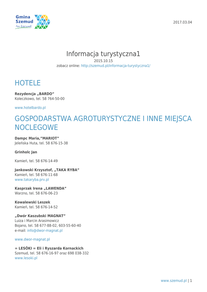 2017.03.04 Informacja turystyczna1 2015.10.15 zobacz online: http://szemud.pl/informacja-turystyczna1/ HOTELE Rezydencja „BARDO” Koleczkowo, tel. 58 764-50-00 www.hotelbardo.pl GOSPODARSTWA AGROTURYSTYCZNE I INNE MIEJSCA NOCLEGOWE Dampc Maria,”MARIOT” Jeleńska Huta, tel. 58 676-15-38 Grinholc Jan Kamień, tel. 58 676-14-49 Jankowski Krzysztof, „TAKA RYBA” Kamień, tel. 58 676-11-68 www.takaryba.prv.pl Kasprzak Irena „LAWENDA” Warzno, tel. 58 676-06-23 Kowalewski Leszek Kamień, tel. 58 676-14-52 „Dwór Kaszubski MAGNAT” Luiza i Marcin Arasimowicz Bojano, tel. 58 677-88-02, 603-55-60-40 e-mail: [email protected] www.dwor-magnat.pl = LESÔKI = Eli i Ryszarda Kornackich Szemud, tel. 58 676-16-97 oraz 698 038-332 www.lesoki.pl www.szemud.pl | 1 2017.03.04 „Stajnia Delano” Agata Lenartowicz Donimierz, tel. 888-875-527 Lewna Maria Kieleńska Huta, tel. 58 676-07-49 Piastowska Irena Szemud, tel. 58 676-12-20 www.nocleg-szemud.dzs.pl Podchorodecki Henryk „HENRYK” Szemud, tel. 58 676-12-29 Walkusz Janina Jeleńska Huta, tel.58 676-15-00 „TERESKA” Andrzej Sychowski Szemud, tel. 58 676-11-58 „AGRO-MAR” Edmund Wentk Warzno, tel. 58 676-06-05 „Dom Wakacyjny” Aleksandra Figas-Dziecielska Kamień, tel. 58 676-42-81, fax 58 620-01-11 „Jeleńska Chata” Gerhard Skelnik Jeleńska Huta, tel. 58 676-14-12 www.szemud.pl | 2