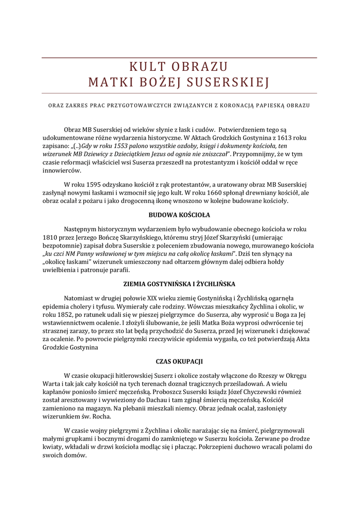 KULT OBRAZU MATKI BOŻEJ SUSERSKI EJ O R A Z ZA KR E S PR A C PR Z Y GOT O WA W CZY CH ZW IĄ ZA N Y CH Z K O R ON A CJĄ P AP IE S KĄ O BRA ZU Obraz MB Suserskiej od wieków słynie z łask i cudów. Potwierdzeniem tego są udokumentowane różne wydarzenia historyczne. W Aktach Grodzkich Gostynina z 1613 roku zapisano: „(..)Gdy w roku 1553 palono wszystkie ozdoby, księgi i dokumenty kościoła, ten wizerunek MB Dziewicy z Dzieciątkiem Jezus od ognia nie zniszczał”. Przypomnijmy, że w tym czasie reformacji właściciel wsi Suserza przeszedł na protestantyzm i kościół oddał w ręce innowierców. W roku 1595 odzyskano kościół z rąk protestantów, a uratowany obraz MB Suserskiej zasłynął nowymi łaskami i wzmocnił się jego kult. W roku 1660 spłonął drewniany kościół, ale obraz ocalał z pożaru i jako drogocenną ikonę wnoszono w kolejne budowane kościoły. BUDOWA KOŚCIOŁA Następnym historycznym wydarzeniem było wybudowanie obecnego kościoła w roku 1810 przez Jerzego Bończę Skarzyńskiego, któremu stryj Józef Skarzyński (umierając bezpotomnie) zapisał dobra Suserskie z poleceniem zbudowania nowego, murowanego kościoła „ku czci NM Panny wsławionej w tym miejscu na całą okolicę łaskami”. Dziś ten słynący na „okolicę łaskami” wizerunek umieszczony nad ołtarzem głównym dalej odbiera hołdy uwielbienia i patronuje parafii. ZIEMIA GOSTYNIŃSKA I ŻYCHLIŃSKA Natomiast w drugiej połowie XIX wieku ziemię Gostynińską i Żychlińską ogarnęła epidemia cholery i tyfusu. Wymierały całe rodziny. Wówczas mieszkańcy Żychlina i okolic, w roku 1852, po ratunek udali się w pieszej pielgrzymce do Suserza, aby wyprosić u Boga za Jej wstawiennictwem ocalenie. I złożyli ślubowanie, że jeśli Matka Boża wyprosi odwrócenie tej strasznej zarazy, to przez sto lat będą przychodzić do Suserza, przed Jej wizerunek i dziękować za ocalenie. Po powrocie pielgrzymki rzeczywiście epidemia wygasła, co też potwierdzają Akta Grodzkie Gostynina CZAS OKUPACJI W czasie okupacji hitlerowskiej Suserz i okolice zostały włączone do Rzeszy w Okręgu Warta i tak jak cały kościół na tych terenach doznał tragicznych prześladowań. A wielu kapłanów poniosło śmierć męczeńską. Proboszcz Suserski ksiądz Józef Chyczewski również został aresztowany i wywieziony do Dachau i tam zginął śmiercią męczeńską. Kościół zamieniono na magazyn. Na plebanii mieszkali niemcy. Obraz jednak ocalał, zasłonięty wizerunkiem św. Rocha. W czasie wojny pielgrzymi z Żychlina i okolic narażając się na śmierć, pielgrzymowali małymi grupkami i bocznymi drogami do zamkniętego w Suserzu kościoła. Zerwane po drodze kwiaty, wkładali w drzwi kościoła modląc się i płacząc. Pokrzepieni duchowo wracali polami do swoich domów. CIĄGŁOŚĆ KULTU Pomimo różnych tragicznych wydarzeń, ciągłość kultu Matki Bożej nie zagasł. W 1952 roku, pielgrzymi z Żychlina i okolic, złożyli ponowne ślubowanie, iż przez następne sto lat, będą przychodzić w pieszej pielgrzymce, przed cudowny obraz, do Suserza. Dodajmy, że ślubowanie zostało złożone w czasie wzmożonych, komunistycznych prześladowań Kościoła. I tak idą już 161 lat. Na propozycje uroczystej koronacji obrazu, złożonej przez proboszcza Suserskiego, przy duchowym wsparciu ks. Bp Alojzego Orszulika, Pasterz Kościoła Łowickiego, ks. Bp Andrzej F. Dziuba odpowiedział: „ …Czas więc, aby parafia rozpoczęła przygotowania do koronacji. Rozpocznijcie już modlitwy, zadbajcie o moralną odnowę parafii, o ożywienie czci do Matki Bożej… a będziecie światkami wielkiej chwały Matki Bożej – Uzdrowienia Chorych” PRZYGOTOWANIA DO KORONACJI Od trzech lat trwają przygotowania koronacji MB Suserskiej. Odpowiadając na wezwanie ks. Bp Ordynariusza do duchowego odrodzenia wspólnoty parafialnej, wprowadzono następujące duchowe praktyki: 1. Nowennę Maryjną, w każdą środę przed obrazem Matki Bożej Suserskiej, aby wypraszać dar koronacji i błogosławieństwo dla zamierzonych prac przygotowawczych. 2. Tygodniowe Misje Parafialne, zakończone postawieniem nowego krzyża. 3. Wydano kolorowy folder z historią parafii. 4. Opracowano i opublikowano książeczkę „Kult Obrazu Matki Bożej Suserskiej”. 5. Odnowiono obraz MB Suserskiej, w pracowni konserwatorskiej w Oporowie. 6. Odnowiono fasadę kościoła – malowanie i tynkowanie. 7. Odsłonięto i zabezpieczono fundamenty kościoła. 8. Rynny spadowe kościoła połączono rurami ze studzienkami melioracyjnymi. 9. Położono nową izolacje fundamentu kościoła. 10. Dziewięciomiesięczna nowenna i apel maryjny przed koronacją, z pewnością przyczynią się do duchowego ożywienia wspólnoty parafialnej. Zarysowałem wstępnie historię kultu obrazu MB Suserskiej, ufając, że Maryja roztoczy nad nami swój płaszcz opieki i koronacja Jej wizerunku będzie uroczystym wyznaniem wiary Ludu Bożego, parafii i całej diecezji Łowickiej. Pracami przygotowawczymi, pod patronatem i ścisłej współpracy z Bp Ordynariuszem, będzie kierował proboszcz miejscowej parafii. Mam jednak świadomość, iż niezbędna jest współpraca księży dekanalnych, a również wsparcia ze strony Kurii Łowickiej. Stąd moja prośba, aby pasterz naszej diecezji przewodniczył Honorowemu Komitetowi Uroczystości, jaki zechciałby powołać. Natomiast Komitety Wykonawcze, które zostaną wybrane i poszczególne osoby, będą kierować bezpośrednio obszarami przygotowań bezpośrednich. Wybrane osoby z Komitetów Wykonawczych będą opracowywać i realizować następujące sektory przygotowawcze: 1. Projekt usytuowania ołtarza i organizacja placu celebry, wraz z infrastrukturą towarzyszącą. 2. Koncepcja ołtarza i jego wykonani. 3. Liturgia (książeczka koronacyjna). 4. Śpiewy, zespoły muzyczne i orkiestr. 5. Służby porządkowe i parkingi. 6. Służba medyczna i sanitariaty. 7. Plac celebry – dekoracje. 8.