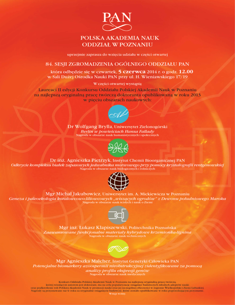 POLSKA AKADEMIA NAUK ODDZIAŁ W POZNANIU uprzejmie zaprasza do wzięcia udziału w części otwartej 84. SESJI ZGROMADZENIA OGÓLNEGO ODDZIAŁU PAN która odbędzie się w czwartek, 5 czerwca 2014 r. o godz. 12.00 w Sali Dużej Ośrodka Nauki PAN przy ul. H. Wieniawskiego 17/19 W części otwartej wystąpią Laureaci II edycji Konkursu Oddziału Polskiej Akademii Nauk w Poznaniu na najlepszą oryginalną pracę twórczą doktoranta opublikowaną w roku 2013 w pięciu obszarach naukowych: Dr Wolfgang Brylla, Uniwersytet Zielonogórski D Berlin w powieściach Hansa Fallady Nagroda N g w obszarze nauk humanistycznych i społecznych Dr in inż. Agnieszka eszka Pietrzyk Pietrzy , Instytut tytut Chemii Bioorgan Bioorganicznej cznej PAN pleksu białek zapasowych jedwabnika morwowego orwowego przy pomocy kr ystalografii rrentgenowskiej ntg Odkrycie kompleksu krystalografii Nagroda w obszarze nauk biologicznych iol i rolniczych Mgr Michał Jakubowicz, Uniwersytet im. A. Mickiewicza w Poznaniu Geneza i paleoekologia koralowcowo-liliowcowych “wiszących ogrodów” z Dewonu południowego Maroka Nagroda w obszarze nauk ścisłych i nauk o Ziemi Mgr inż. Łukasz Klapiszewski, Politechnika Poznańska Zaawansowane funkcjonalne materiały hybrydowe krzemionka-lignina Nagroda w obszarze nauk technicznych Mgr Agnieszka Malcher, Instytut Genetyki Człowieka PAN Potencjalne biomarkery azoospermii nieobstrukcyjnej zidentyfikowane za pomocą analizy profilu ekspresji genów Nagroda w obszarze nauk medycznych Konkurs Oddziału Polskiej Akademii Nauk w Poznaniu na najlepszą oryginalną pracę twórczą, której wiodącym autorem jest doktorant, ma na celu popularyzację osiągnięć badawczych młodych adeptów nauki oraz podkreślenie roli Polskiej Akademii Nauk w promocji nauki oraz jej szczególnej obecności w regionie Wielkopolski i Ziemi Lubuskiej. Nagrody są przyznawane raz w roku za oryginalne osiągnięcie badawcze, które zostało opublikowane w roku poprzedzającym przyznanie. Wstęp wolny.