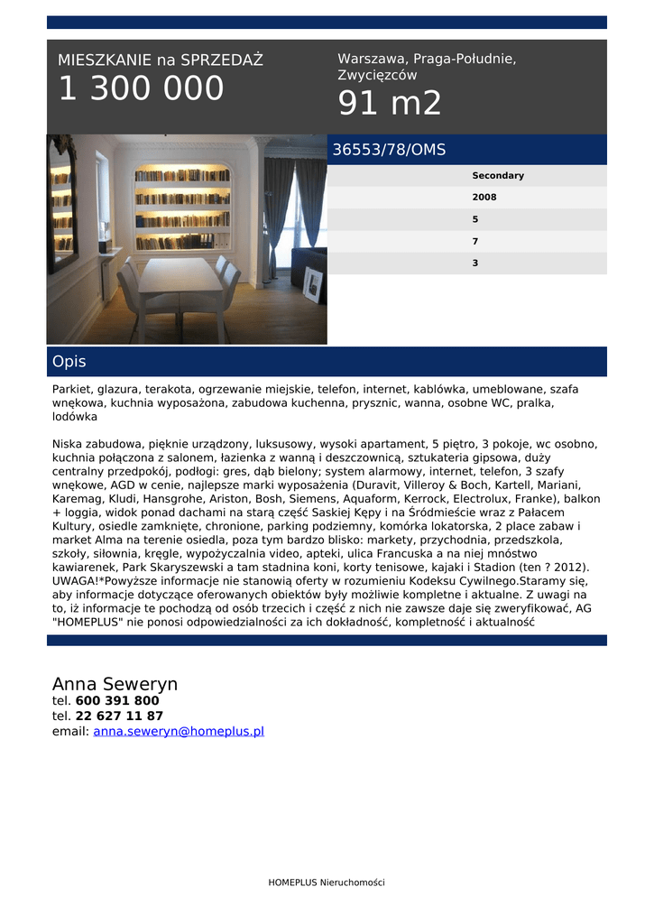 MIESZKANIE na SPRZEDAŻ 1 300 000 Warszawa, Praga-Południe, Zwycięzców 91 m2 36553/78/OMS Secondary 2008 5 7 3 Opis Parkiet, glazura, terakota, ogrzewanie miejskie, telefon, internet, kablówka, umeblowane, szafa wnękowa, kuchnia wyposażona, zabudowa kuchenna, prysznic, wanna, osobne WC, pralka, lodówka Niska zabudowa, pięknie urządzony, luksusowy, wysoki apartament, 5 piętro, 3 pokoje, wc osobno, kuchnia połączona z salonem, łazienka z wanną i deszczownicą, sztukateria gipsowa, duży centralny przedpokój, podłogi: gres, dąb bielony; system alarmowy, internet, telefon, 3 szafy wnękowe, AGD w cenie, najlepsze marki wyposażenia (Duravit, Villeroy & Boch, Kartell, Mariani, Karemag, Kludi, Hansgrohe, Ariston, Bosh, Siemens, Aquaform, Kerrock, Electrolux, Franke), balkon + loggia, widok ponad dachami na starą część Saskiej Kępy i na Śródmieście wraz z Pałacem Kultury, osiedle zamknięte, chronione, parking podziemny, komórka lokatorska, 2 place zabaw i market Alma na terenie osiedla, poza tym bardzo blisko: markety, przychodnia, przedszkola, szkoły, siłownia, kręgle, wypożyczalnia video, apteki, ulica Francuska a na niej mnóstwo kawiarenek, Park Skaryszewski a tam stadnina koni, korty tenisowe, kajaki i Stadion (ten ? 2012). UWAGA!*Powyższe informacje nie stanowią oferty w rozumieniu Kodeksu Cywilnego.Staramy się, aby informacje dotyczące oferowanych obiektów były możliwie kompletne i aktualne. Z uwagi na to, iż informacje te pochodzą od osób trzecich i część z nich nie zawsze daje się zweryfikować, AG "HOMEPLUS" nie ponosi odpowiedzialności za ich dokładność, kompletność i aktualność Anna Seweryn tel. 600 391 800 tel. 22 627 11 87 email: [email protected] HOMEPLUS Nieruchomości Powered by TCPDF (www.tcpdf.org)