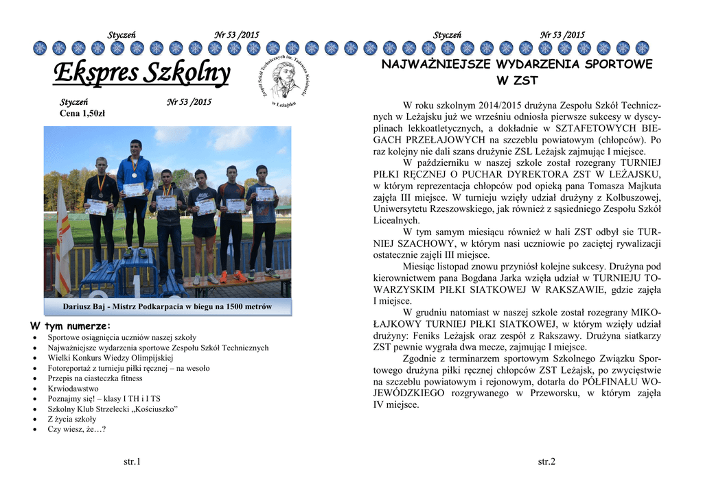 Styczeń Nr 53 /2015 Ekspres Szkolny Styczeń Nr 53 /2015 Cena 1,50zł Dariusz Baj - Mistrz Podkarpacia w biegu na 1500 metrów W tym numerze: Sportowe osiągnięcia uczniów naszej szkoły Najważniejsze wydarzenia sportowe Zespołu Szkół Technicznych Wielki Konkurs Wiedzy Olimpijskiej Fotoreportaż z turnieju piłki ręcznej – na wesoło Przepis na ciasteczka fitness Krwiodawstwo Poznajmy się! – klasy I TH i I TS Szkolny Klub Strzelecki „Kościuszko” Z życia szkoły Czy wiesz, że…? str.1 Styczeń Nr 53 /2015 NAJWAŻNIEJSZE WYDARZENIA SPORTOWE W ZST W roku szkolnym 2014/2015 drużyna Zespołu Szkół Technicznych w Leżajsku już we wrześniu odniosła pierwsze sukcesy w dyscyplinach lekkoatletycznych, a dokładnie w SZTAFETOWYCH BIEGACH PRZEŁAJOWYCH na szczeblu powiatowym (chłopców). Po raz kolejny nie dali szans drużynie ZSL Leżajsk zajmując I miejsce. W październiku w naszej szkole został rozegrany TURNIEJ PIŁKI RĘCZNEJ O PUCHAR DYREKTORA ZST W LEŻAJSKU, w którym reprezentacja chłopców pod opieką pana Tomasza Majkuta zajęła III miejsce. W turnieju wzięły udział drużyny z Kolbuszowej, Uniwersytetu Rzeszowskiego, jak również z sąsiedniego Zespołu Szkół Licealnych. W tym samym miesiącu również w hali ZST odbył sie TURNIEJ SZACHOWY, w którym nasi uczniowie po zaciętej rywalizacji ostatecznie zajęli III miejsce. Miesiąc listopad znowu przyniósł kolejne sukcesy. Drużyna pod kierownictwem pana Bogdana Jarka wzięła udział w TURNIEJU TOWARZYSKIM PIŁKI SIATKOWEJ W RAKSZAWIE, gdzie zajęła I miejsce. W grudniu natomiast w naszej szkole został rozegrany MIKOŁAJKOWY TURNIEJ PIŁKI SIATKOWEJ, w którym wzięły udział drużyny: Feniks Leżajsk oraz zespół z Rakszawy. Drużyna siatkarzy ZST pewnie wygrała dwa mecze, zajmując I miejsce. Zgodnie z terminarzem sportowym Szkolnego Związku Sportowego drużyna piłki ręcznej chłopców ZST Leżajsk, po zwycięstwie na szczeblu powiatowym i rejonowym, dotarła do PÓŁFINAŁU WOJEWÓDZKIEGO rozgrywanego w Przeworsku, w którym zajęła IV miejsce. str.2 Styczeń Nr 53 /2015 Styczeń Nr 53 /2015 Drużyna siatkarskiej reprezentacji ZST skutecznie rozpoczęła zmagania na szczeblu powiatowym, nie dając szans drużynie ZSL Leżajsk i ZS Nowa Sarzyna. Chłopcy z naszej szkoły zajęli I miejsce i przygotowują się do zawodów na szczeblu rejonowym. W dniu 19.12.2014 w Nowej Sarzynie, odbył sie FINAŁ WOJEWÓDZKI TENISA STOŁOWEGO (chłopców). Drużyna ZST Leżajsk pod opieką pana Grzegorza Nalepy przechodząc bezkonkurencyjnie etapy rozgrywek na szczeblu powiatowym i rejonowym, uległa ostatecznie drużynom m.in. z Krosna i Jarosławia zajmując IV miejsce. Reprezentacja drużyny koszykarskiej w ramach powiatowej licealiady pokonała drużynę ZSL Leżajsk 32:22 i zajęła I miejsce. Dużą imprezą siatkarską w marcu 2013 roku był FINAŁ MISTRZOSTW POLSKI JUNIORÓW. Wzięły w nim udział drużyny m.in. takie jak: Skra Bełchatów, TS Volley Rybnik, KS Metro Warszawa, Exact System Norwid Częstochowa, AKS Resovia Rzeszów, KS Jastrzębski Węgiel II, ASZ UWM Olsztyn. Finał Mistrzostw Polski Juniorów str.3 str.4 Styczeń Nr 53 /2015 W hali ZST kilkakrotnie organizowany był Ogólnopolski Turniej „Od młodzika do juniora" w którym brały udział drużyny z całej Polski, w tym reprezentacja Polski. Jeszcze innym ciekawym widowiskiem był XVI Festiwal Siatkówki w 2005 roku, w którym uczestniczyło 170 zawodników. W ciągu całego roku szkolnego w naszej szkole organizowane są również widowiska sportowe niższej rangi takie jak: - Turniej Międzyklasowy Piłki Halowej Chłopców i Dziewcząt o Puchar Dyrektora i Wicedyrektora Zespołu Szkół Technicznych w Leżajsku - Leżajska Amatorska Liga Halowej Piłki Nożnej im. A. Baja (od 2000r.). Reprezentacja nauczycieli z Zespołu Szkół Technicznych kilka razy rozegrała towarzyskie mecze z reprezentacją OO. Bernardynów z Leżajska. Przy wielkim dopingu uczniów nauczyciele jeszcze nigdy nie przegrali. Natomiast, w tym roku nasza drużyna zmierzyła się z zespołem nauczycieli z Myślenic, którzy gościnnie wraz z burmistrzem miasta Myślenice zawitali do naszej szkoły. Spotkanie zakończyło się wynikiem 6– 2 dla gospodarzy, którym po raz kolejny niewątpliwie pomógł żywiołowy doping trybun. Dodatkowo nasi nauczyciele biorą udział w podobnych rozgrywkach poza szkołą, takich jak: - turniej piłki nożnej im. J.Hajdasza - turniej piłki nożnej pamięci R. Ostrowskiego - charytatywny turniej piłki halowej pod nazwą: „Gramy i tańczymy dla Mateuszka i Kacperka" rozgrywany corocznie w Myślenicach. Wszystkie te wydarzenia na bieżąco zapisywane są w Kronice Wydarzeń Sportowych naszej szkoły. str.5 Styczeń Nr 53 /2015 Zespół Szkół Technicznych w Leżajsku dysponuje pełnowymiarową halą, która umożliwia przeprowadzenie imprez sportowych na poziomie lokalnym, krajowym a nawet europejskim. Do najbardziej prestiżowych imprez które odbyły się w hali ZST możemy zaliczyć mecze piłki siatkowej reprezentacji kobiet Polski i Holandii oraz mężczyzn pomiędzy drużyną Asseco Resovii Rzeszów i Fenerbahce Grundig Stambuł. Podczas dwumeczu polskich siatkarek w 2003 roku hala widowiskowo-sportowa ZST była w stanie pomieścić półtora tysiąca widzów. Przy olbrzymiej wrzawie kibiców Polska wygrała dwa razy po 3:0. Mecze sędziowali Piotr Dudek - międzynarodowy sędzia siatkarski, nauczyciel Zespołu Szkół Technicznych w Leżajsku oraz Andrzej Lemek z Krakowa. str.6 Styczeń Nr 53 /2015 str.7 Styczeń Nr 53 /2015 str.8 Styczeń Nr 53 /2015 Osiągnięcia indywidualne uczniów ZST Socha Katarzyna (kolarstwo) – uczennica klasy 1 TG , zawodniczka klubu Smak Górno Poltino Azalia Brzóza Królewska. W 2014 roku podopieczna trenera Stanisława Zygmunta zdobyła złoty medal w mistrzostwach Polski w kolarstwie przełajowym oraz srebrny krążek w czempionacie krajowym na szosie w jeździe indywidualnej n