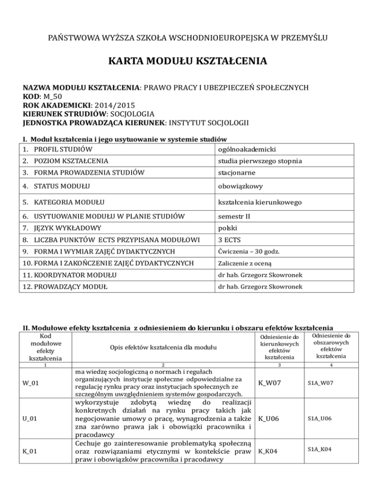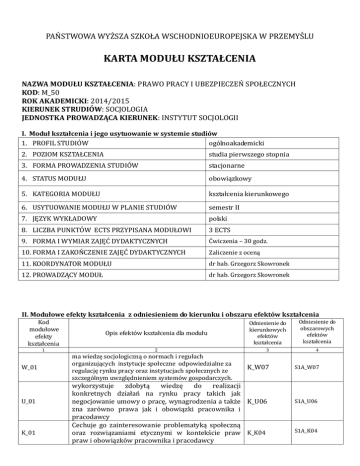 PAŃSTWOWA WYŻSZA SZKOŁA WSCHODNIOEUROPEJSKA W PRZEMYŚLU KARTA MODUŁU KSZTAŁCENIA NAZWA MODUŁU KSZTAŁCENIA: PRAWO PRACY I UBEZPIECZEŃ SPOŁECZNYCH KOD: M_50 ROK AKADEMICKI: 2014/2015 KIERUNEK STRUDIÓW: SOCJOLOGIA JEDNOSTKA PROWADZĄCA KIERUNEK: INSTYTUT SOCJOLOGII I. Moduł kształcenia i jego usytuowanie w systemie studiów 1. PROFIL STUDIÓW ogólnoakademicki 2. POZIOM KSZTAŁCENIA studia pierwszego stopnia 3. FORMA PROWADZENIA STUDIÓW stacjonarne 4. STATUS MODUŁU obowiązkowy 5. KATEGORIA MODUŁU kształcenia kierunkowego 6. USYTUOWANIE MODUŁU W PLANIE STUDIÓW semestr II 7. JĘZYK WYKŁADOWY polski 8. LICZBA PUNKTÓW ECTS PRZYPISANA MODUŁOWI 3 ECTS 9. FORMA I WYMIAR ZAJĘĆ DYDAKTYCZNYCH Ćwiczenia – 30 godz. 10. FORMA I ZAKOŃCZENIE ZAJĘĆ DYDAKTYCZNYCH Zaliczenie z oceną 11. KOORDYNATOR MODUŁU dr hab. Grzegorz Skowronek 12. PROWADZĄCY MODUŁ dr hab. Grzegorz Skowronek II. Modułowe efekty kształcenia z odniesieniem do kierunku i obszaru efektów kształcenia Kod modułowe efekty kształcenia 1 W_01 U_01 K_01 Opis efektów kształcenia dla modułu Odniesienie do kierunkowych efektów kształcenia Odniesienie do obszarowych efektów kształcenia 2 3 4 K_W07 S1A_W07 ma wiedzę socjologiczną o normach i regułach organizujących instytucje społeczne odpowiedzialne za regulację rynku pracy oraz instytucjach społecznych ze szczególnym uwzględnieniem systemów gospodarczych. wykorzystuje zdobytą wiedzę do realizacji konkretnych działań na rynku pracy takich jak negocjowanie umowy o pracę, wynagrodzenia a także K_U06 zna zarówno prawa jak i obowiązki pracownika i pracodawcy Cechuje go zainteresowanie problematyką społeczną oraz rozwiązaniami etycznymi w kontekście praw K_K04 praw i obowiązków pracownika i pracodawcy S1A_U06 S1A_K04 III. Treści kształcenia – oddzielnie dla każdej formy zajęć dydaktycznych (W – wykład; C - ćwiczenia; K – konwersatorium; L - laboratorium; PR – projekt, PKZ - praktyka zawodowa; WT – Warsztat) Kod form zajęć dydaktyczny ch C1 C2 Szczegółowy opis treści realizowanych w ramach zajęć wg form zajęć dydaktycznych Stosunek pracy: treść, powstanie, cechy. Źródła prawa pracy: Konstytucja RP, kodeks pracy i inne ustawy, układy i porozumienia zbiorowe ,umowy międzynarodowe, prawo wspólnotowe, dyrektywy Rady Unii Europejskiej i Parlamentu Europejskiego. Podstawowe zasady prawa pracy. Nadzór i kontrola przestrzegania prawa pracy. Państwowa Inspekcja Pracy. Społeczna inspekcja pracy. Umowa o pracę. Elementy umowy o pracę. Uprawnienia pracownika w razie nieuzasadnionego lub niezgodnego z prawem wypowiedzenia umowy o pracę. Rozwiązanie umowy o pracę. Stosunek pracy na podstawie powołania, wyboru, mianowania oraz spółdzielczej umowy o pracę. Wynagrodzenie za pracę i inne świadczenia związane z pracą. Ochrona wynagrodzenia za pracę. C3 C4 C5 Obowiązki pracodawcy i pracownika. Kwalifikacje zawodowe pracowników. Odpowiedzialność materialna pracowników. Odpowiedzialność porządkowa pracowników. Odpowiedzialność za mienie powierzone pracownikowi. Regulamin pracy. Akta osobowe pracownika. Świadectwo pracy. Dyskryminacja i mobbing w stosunkach pracy. Czas pracy. Normy i ogólny wymiar czasu pracy .Praca w porze nocnej. Praca w Liczba godzin 4 5 5 4 niedzielę i święta 2 C6 C7 C8 C9 C10 C11 RAZEM Urlopy pracownicze. Urlopy bezpłatne. Urlopy wypoczynkowe. Planowanie urlopów. Uprawnienia pracownika związane z rodzicielstwem. Dokształcanie pracowników. Bezpieczeństwo i higiena pracy. Szczególna ochrona zdrowia. Podstawowe obowiązki pracodawcy. Prawa i obowiązki pracownika. Profilaktyczna ochrona zdrowia. Wypadki przy pracy i choroby zawodowe. Układy zbiorowe pracy. Porozumienia zbiorowe. Związki zawodowe. Rozpatrywanie sporów o roszczenia ze stosunku pracy . Odpowiedzialność za wykroczenia przeciwko prawom pracownika. Przedawnienie roszczeń. System emerytalny w Polsce – w zarysie. Ubezpieczenia i renty. Zasiłki chorobowe. ). Ustawa z dnia 20 kwietnia 2004 roku (znowelizowana) o promocji zatrudnienia i instytucjach rynku pracy Prawo pracy Unii Europejskiej. Swoboda przepływu pracowników. Warunki prawne do zatrudnienia pracowników, obywateli polskich, na terenie Unii Europejskiej i pracowników, skierowanych do pracy na terenie Rzeczypospolitej Polskiej przez pracodawcę, mającego siedzibę w państwie, będącym członkiem Unii Europejskiej. Zatrudnianie pracowników w formie telepracy. 4 2 4 4 2 4 30 IV. Literatura obowiązująca do zaliczenia modułu Literatura podstawowa 1. M. Gersdorf, K. Rączka, M. Raczkowski, Kodeks pracy. Komentarz, wyd. LexisNexis, Warszawa 2014 2. B. Gudowska, J. Strusińska-Żukowska, Ustawa o systemie ubezpieczeń społecznych. Komentarz, wyd. C.H. Beck, Warszawa 2014 3. A. Rzetecka - Gil, Ustawa o świadczeniach pieniężnych z ubezpieczenia społecznego w razie choroby i macierzyństwa. Komentarz, wyd. Wolters Kluwer, Warszawa 2009. Literatura uzupełniająca: 1. G. Szpor i inni, System ubezpieczeń społecznych. Zagadnienia podstawowe, wyd. LexisNexis, Warszawa 2013. 2. K. Stopka, Zasada subsydiarności w prawie pomocy społecznej, wyd. Difin, Warszawa 2009. 3. P. Wojciechowski, Prawo pracy w pytaniach i odpowiedziach, wyd. HR Services, Warszawa 2009.