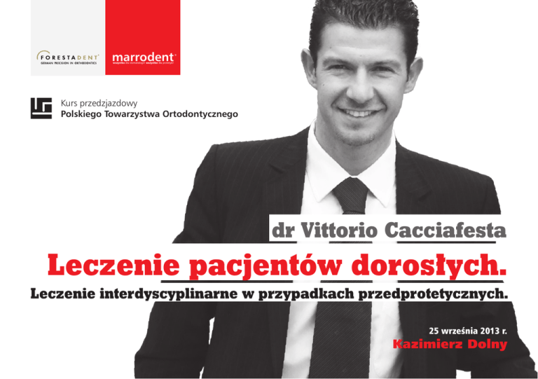 marrodent ® wszystko dla stomatologii! wszystko dla protetyki! Kurs przedzjazdowy Polskiego Towarzystwa Ortodontycznego dr Vittorio Cacciafesta Leczenie pacjentów dorosłych. Leczenie interdyscyplinarne w przypadkach przedprotetycznych. 25 września 2013 r. Kazimierz Dolny 25 września 2013 r. Hotel Król Kazimierz, ul. Puławska 86, 20-120 Kazimierz Dolny marrodent ® wszystko dla stomatologii! wszystko dla protetyki! Leczenie pacjentów dorosłych. Leczenie interdyscyplinarne w przypadkach przedprotetycznych. Wprowadzenie: leczenie zintegrowane, zmiany anatomiczne, zalety stosowania sił o niskich wartościach, leczenie stłoczeń u pacjentów dorosłych, choroby przyzębia, reakcje biologiczne tkanek przyzębia na siły ortodontyczne, -- biologiczna odpowiedź dorosłego pacjenta. 6. Postępowanie ortodontyczne z chorobami przyzębia. 2. Stworzenie planu leczenia: -- diagnostyczny Set-up, -- jak zaplanować leczenie interdyscyplinarne. 10. Ortodontyczne przemieszczenie przez bezzębny wyrostek: -- przesuwanie górnych i dolnych trzonowców gdzie jest granica? -- jak poprawić strukturę kości pod implant poprzez ortodontyczny ruch zębów. 1. ------- 3. Przypadki graniczne wad klasy II: -- postępowanie w przypadkach zgryzu głębokiego, -- przemieszczenie dowargowe dolnych siekaczy i otwarcie przestrzeni pod implant, -- procedury chirurgii ortognatycznej. 4. Leczenie przedprotetyczne, pionizacja zębów trzonowych: -- stosowanie podwójnej dźwigni, -- pionizująca sprężyna sandera. 5. ---- Systemy zakotwienia: implaty zintegrowane z kością, druty policzkowe i żuchwowe, miniimplanty. 8 PUNKTÓW EDUKACYJNYCH 7. Przesunięcie ortodontyczne przez ubytek kostny. Potwierdzeniem uczestnictwa w kursie jest certyfikat premiowany punktami edukacyjnymi. 8. Postępowanie z ubytkami międzyzębowymi. Koszt szkolenia obejmuje wykłady, przerwy kawowe oraz przerwę obiadową. 9. Postępowanie w przypadku ubytków jedno-, dwu- i trójściennych. 11. Intruzja a ekstruzja zębów z chorobami przyzębia. 12. Leczenie ortodontyczne dorosłych pacjentów z ciężkimi chorobami przyzębia. -- planowanie leczenia biomechanicznego i interdyscyplinarnego, -- wymogi zakotwienia, -- stosowanie długich ramion siły, -- leczenie lingwalne. Koszt uczestnictwa w kursie 450 PLN Kurs odbędzie się w godz. 9.00-17.30. Informacje i zapisy: Dział Ortodoncji Marrodent® tel. 22 843 06 60, [email protected] Klaudia Rokitka - tel. 604 873 968, [email protected] Katarzyna Klemczyńska - tel. 883 384 983, [email protected] Ostatecznym potwierdzeniem uczestnictwa w kursie jest wpłata na poniżej podane konto bankowe. MARRODENT SP. Z O.O., 43-300 Bielsko-Biała, ul. Krasińskiego 31 nr konta: BRE BANK 48 1140 1049 0000 2278 7400 1024 w tytule płatności prosimy wpisać: dane do faktury, tel. kontaktowy, ORTO W przypadku zgłoszenia rezygnacji, organizator zastrzega sobie prawo do zwrotu uczestnikowi 50% kosztów, jednak nie później niż 10 dni przed szkoleniem. W razie rezygnacji po tym terminie, koszty nie będą zwracane. W przypadku odwołania szkolenia przez organizatora, zwrotowi podlega całość wpłaconych pieniędzy. 13. Zasady retencji. 14. Wnioski. dr Vittorio Cacciafesta Ukończył studia stomatologiczne na Uniwersytecie “Federico II” w Neapolu we Włoszech. W latach 19951996 był pracownikiem naukowym w Katedrze Ortodoncji na Uniwersytecie Humboldt w Berlinie, Niemcy. Specjalizację i tytuł Master of Science w dziedzinie ortodoncji otrzymał w Royal Dental College, na Uniwestyecie w Aarhus, w Danii. Był wykładowcą na Wydziale Ortondocji Uniwesytetu Aarhus i Uniwersytetu Temple w Filadelfii, USA. Od 1999 r. do 2009 r. był adiunktem Zakładu Ortodoncji Uniwersytetu Pavia we Włoszech. Do tej pory opublikował ponad 100 artykułów, 2 książki i 4 rozdziały. Jest współredaktorem “Ortodonzia Clinica” i Progress in Orthodontics”, a także recenzentem “American Journal of Orthodontics and Dentofacial Orthopedics”, “Angle Orthodontist”, “European Journal of Orthodontics”, “Journal of Clinical Orthodontics”, “Journal of Orthodontics”, “Orthodontics and Craniofacial Research”, “Ortognatodonzia Italiana”. Szczególnie zainteresowany tematyką: leczenie pacjentów dorosłych, biomechanika, ortodoncja lingwalna oraz leczenie interdyscyplinarne. Wykłada w Europie, Azji, Ameryce Północnej i Południowej oraz Afryce. W lipcu 2012 roku dr Cacciafesta został wybrany na prezesa Europejskiego Towarzystwa Ortodoncji Lingwalnej na lata 2012 - 2014.