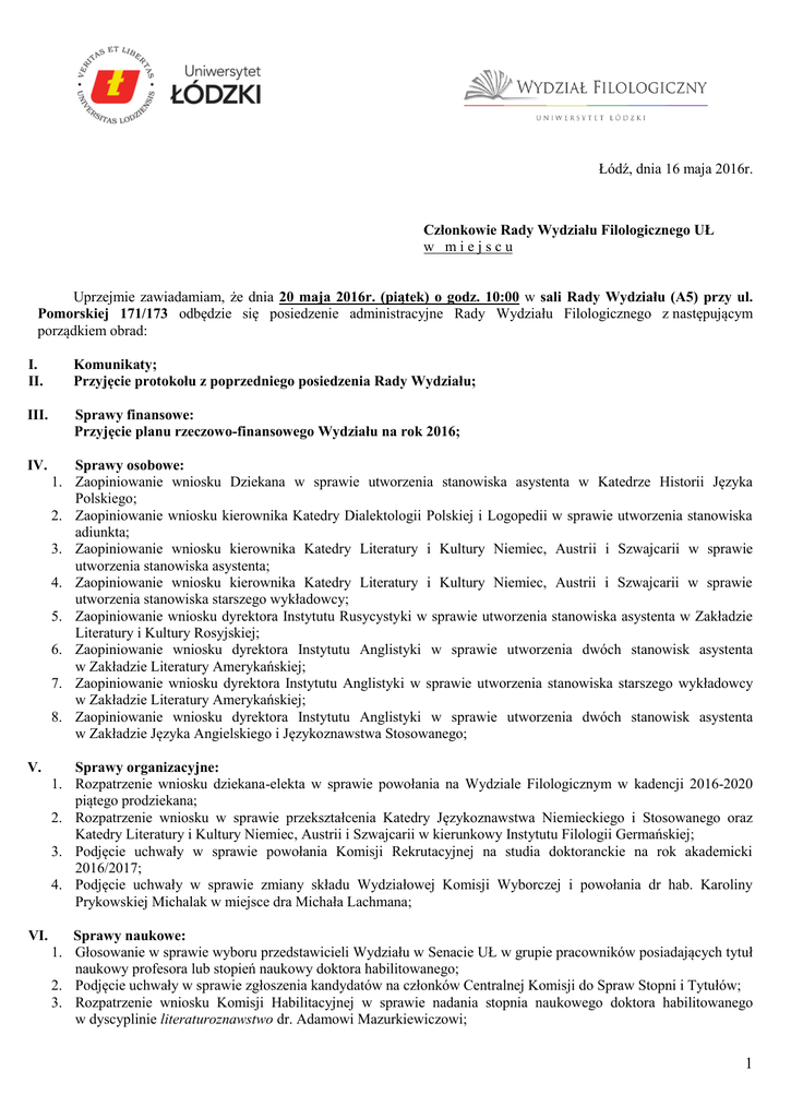 Łódź, dnia 16 maja 2016r. Członkowie Rady Wydziału Filologicznego UŁ w miejscu Uprzejmie zawiadamiam, że dnia 20 maja 2016r. (piątek) o godz. 10:00 w sali Rady Wydziału (A5) przy ul. Pomorskiej 171/173 odbędzie się posiedzenie administracyjne Rady Wydziału Filologicznego z następującym porządkiem obrad: I. II. Komunikaty; Przyjęcie protokołu z poprzedniego posiedzenia Rady Wydziału; III. Sprawy finansowe: Przyjęcie planu rzeczowo-finansowego Wydziału na rok 2016; IV. Sprawy osobowe: 1. Zaopiniowanie wniosku Dziekana w sprawie utworzenia stanowiska asystenta w Katedrze Historii Języka Polskiego; 2. Zaopiniowanie wniosku kierownika Katedry Dialektologii Polskiej i Logopedii w sprawie utworzenia stanowiska adiunkta; 3. Zaopiniowanie wniosku kierownika Katedry Literatury i Kultury Niemiec, Austrii i Szwajcarii w sprawie utworzenia stanowiska asystenta; 4. Zaopiniowanie wniosku kierownika Katedry Literatury i Kultury Niemiec, Austrii i Szwajcarii w sprawie utworzenia stanowiska starszego wykładowcy; 5. Zaopiniowanie wniosku dyrektora Instytutu Rusycystyki w sprawie utworzenia stanowiska asystenta w Zakładzie Literatury i Kultury Rosyjskiej; 6. Zaopiniowanie wniosku dyrektora Instytutu Anglistyki w sprawie utworzenia dwóch stanowisk asystenta w Zakładzie Literatury Amerykańskiej; 7. Zaopiniowanie wniosku dyrektora Instytutu Anglistyki w sprawie utworzenia stanowiska starszego wykładowcy w Zakładzie Literatury Amerykańskiej; 8. Zaopiniowanie wniosku dyrektora Instytutu Anglistyki w sprawie utworzenia dwóch stanowisk asystenta w Zakładzie Języka Angielskiego i Językoznawstwa Stosowanego; V. Sprawy organizacyjne: 1. Rozpatrzenie wniosku dziekana-elekta w sprawie powołania na Wydziale Filologicznym w kadencji 2016-2020 piątego prodziekana; 2. Rozpatrzenie wniosku w sprawie przekształcenia Katedry Językoznawstwa Niemieckiego i Stosowanego oraz Katedry Literatury i Kultury Niemiec, Austrii i Szwajcarii w kierunkowy Instytutu Filologii Germańskiej; 3. Podjęcie uchwały w sprawie powołania Komisji Rekrutacyjnej na studia doktoranckie na rok akademicki 2016/2017; 4. Podjęcie uchwały w sprawie zmiany składu Wydziałowej Komisji Wyborczej i powołania dr hab. Karoliny Prykowskiej Michalak w miejsce dra Michała Lachmana; VI. Sprawy naukowe: 1. Głosowanie w sprawie wyboru przedstawicieli Wydziału w Senacie UŁ w grupie pracowników posiadających tytuł naukowy profesora lub stopień naukowy doktora habilitowanego; 2. Podjęcie uchwały w sprawie zgłoszenia kandydatów na członków Centralnej Komisji do Spraw Stopni i Tytułów; 3. Rozpatrzenie wniosku Komisji Habilitacyjnej w sprawie nadania stopnia naukowego doktora habilitowanego w dyscyplinie literaturoznawstwo dr. Adamowi Mazurkiewiczowi; 1 4. Rozpatrzenie wniosku prof.dr hab. Agnieszki Salskiej w sprawie wyznaczenia recenzentów pracy doktorskiej mgr Magdaleny Szuster oraz składu Komisji doktorskich; 5. Rozpatrzenie wniosku prof.dr hab. Grzegorza Gazdy w sprawie wyznaczenia recenzentów pracy doktorskiej mgr Joanny Podolskiej oraz składu Komisji doktorskich; 6. Rozpatrzenie wniosku dr hab. Jacka Walińskiego w sprawie wyznaczenia recenzentów pracy doktorskiej mgra Marcina Trojszczaka oraz składu Komisji doktorskich; 7. Rozpatrzenie wniosku prof.dr hab. Grażyny Habrajskiej w sprawie wyznaczenia recenzentów pracy doktorskiej mgr Anity Filipczak-Białkowskiej oraz składu Komisji doktorskich; 8. Rozpatrzenie wniosku mgr Zuzanny Kiermasz w sprawie wszczęcia przewodu doktorskiego w dyscyplinie językoznawstwo na podstawie pracy pt. Researching the relationship between the use of L2 and L3 learning strategies by foreign language majors with an additional language (Badanie zależności między użyciem strategii uczenia się języków drugiego i trzeciego przez studentów filologii z dodatkowym językiem obcym) oraz wyznaczenia dr hab.prof.UŁ Jana Majera na promotora i dr Anny Parr-Modrzejewskiej na promotora pomocniczego; 9. Rozpatrzenie wniosku mgra Mateusza Żebrowskiego w sprawie wszczęcia przewodu doktorskiego w dyscyplinie kulturoznawstwo na podstawie pracy pt. Twórcy ojczyzn magicznych w literaturze i w filmie na przełomie XX i XXI wieku oraz wyznaczenia dr hab. Nataszy Korczarowskiej na promotora; 10. Rozpatrzenie wniosku mgra Mateusza Grabowskiego w sprawie wszczęcia przewodu doktorskiego w dyscyplinie literaturoznawstwo na podstawie pracy pt. „Nieskończona jeszcze Dziejów praca”. Norwid w (późnej) nowoczesności oraz wyznaczenia prof.dr hab. Jacka Brzozowskiego na promotora; 11. Rozpatrzenie wniosku mgra Tomasza Szczęsnego w sprawie wszczęcia przewodu doktorskiego w dyscyplinie kulturoznawstwo na podstawie pracy pt. Spaghetti western. Charakterystyka gatunku na tle historycznofilmowym oraz wyznaczenia dr hab.prof.UŁ Tomasza Kłysa na promotora; 12. Rozpatrzenie wniosku Komisji w sprawie uznania dyplomu Pana Ali Ahmeta Aydina uzyskanego w Uniwersytecie Lingwistycznym w Kijowie za równoważny z polskim dyplomem uzyskania stopnia naukowego doktora nauk humanistycznych w dyscyplinie językoznawstwo; 13. Wyznaczenie Komisji ds. nostryfikacji dyplomu Pani Kristiny Gladskaia uzyskanego w Rosyjskim Państwowym Uniwersytecie Humanitarnym; 14. Wyznaczenie składu Komisji na egzamin doktorski z filozofii dla mgr Aleksandry Bajerskiej; 15. Wyznaczenie składu Komisji na egzamin doktorski z filozofii dla mgr Anity Filipczak-Białkowskiej; 16. Wyznaczenie składu Komisji na egzamin doktorski z filozofii dla mgr Elżbiety Dałek; 17. Wyznaczenie składu Komisji na egzamin doktorski z filozofii dla mgra Piotra Werłosa; 18. Wyznaczenie składu Komisji na egzamin doktorski z filozofii dla mgr Katarzyny Kuszewskiej; 19. Wyznaczenie składu Komisji na egzamin doktorski z filozofii dla mgr Anny Maćkowiak; 20. Wyznaczenie składu Komisji na egzamin doktorski z ekonomii dla mgr Pauli Góralczyk-Mowczan; 21. Wyznaczenie składu Komisji na egzamin doktorski z języka angielskiego dla mgr Anny Maćko