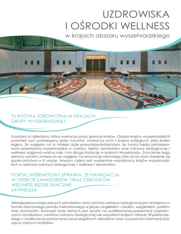 UZDROWISKA i ośrodki wellness w krajach obszaru wyszehradzkiego Tu rystyka zdrowotna w krajach Grupy Wyszehradzkiej Turystyka to dziedzina, która wykracza poza granice krajów. Obszar krajów wyszehradzkich powinien być postrzegany przez turystów, zwłaszcza tych z krajów odległych, jako jeden region. Ze względu na to istnieje duże prawdopodobieństwo, że turyści będą zainteresowani przestrzenią wyszehradzką w całości. Sektor sanatoriów oraz odnowy biologicznej / wellness odgrywa ważną rolę i ma długą tradycję w krajach Wyszehradu. Znaczenie tego sektora wzrasta zwłaszcza ze względu na promocję zdrowego stylu życia oraz starzenie się społeczeństwa w E uropie. Naszym celem jest wspieranie współpracy krajów wyszehradzkich w sektorze odnowy biologicznej / wellness i sanatoriów. Portal internetowy sprawia, że nawigacja w ofercie sanatoriów oraz ośrodków wellness będzie znacznie łatwiejsza Wielojęzykowa baza danych sanatoriów oraz centrów odnowy biologicznej jest dostępna w formie darmowego portalu internetowego w języku angielskim, czeskim, węgierskim, polskim oraz słowackim. Koncept bazy danych jest oparty na zunifikowanej prezentacji pojedynczych sanatoriów i centrów odnowy biologicznej we wszystkich krajach Układu Wyszehradzkiego z możliwością porównania poszczególnych ośrodków oraz wyszukania informacji przy użyciu różnych kryteriów. Logiczny model bazy danych www.v4medicalspas.eu Kruterium nr 1 Położenie geograficzne (państwo – region – miejsce). Kryterium nr 2 Określenie profilu uzdrowiska (specjalizacja w leczeniu zdefiniowanej grupy diagnoz albo pojedynczych chorób) Choroby skórne – Choroby układu sercowo-naczyniowego – Zwyrodnienia układu ruchowego – Choroby neurologiczne – Choroby układu oddechowego – Choroby geriatryczne – Choroby układu moczowego – Choroby układu trawiennego – Choroby układu rozrodczego. Dodatkowy program odnowy biologicznej i spa Program szkolenia – program edukacyjny. Kryterium nr 3 Zapewnienie procedur leczenia w uzdrowisku (grupy zabiegów) Balneoterapia – Hydroterapia – Termoterapia – Elektroterapia – Mechanoterapia – Terapia Światłem – Fizjoterapia – Ergoterapia – Żywienie medyczne – Inne zabiegi medyczne. Kryterium nr 4 Naturalne/lecznicze zasoby Torf/ borowina – Źródła lecznicze – Gaz – Warunki klimatyczne – Talasoterapia. Kryterium nr 5 Profesjonalizm świadczonych usług Biegłość językowa – Certyfkaty na używane zasoby naturalne i opiekę – Dostępność służb ratunkowych – Codzienna dostępność lekarza – Planowanie żywienia – Konsultacja w zakresie żywienia – Usługi psychologa – Opieka nad dziećmi – Konsultacja w zakresie zdrowego stylu życia – Opieka i leczenie geriatryczne – Opieka i leczenie dzieci – Końcowy raport medyczny – Certyfikat jakości: ISO, HCCP, EuropeSpa med, EuropeSpa wellness. Kryterium nr 6 Infrastruktura spa i odnowy biologicznej Zakwaterowanie (typ, kategoria, przedział cenowy) – Wyżywienie (typ) – Basen, sauna – Park i obszary zielone – Wpływ środowiska i hałas – Parking – Zaplecze sportowe – Wynajem sprzętu sportowego. Kryterium nr 7 Atrakcje turystyczne ( atrakcje turystyczne w obrębie 50 km) Zabytki (zamki, miasta historyczne, kościoły), atrakcje naturalne (góry, jeziora, rezerwaty przyrody…) – Parki rozrywki i muzea – ZOO – wydarzenia kulturalne (festiwale sztuki, wydarzenia sportowe, ludowe i religijne…). Kryterium nr 8 Planowanie trasy i transport Odległość od lotniska, stacji kolejowej i autobusowej. Kryterium nr 9 Linki do przydatnych portali i stron internetowych. Balneoterapia jako część leczenia Balneoterapia (terapia uzdrowiskowa) ma długą tradycję we wszystkich krajach Wyszehradu i jest integralną częścią opieki zdrowotnej. Uzdrowiska pojawiały się na terenach bogatych w naturalne zasoby lecznicze (źródła, gazy i borowiny) i warunki klimatyczne odpowiednie do leczenia. Te czynniki wciąż pozostają nieodzownymi czynnikami uznania danego miejsca, jako uzdrowiska. Balneoterapia, jako część opieki zdrowotnej jest zapewniana tylko w ośrodkach z medycznym zapleczem. Programy balneoterapii (terapia uzdrowiskowa) są wprowadzane przez lekarzy medycyny na podstawie badania i oceny lekarskiej. Jakość balneoterapii opiera się na lokalnych naturalnych zasobach leczniczych i wiedzy ekspertów (lekarzy, fizjoterapeutów, ergo terapeutów, terapeutów żywienia, psychologów…). Pozytywnymi czynnikami takimi, jak jakość powietrza, chronione obszary uzdrowiskowe z wysokim popytem na jakość warunków środowiskowych i atrakcyjne otoczenie sprawiają, że uzdrowiska i ośrodki odnowy biologicznej w Czechach, na Węgrzech, w Polsce i Słowacji są ulubionymi celami podróży turystyki uzdrowiskowej. Źródło: Stowarzyszenie Słowackich Uzdrowisk Uzdrowiska i Ośrodki wellness na terenie państw Grupy Wyszehradzkiej Projekt finansowany jest w ramach programu standardowych grantów Międzynarodowego Funduszu Wyszehradzkiego. Kategoria projektu: Promocja turystyki Koordynator projektu Czechy Balneologiczny Istytut Badawczy www.balneologie.eu Partnerzy projektu Słowacja Stowarzyszenie Słowackich Uzdrowisk www.ask.sk Polska Stowarzyszenie Gmin Uzdrowiskowych RP www.sgurp.pl Węgry Węgierskie Stowarzyszenie Marketingu ds. Turystyki Uzdrowiskowej www.meme.hu Kontynuacja projektu Przedstawiony projekt ma być kontynuowany na poziomie każdego państwa członkowskiego oraz ma być ulepszany i rozwijany zgodnie z okolicznościami w przyszłości. Strona projektu: www.V4medicalspas.eu Fundusz Wyszehradzki Misją Międzynarodowego Funduszu Wyszehradzkiego jest promocja dalszego rozwoju bliskiej współpracy między krajami Grupy Wyszehradzkiej (V4) oraz wzmocnienie więzi między ludźmi w tym regionie. Fundusz zapewnia finansowanie wspólnych kulturalnych, naukowych, badawczych i edukacyjnych projektów, młodzieżo