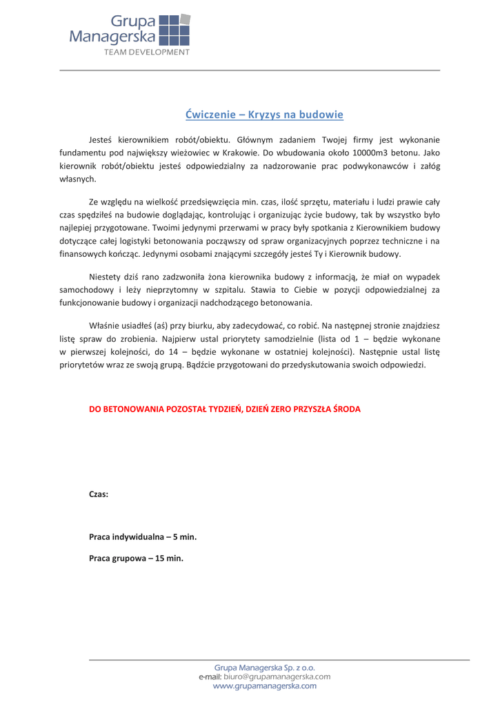 Ćwiczenie – Kryzys na budowie Jesteś kierownikiem robót/obiektu. Głównym zadaniem Twojej firmy jest wykonanie fundamentu pod największy wieżowiec w Krakowie. Do wbudowania około 10000m3 betonu. Jako kierownik robót/obiektu jesteś odpowiedzialny za nadzorowanie prac podwykonawców i załóg własnych. Ze względu na wielkośd przedsięwzięcia min. czas, ilośd sprzętu, materiału i ludzi prawie cały czas spędziłeś na budowie doglądając, kontrolując i organizując życie budowy, tak by wszystko było najlepiej przygotowane. Twoimi jedynymi przerwami w pracy były spotkania z Kierownikiem budowy dotyczące całej logistyki betonowania począwszy od spraw organizacyjnych poprzez techniczne i na finansowych koocząc. Jedynymi osobami znającymi szczegóły jesteś Ty i Kierownik budowy. Niestety dziś rano zadzwoniła żona kierownika budowy z informacją, że miał on wypadek samochodowy i leży nieprzytomny w szpitalu. Stawia to Ciebie w pozycji odpowiedzialnej za funkcjonowanie budowy i organizacji nadchodzącego betonowania. Właśnie usiadłeś (aś) przy biurku, aby zadecydowad, co robid. Na następnej stronie znajdziesz listę spraw do zrobienia. Najpierw ustal priorytety samodzielnie (lista od 1 – będzie wykonane w pierwszej kolejności, do 14 – będzie wykonane w ostatniej kolejności). Następnie ustal listę priorytetów wraz ze swoją grupą. Bądźcie przygotowani do przedyskutowania swoich odpowiedzi. DO BETONOWANIA POZOSTAŁ TYDZIEŃ, DZIEŃ ZERO PRZYSZŁA ŚRODA Czas: Praca indywidualna – 5 min. Praca grupowa – 15 min. Grupa Managerska Sp. z o.o. e-mail: [email protected] www.grupamanagerska.com Ranking: Indywi dualny Grupowy Zadanie Dopracowad plan betonowania wymagany umową z Inwestorem do przekazania. Uzgodnienia u Zarządcy i na Policji wprowadzenie TOR (tymczasowej organizacji ruchu). Organizacja placu budowy – dojazd gruszek i stanowiska dla pomp, miejsce na laboratorium polowe. Wyznaczenie i przygotowanie miejsca do płukania się gruszek. Poszukad notatek i dokumentów sporządzanych na temat betonowania. Wysład kierownikowi budowy życzenia szybkiego powrotu do zdrowia. Zorganizowad spotkanie z brygadzistami, dotyczące spraw technicznych i logistycznych. Odpowiedzied na e-maile kierownika budowy dotyczące betonowania. Doprecyzowad z Inspektorem sposób pielęgnacji i chłodzenia masywu betonowego. Przygotowad informację do prasy i radia na temat betonowania. Przygotowad informację do mieszkaoców na temat utrudnieo wynikających z betonowania. Ustalenie z betoniarnią ilości węzłów i ilości betonowozów. Odwołanie spotkao kierownika budowy. Dopiąd do kooca sprawy wynajmu sprzętu. Grupa Managerska Sp. z o.o. e-mail: [email protected] www.grupamanagerska.com