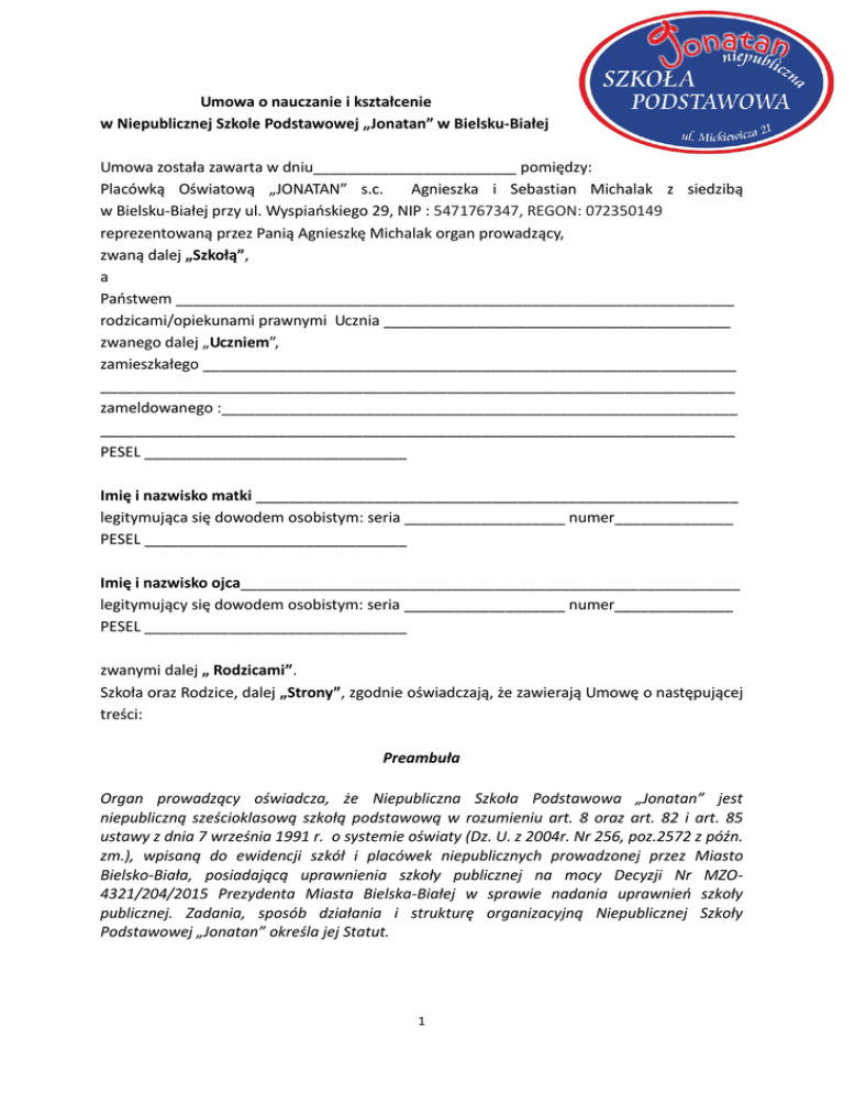 Umowa o nauczanie i kształcenie w Niepublicznej Szkole Podstawowej „Jonatan” w Bielsku-Białej Umowa została zawarta w dniu________________________ pomiędzy: Placówką Oświatową „JONATAN” s.c. Agnieszka i Sebastian Michalak z siedzibą w Bielsku-Białej przy ul. Wyspiaoskiego 29, NIP : 5471767347, REGON: 072350149 reprezentowaną przez Panią Agnieszkę Michalak organ prowadzący, zwaną dalej „Szkołą”, a Paostwem __________________________________________________________________ rodzicami/opiekunami prawnymi Ucznia _________________________________________ zwanego dalej „Uczniem”, zamieszkałego _______________________________________________________________ ___________________________________________________________________________ zameldowanego :_____________________________________________________________ ___________________________________________________________________________ PESEL _______________________________ Imię i nazwisko matki _________________________________________________________ legitymująca się dowodem osobistym: seria ___________________ numer______________ PESEL _______________________________ Imię i nazwisko ojca___________________________________________________________ legitymujący się dowodem osobistym: seria ___________________ numer______________ PESEL _______________________________ zwanymi dalej „ Rodzicami”. Szkoła oraz Rodzice, dalej „Strony”, zgodnie oświadczają, że zawierają Umowę o następującej treści: Preambuła Organ prowadzący oświadcza, że Niepubliczna Szkoła Podstawowa „Jonatan” jest niepubliczną sześcioklasową szkołą podstawową w rozumieniu art. 8 oraz art. 82 i art. 85 ustawy z dnia 7 września 1991 r. o systemie oświaty (Dz. U. z 2004r. Nr 256, poz.2572 z późn. zm.), wpisaną do ewidencji szkół i placówek niepublicznych prowadzonej przez Miasto Bielsko-Biała, posiadającą uprawnienia szkoły publicznej na mocy Decyzji Nr MZO4321/204/2015 Prezydenta Miasta Bielska-Białej w sprawie nadania uprawnieo szkoły publicznej. Zadania, sposób działania i strukturę organizacyjną Niepublicznej Szkoły Podstawowej „Jonatan” określa jej Statut. 1 §1 1. Na mocy niniejszej umowy Rodzice zlecają, a Szkoła przyjmuje zlecenie świadczenia na rzecz Ucznia usług dydaktyczno-wychowawczych i kształcenia w Niepublicznej Szkole Podstawowej Jonatan z/s w Bielsku-Białej przy ul. A. Mickiewicza 21, począwszy od roku szkolnego 2015/2016. 2. Szkoła zobowiązana jest do wykonywania niniejszej umowy z należytą starannością i najwyższą dbałością o dobro Ucznia. §2 1. Szkoła zobowiązuje się do świadczenia na rzecz Ucznia usług edukacyjnych oraz innych opisanych w niniejszej umowie świadczeo z uwzględnieniem minimum programowego określonego dla publicznych szkół podstawowych przez ministra właściwego do spraw edukacji. 2. Szkoła zapewnia, iż liczebnośd klas nie przekroczy 14 Uczniów w jednej klasie. 3. W ramach opłaty z tytułu czesnego Szkoła zapewnia : a) trening pamięci i koncentracji uwagi na licencji Szkoły Pamięci Wojakowskich; b) dodatkowe godziny języka angielskiego; c) drugi dodatkowy język nowożytny; d) wybrane koła zainteresowao. 4. Szkoła zobowiązuje się do zapewnienia opieki nad uczniem w godz. 7.00–16.30 oraz świadczenia następujących dodatkowych usług określonych w odrębnym dokumencie. 1. 2. 3. 4. §3 Zakres świadczonych przez Szkołę usług w ramach czesnego nie obejmuje: 1) wyprawki szkolnej i podręczników; 2) zakupu mundurka; 3) wycieczek szkolnych; 4) wycieczek zagranicznych, w przypadku podjęcia decyzji o ich organizacji; 5) wyjazdów na zieloną szkołę i zimowiska w przypadku podjęcia decyzji o ich organizacji. 6) pozostałe zajęcia pozalekcyjne. Rodzice zobowiązani są do wykupienia dla Ucznia określonego przez Szkołę stroju szkolnego, obowiązującego w Niepublicznej Szkole Podstawowej „Jonatan”. Pozostałe zajęcia pozalekcyjne oferowane przez Szkołę lub proponowane przez Rodziców mogą byd świadczone na mocy odrębnej umowy Rodziców ze Szkołą lub podmiotem realizującym zajęcia za zgodą Szkoły. W przypadku dzieci posiadających Orzeczenie o potrzebie kształcenia specjalnego szkoła zapewnia bezpłatne zajęcia rewalidacyjne, zgodnie z Rozporządzeniem Ministra Edukacji 2 Narodowej w sprawie warunków organizowania kształcenia, wychowania i opieki dla dzieci i młodzieży niepełnosprawnych oraz niedostosowanych społecznie w specjalnych przedszkolach, szkołach i oddziałach oraz ośrodkach z dnia 17 listopada 2010 r. (Dz. U. Nr 228, poz. 1489). §4 1. W ramach niniejszej umowy Rodzice zobowiązują się do: 1) terminowej zapłaty czesnego i innych opłat należnych Szkole; 2) zapewnienia regularnego uczęszczania Ucznia na zajęcia prowadzone przez Szkołę; 3) zapewnienia Uczniowi warunków umożliwiających przygotowywanie się do zajęd celem wypełniania obowiązku szkolnego; 4) przestrzegania Statutu, w tym w zakresie dotyczącym praw i obowiązków Rodziców oraz innych obowiązujących regulacji wewnętrznych. 2. Rodzice zobowiązują się do zapłaty na rzecz Szkoły w pierwszym roku nauki Ucznia jednorazowej opłaty stałej (tzw. opłaty wpisowej) w wysokości 500,00 zł, płatnej w ciągu 7 dni, licząc od dnia następującego po dniu podpisania niniejszej Umowy. 3. Opłata wpisowa obejmuje zryczałtowane koszty przygotowania stanowiska pracy Ucznia. 4. Czesne w wysokości 500,00 zł płatne jest z góry za każdy miesiąc w terminie do ósmego dnia każdego miesiąca poprzedzającego miesiąc, za który czesne jest należne, przez cały okres trwania umowy z zastrzeżeniem pkt. 5 niniejszego paragrafu. 5. Zwolnieni z miesięcznych opłat z tytułu czesnego oraz opłaty wpisowej są Uczniowie dla których wydane zostało orzeczenie o potrzebie kształcenia specjalnego, tym samym rozliczenie za pobyt Ucznia w Szkole dokonywane będzie na podstawie odrębnych przepisów. 6. Opłatę i 