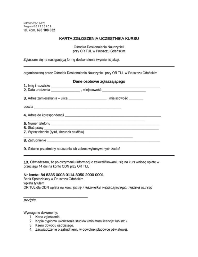 NIP 593-23-0 9-276 Re g o n 0 0 1 2 3 8 4 5 9 tel. kom. 698 108 032 KARTA ZGŁOSZENIA UCZESTNIKA KURSU Ośrodka Doskonalenia Nauczycieli przy OR TUL w Pruszczu Gdańskim Zgłaszam się na następującą formę doskonalenia (wymienić jaką): organizowaną przez Ośrodek Doskonalenia Nauczycieli przy OR TUL w Pruszczu Gdańskim Dane osobowe zgłaszającego 1. Imię i nazwisko ____________________________________________________________ 2. Data urodzenia ________________ , miejscowość ________________________ 3. Adres zamieszkania – ulica _____________________ , miejscowość ________ poczta ________________________________________________ 4. Adres do korespondencji _____________________________________________________ ___________________________________________________________________ 5. Numer telefonu ____________________________________________________________ 6. Staż pracy _______________________________________________________________ 7. Wykształcenie (tytuł, kierunek studiów) ____________________________________________________________ 8. Zatrudnienie ______________________________________________________________ 9. Główne przedmioty nauczania lub zakres wykonywanych zadań 10. Oświadczam, że po otrzymaniu informacji o zakwalifikowaniu się na kurs wniosę opłatę w przeciągu 14 dni na konto ODN przy OR TUL Nr konta: 84 8335 0003 0114 8050 2000 0001 Bank Spółdzielczy w Pruszczu Gdańskim wpłata tytułem: OR TUL dla ODN wpłata na kurs: (imię i nazwisko wpłacającego, nazwa kursu) _____________________________ podpis Wymagane dokumenty: 1. Karta zgłoszenia. 2. Kopia dyplomu ukończenia studiów (minimum licencjat lub inż.) 3. Ksero dowodu osobistego. 4. Zaświadczenie o zatrudnieniu w dowolnej placówce oświatowej.
