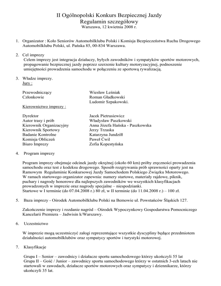 II Ogólnopolski Konkurs Bezpiecznej Jazdy Regulamin szczegółowy Warszawa, 12 kwietnia 2008 r. 1. Organizator : Koło Seniorów Automobilklubu Polski i Komisja Bezpieczeństwa Ruchu Drogowego Automobilklubu Polski, ul. Pańska 85, 00-834 Warszawa. 2. Cel imprezy Celem imprezy jest integracja działaczy, byłych zawodników i sympatyków sportów motorowych, propagowanie bezpiecznej jazdy poprzez szerzenie kultury motoryzacyjnej, podnoszenie umiejętności prowadzenia samochodu w połączeniu ze sportową rywalizacją. 3. Władze imprezy. Jury : Przewodniczący Członkowie Wiesław Leśniak Roman Gładkowski Ludomir Szpakowski. Kierownictwo imprezy : Dyrektor Autor trasy i prób Kierownik Organizacyjny Kierownik Sportowy Badanie Kontrolne Komisja Obliczeń Biuro Imprezy 4. Jacek Pietrusiewicz Władysław Paszkowski Anna Józefa Hańska - Paszkowska Jerzy Trzaska Katarzyna Jundziłł Paweł Ćwil Zofia Kopestyńska Program imprezy Program imprezy obejmuje odcinek jazdy okrężnej (około 60 km) próby zręczności prowadzenia samochodu oraz test z kodeksu drogowego. Sposób rozgrywania prób sprawności oparty jest na Ramowym Regulaminie Konkursowej Jazdy Samochodem Polskiego Związku Motorowego. W ramach startowego organizator zapewnia: numery startowe, materiały rajdowe, piknik, puchary i nagrody honorowe dla najlepszych zawodników we wszystkich klasyfikacjach prowadzonych w imprezie oraz nagrody specjalne – niespodzianki. Startowe w I terminie (do 07.04.2008 r.) 80 zł, w II terminie (do 11.04.2008 r.) – 100 zł. 5. Baza imprezy - Ośrodek Automobilklubu Polski na Bemowie ul. Powstańców Śląskich 127. Zakończenie imprezy i rozdanie nagród – Ośrodek Wypoczynkowy Gospodarstwa Pomocniczego Kancelarii Premiera – Jadwisin k/Warszawy. 6. Uczestnictwo W imprezie mogą uczestniczyć załogi reprezentujące wszystkie dyscypliny będące przedmiotem działalności automobilklubów oraz sympatycy sportów i turystyki motorowej. 7. Klasyfikacje Grupa I – Senior – zawodnicy i działacze sportu samochodowego którzy ukończyli 55 lat Grupa II – Gość / Junior – zawodnicy sportu samochodowego którzy w ostatnich 3-ech latach nie startowali w zawodach, działacze sportów motorowych oraz sympatycy i dziennikarze, którzy ukończyli 35 lat. Seniorzy – w klasach i klasyfikacji generalnej – wyniki przeliczane zgodnie z grupą wiekową jak niżej : uzyskany czas jest weryfikowany wg współczynnika wyrównawczego: 0,90 oraz dodatkowo wiek : 55-59: 0,98; 60-64: 0,95; 65-69: 0,92; 70-74: 0,89; 75-79: 0,86; >80: 0,83. Uczestnicy rywalizują w trzech klasach i klasyfikacji generalnej. Klasa 1 – do 1400 ccm, Klasa 2 – 1401 – 1800 ccm, Klasa 3 powyżej 1801 ccm (dotyczy tylko seniorów), oraz w klasyfikacji zespołowej – punkty z klasyfikacji generalnej 2 załóg z 3 zgłoszonych. Kierowcy amatorzy, sympatycy, pojazdy zabytkowe i uczestniczki Pucharu Pań rywalizują tylko w klasyfikacji generalnej. Pojazdy dopuszczone do imprezy muszą spełniać warunki dopuszczenia do ruchu, posiadać ważne dowody rejestracyjne i ubezpieczenia NW i OC. Podczas odbywania prób sprawności uczestnicy OBOWIĄZANI są używać kasków ochronnych (zalecane kaski używane do sportu samochodowego). Przed startem do imprezy odbędzie się obowiązkowe badanie kontrolne według kryteriów KJS. Punktacja imprezy : - za każdą minutę wcześniejszego lub późniejszego wjazdu na PKC - brak wizy PKC - ominięcie PKP - test z Kodeksu Drogowego za błędną odpowiedź 8. - 1 pkt. karny - 20 pkt. - 20 pkt. - 1 pkt. Harmonogram imprezy : 12.04.2008 r godz. 9.30 otwarcie biura imprezy Ośrodek AP Bemowo godz. 9.45 powitanie i odprawa uczestników Ośrodek AP Bemowo godz.10.00 Badanie Kontrolne Ośrodek AP Bemowo godz.11.00 start pierwszej załogi Ośrodek AP Bemowo godz.14.30 meta pierwszej załogi Ośrodek Wypoczynkowy Jadwisin Ośrodek Wypoczynkowy Jadwisin Ośrodek Wypoczynkowy Jadwisin Ośrodek Wypoczynkowy Jadwisin godz.16.00 próba pałacowa godz.17.30 wyniki prowizoryczne godz.18.15 wyniki oficjalne, rozdanie nagród i zakończenie imprezy. Organizator Koło Seniorów Automobilklubu Polski