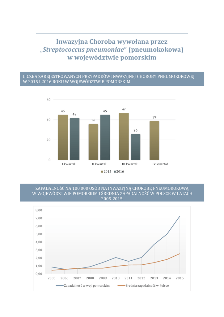 Inwazyjna Choroba wywołana przez „Streptococcus pneumoniae” (pneumokokowa) w województwie pomorskim LICZBA ZAREJESTROWANYCH PRZYPADKOW INWAZYJNEJ CHOROBY PNEUMOKOKOWEJ W 2015 I 2016 ROKU W WOJEWODZTWIE POMORSKIM 60 45 40 47 45 42 39 36 26 20 0 I kwartał II kwartał 2015 III kwartał IV kwartał 2016 ZAPADALNOSC NA 100 000 OSOB NA INWAZYJNĄ CHOROBĘ PNEUMOKOKOWĄ W WOJEWODZTWIE POMORSKIM I SREDNIA ZAPADALNOSC W POLSCE W LATACH 2005-2015 8,00 7,00 6,00 5,00 4,00 3,00 2,00 1,00 0,00 2005 2006 2007 2008 2009 Zapadalność w woj. pomorskim 2010 2011 2012 2013 2014 Średnia zapadalność w Polsce 2015 2005 2006 2007 2008 2009 2010 2011 2012 2013 2014 2015 Zapadalnosc w woj. pomorskim Srednia zapadalnosc w Polsce 0,86 0,59 0,63 0,90 1,44 2,06 3,71 2,06 3,71 5,00 7,25 0,46 0,56 0,71 0,72 0,72 0,95 1,12 1,13 1,42 1,82 2,54 LICZBA PRZYPADKOW (P) ORAZ ZAPADALNOSC (Z) NA 100 000 OSOB NA INWAZYJNĄ CHOROBĘ PNEUMOKOKOWĄ W LATACH 2012-2016 W POWIATACH WOJ. POMORSKIEGO Strona 2 LICZBA ZACHOROWAN NA INWAZJNĄ CHOROBĘ PNEUMOKOKOWĄ W GRUPACH WIEKOWYCHW 2016 W WOJEWODZTWIE POMORSKIM 60 54 50 43 37 40 30 20 10 15 7 2 3 5 0 0 do 4 od 5 do 19 od 20 do od 30 do od 40 do od 50 do od 60 do 70 i 29 39 49 59 69 powyżej Najwięcej zachorowan występowało w starszych grupach wiekowych, najmniej wsrod osob w wieku od 5 do 39 roku zycia SMIERTELNOSC W 2015 r. 37 zachorowan zakonczyło się zgonem, co stanowi 22 % wszystkich zgłoszonych przypadkow pneumokokowych zakazen inwazyjnych. Zgony dotyczyły głownie osob w starszym wieku. Najmłodsza osoba miała 43 lata. ZAPOBIEGANIE Najlepszą metodą profilaktyczną są szczepienia. W Polsce dostępne są dwa typy szczepionek przeciw pneumokokom: - szczepionki skoniugowane 10 lub 13 – walentne (skuteczne przeciwko 10 bądz 13 najpowszechniej występującym serotypom). Szczepionka trzynastowalentna jest przeznaczona dla dzieci od 6 tygodnia zycia oraz dorosłych. Cykl szczepienia jest rozny w zaleznosci od wieku obejmując rozną liczbę dawek - od 4 u dzieci od 6 tygodnia do 6 miesiąca, poprzez 3 dawki u dzieci między 7 a 11 miesiącem zycia, 2 dawki u dzieci między 12 a 23 miesiącem zycia, az do 1 dawki u dzieci starszych, młodziezy i dorosłych - szczepionki polisacharydowe wskazane dla chorych z przewlekłymi chorobami układu oddechowego, krązenia, wątroby, cukrzycą, astmą i alkoholizmem. Szczepionka ta podawana jest w jednej dawce. Strona 3